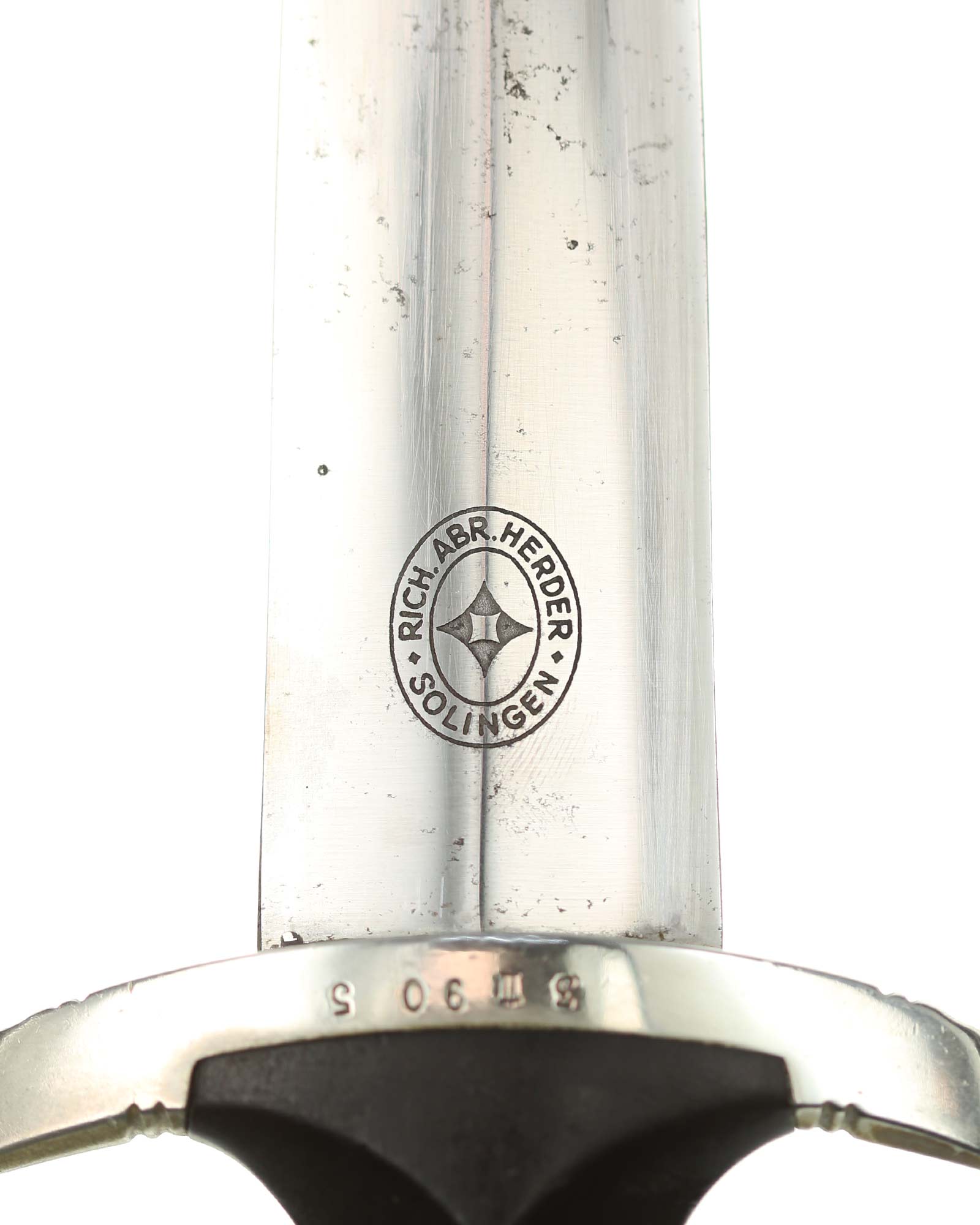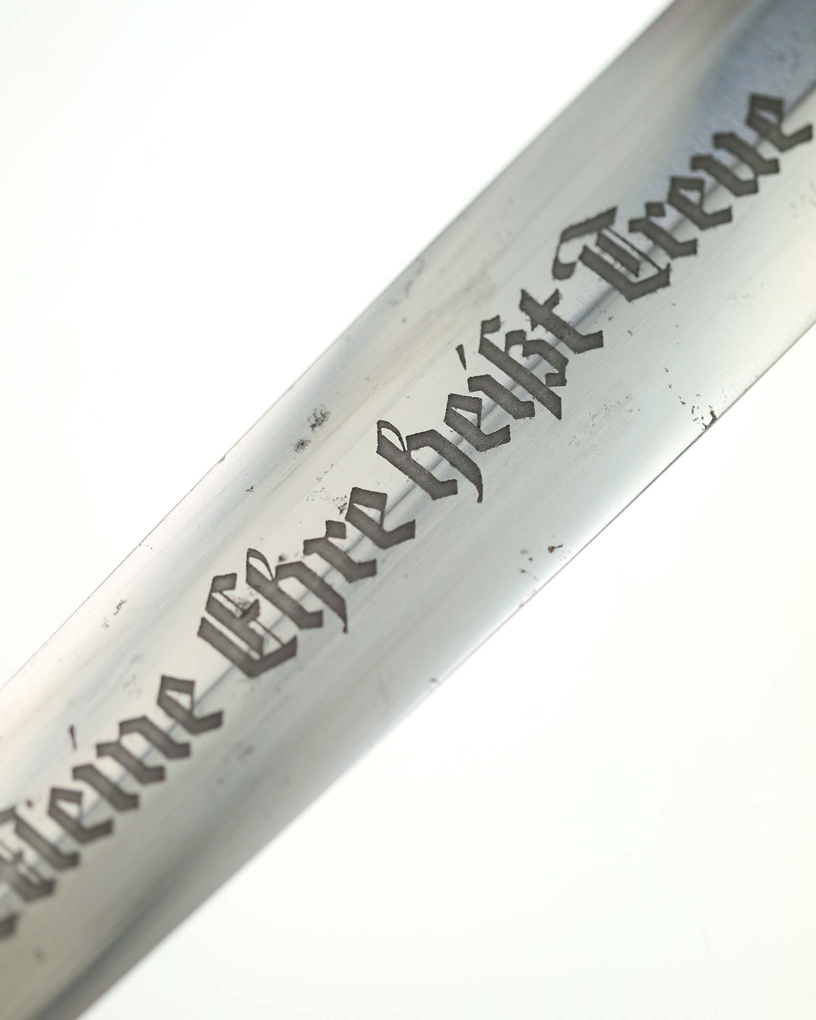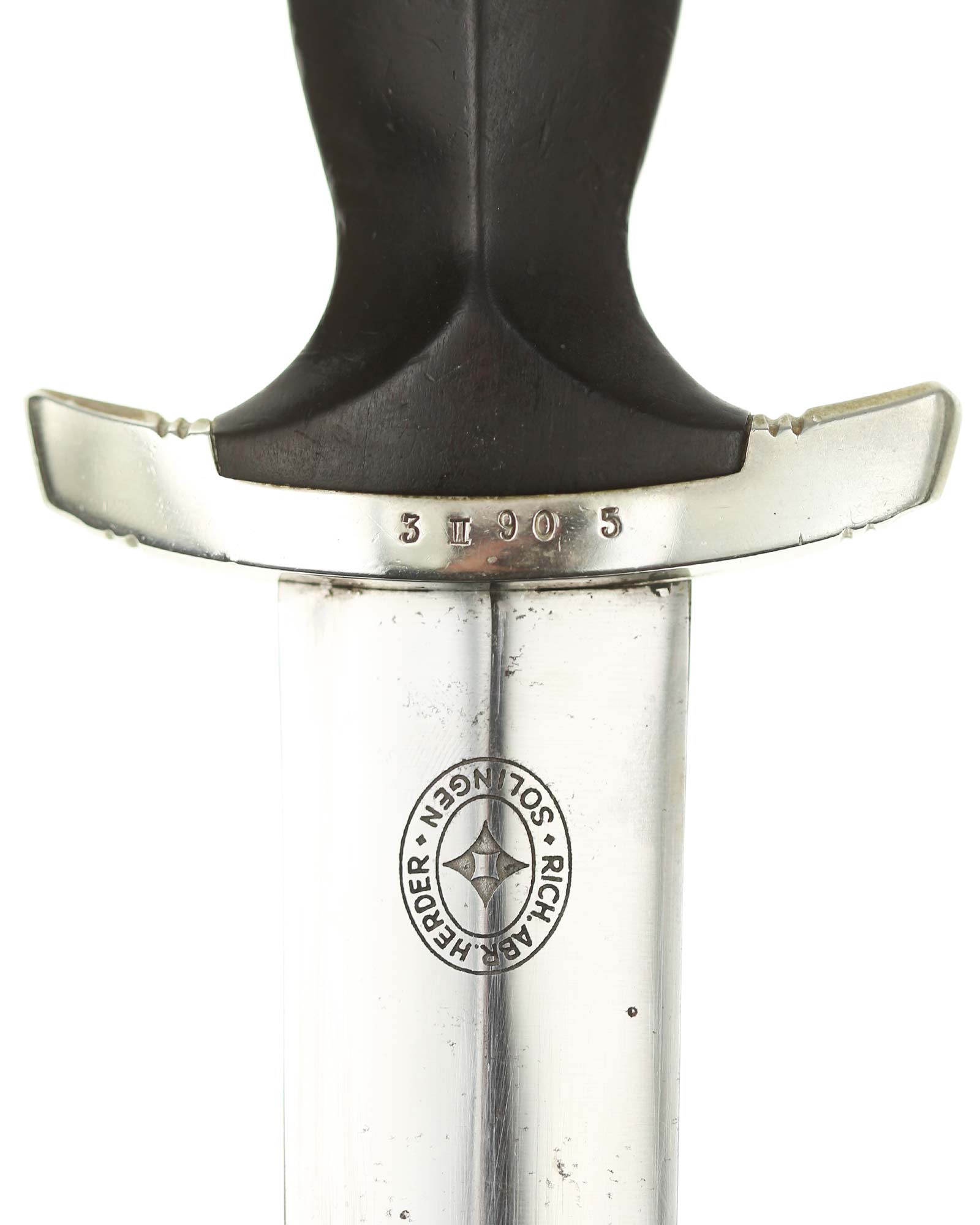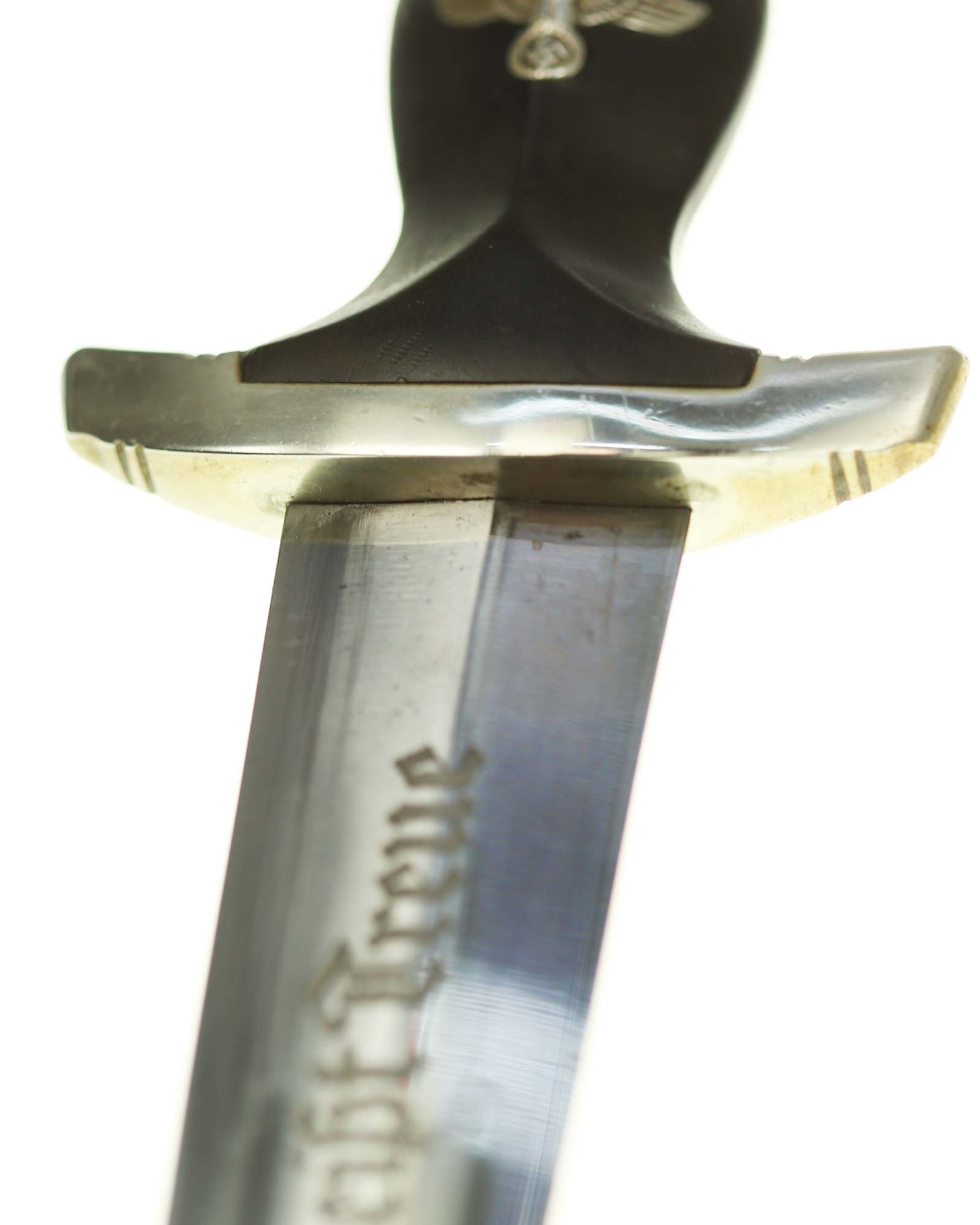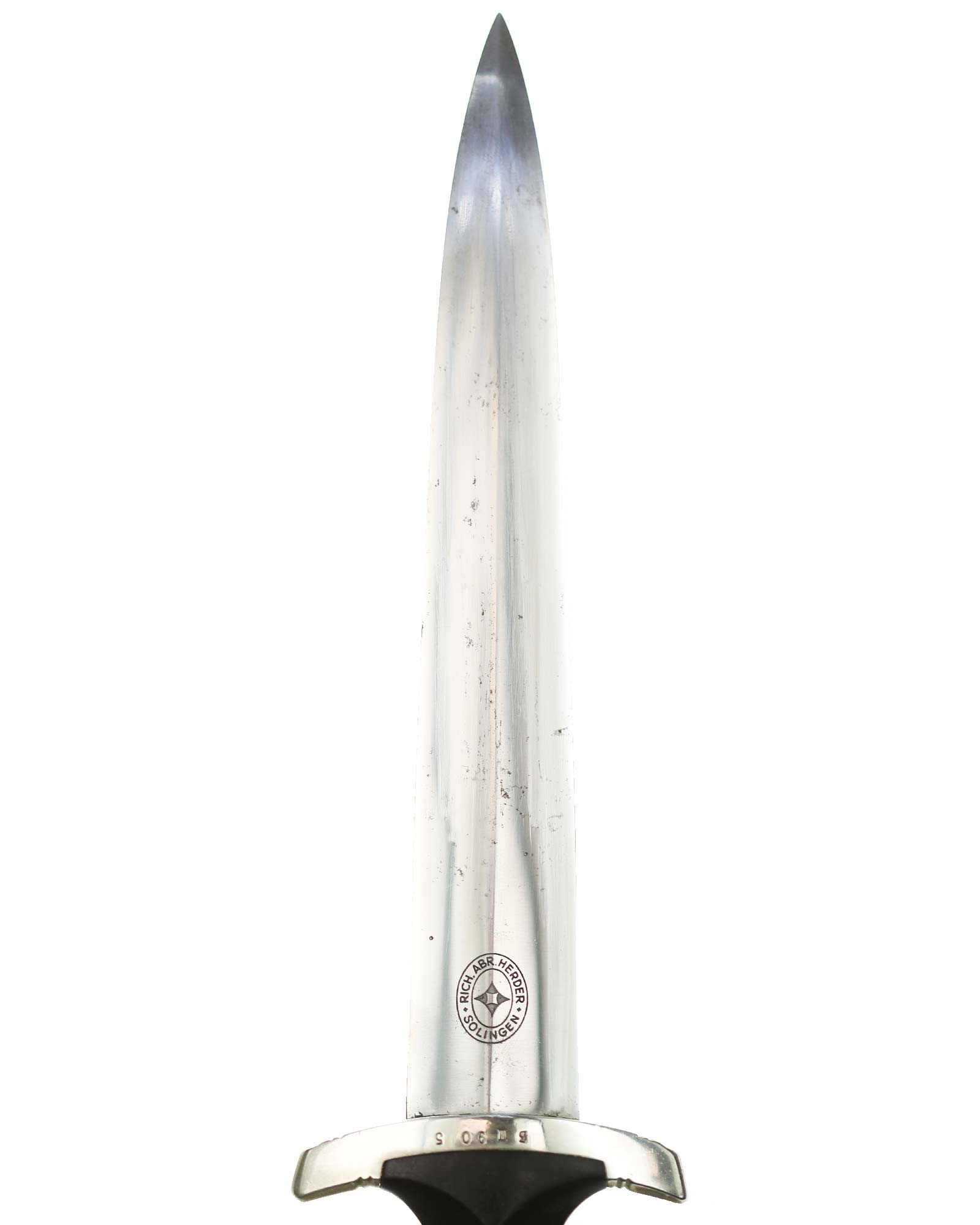 Клинок: Клинок кинжала прямой, стальной, двулезвийный, кинжального типа, с выраженным центральным ребром. На одной стороне клинка методом травления нанесен девиз СС «Meine Ehre heisst Treue» (Моя честь называется верностью). Клинок на оборотной стороне у основания стоит клеймо производителя Rich. Abr. Herder Solingen (Рихард А. Хердер Золинген).