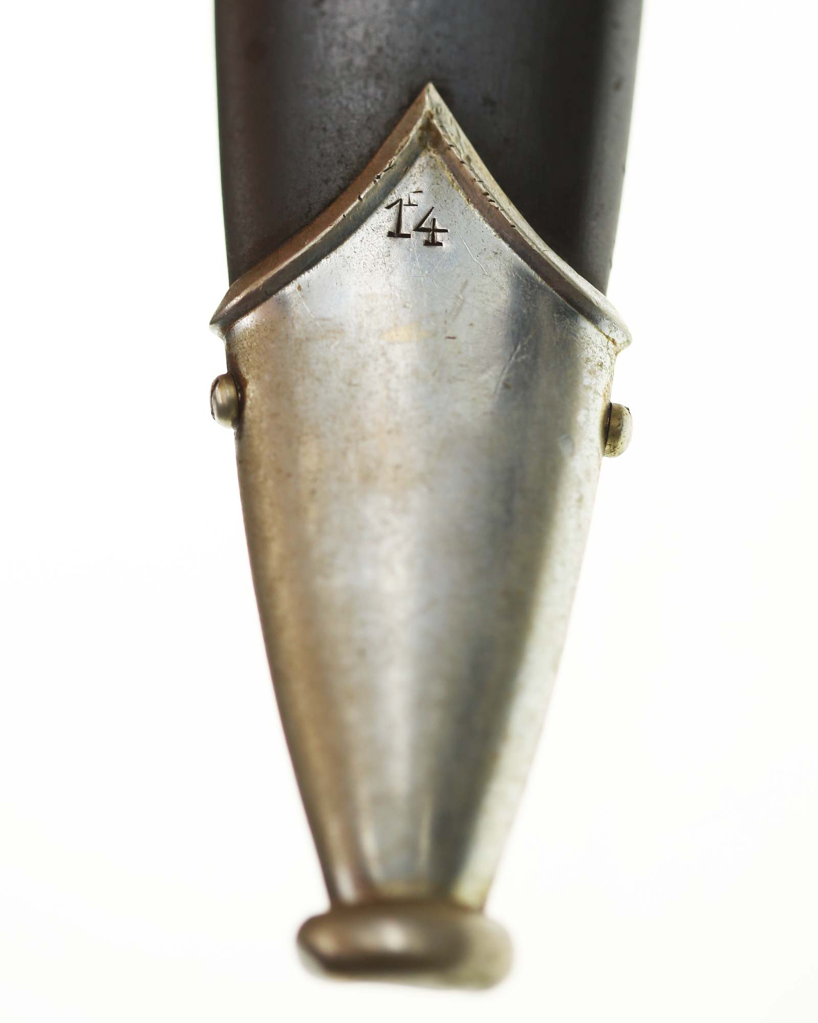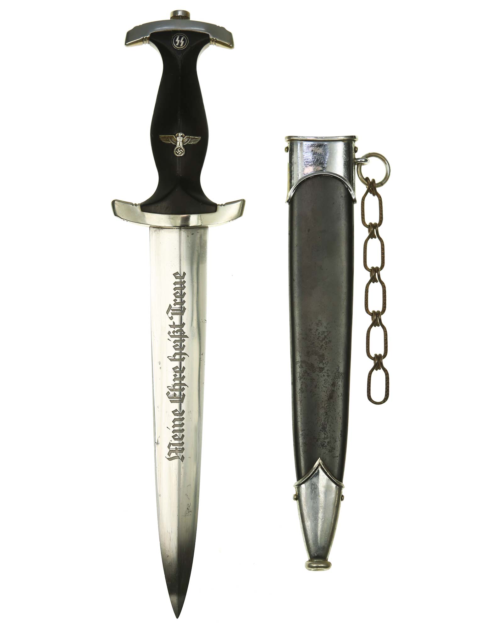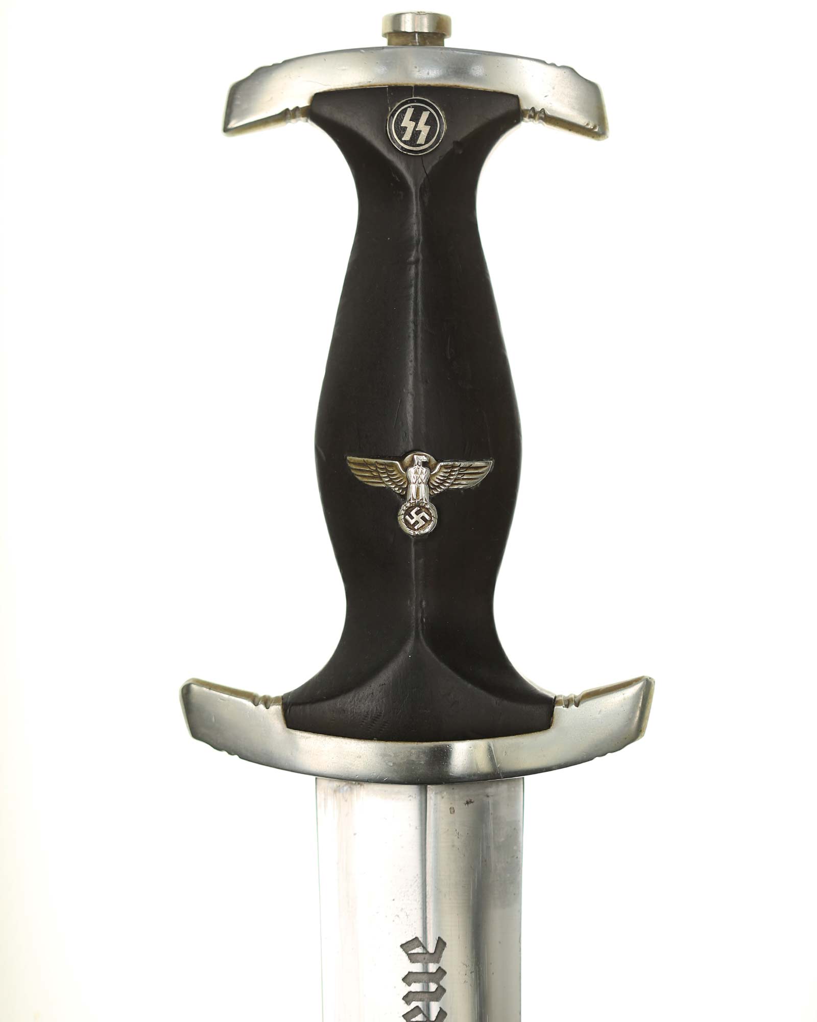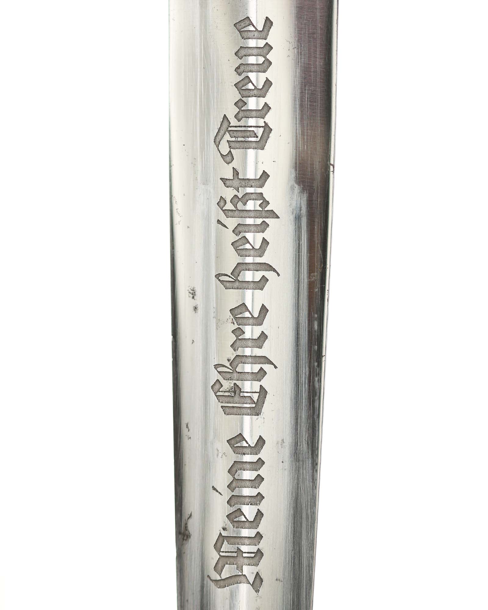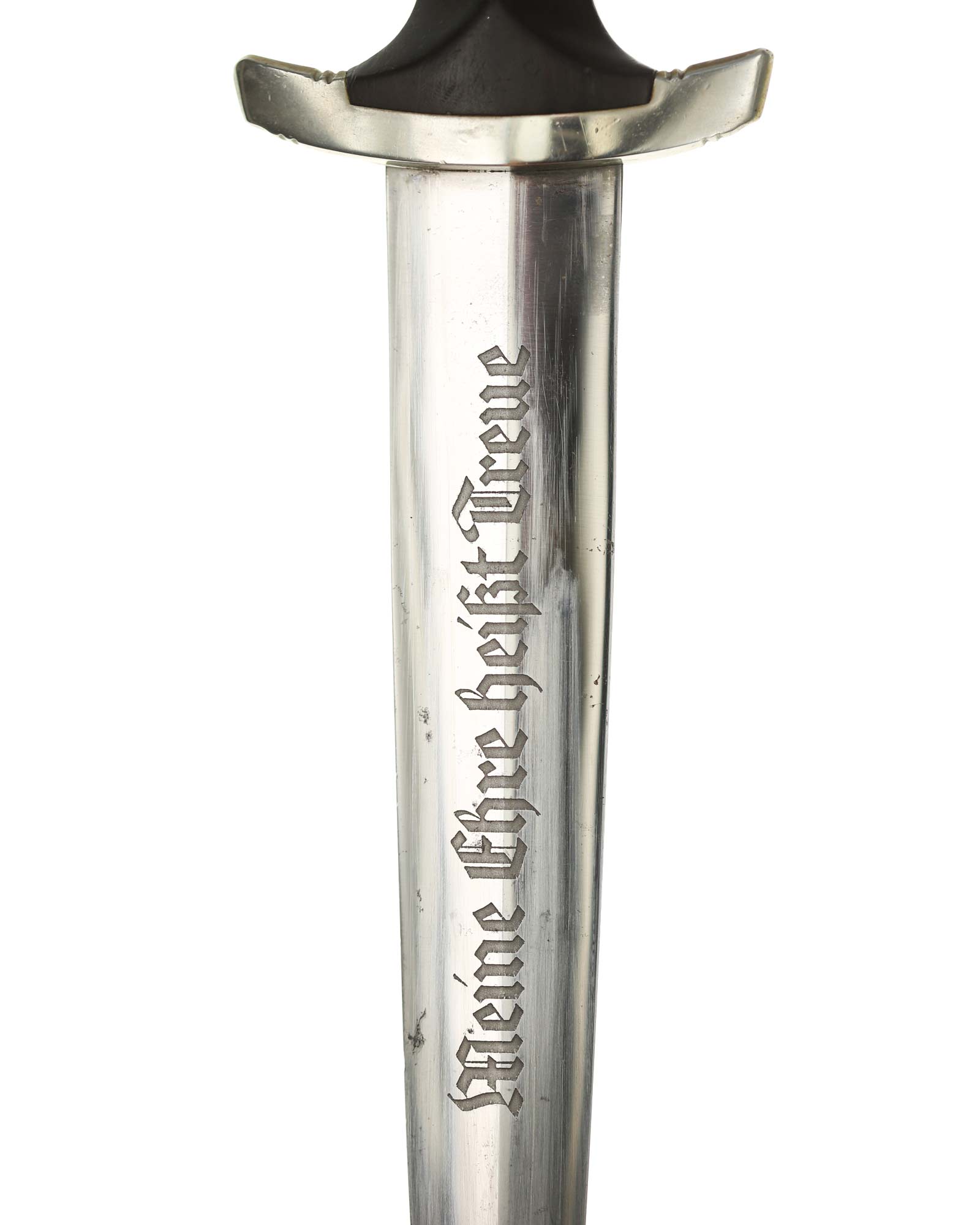 Клинок: Клинок кинжала прямой, стальной, двулезвийный, кинжального типа, с выраженным центральным ребром. На одной стороне клинка методом травления нанесен девиз СС «Meine Ehre heisst Treue» (Моя честь называется верностью). Клинок на оборотной стороне у основания стоит клеймо производителя Rich. Abr. Herder Solingen (Рихард А. Хердер Золинген).
