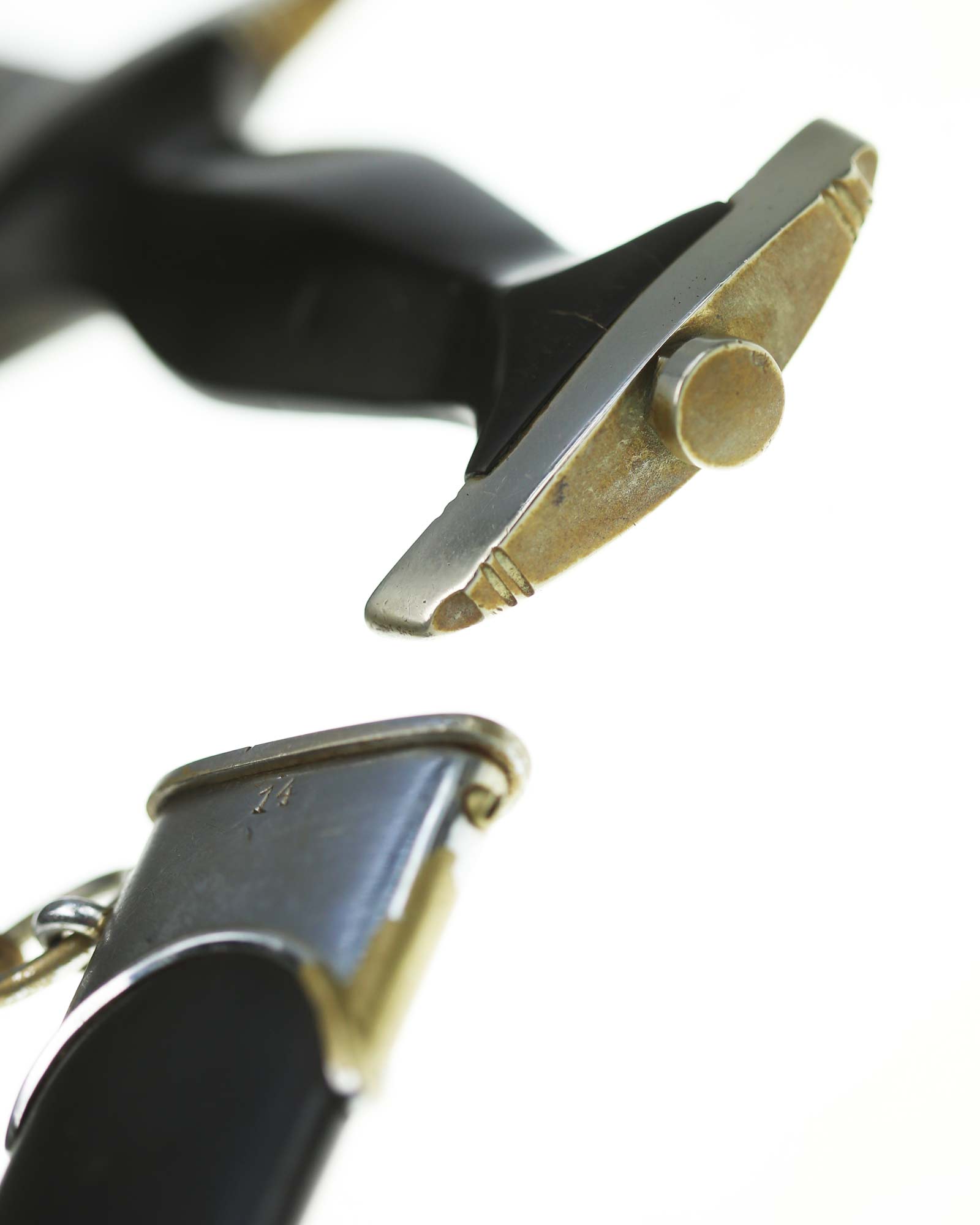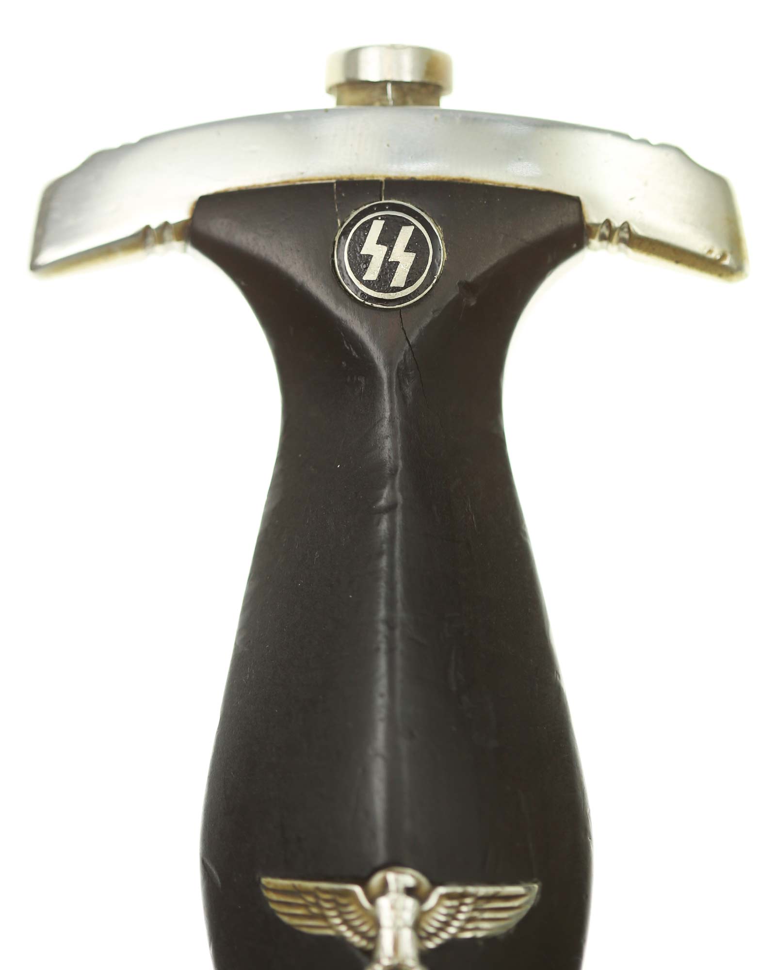 Рукоять: Рукоять из мореного в черный цвет дерева. Рукоять в верхней части имеет вставку в виде черного эмалевого глазка с рунами, в средней части рукояти – металлический знак в виде стилизованного изображения раскинувшего крылья орла, держащего в когтях венок со свастикой. Металлические элементы гарды изготовлены из мельхиора. Крестовина С-образная, белого металла, с концами, чуть загнутыми вверх, в несколько увеличенном и перевернутом виде копирует навершие рукояти - "II" [Дрезден].