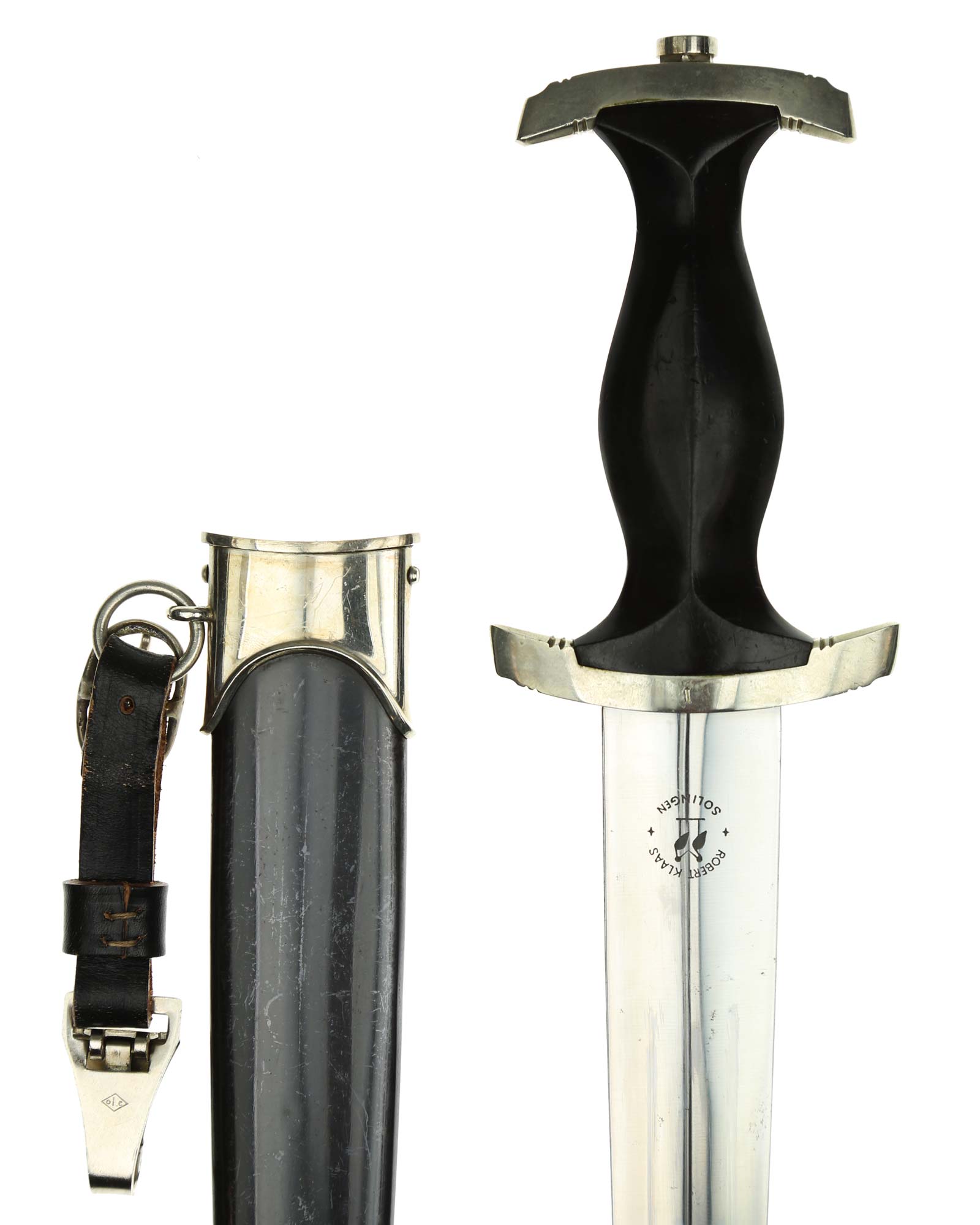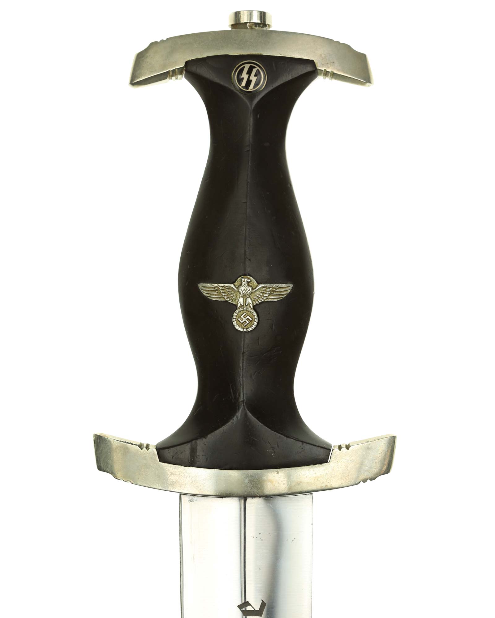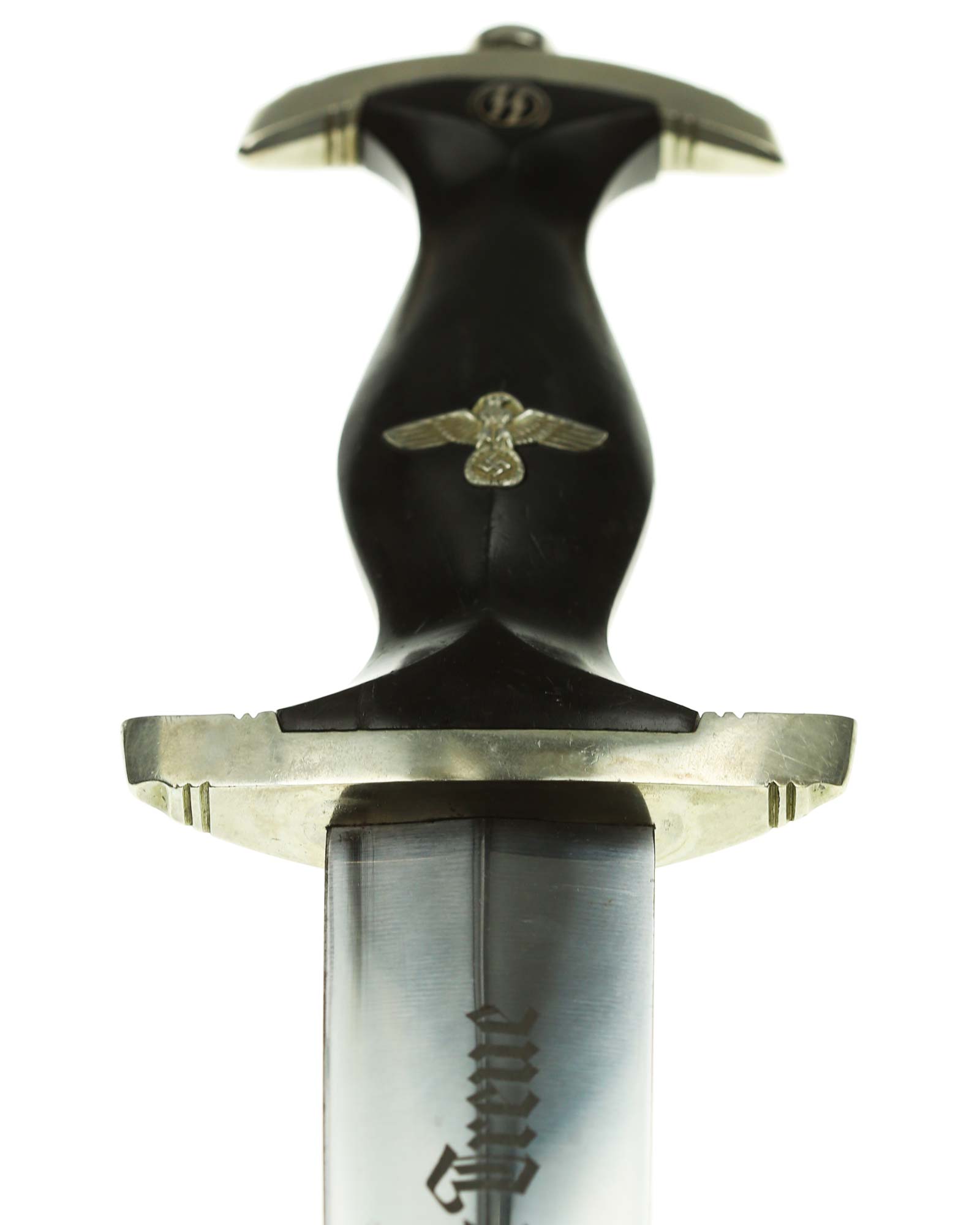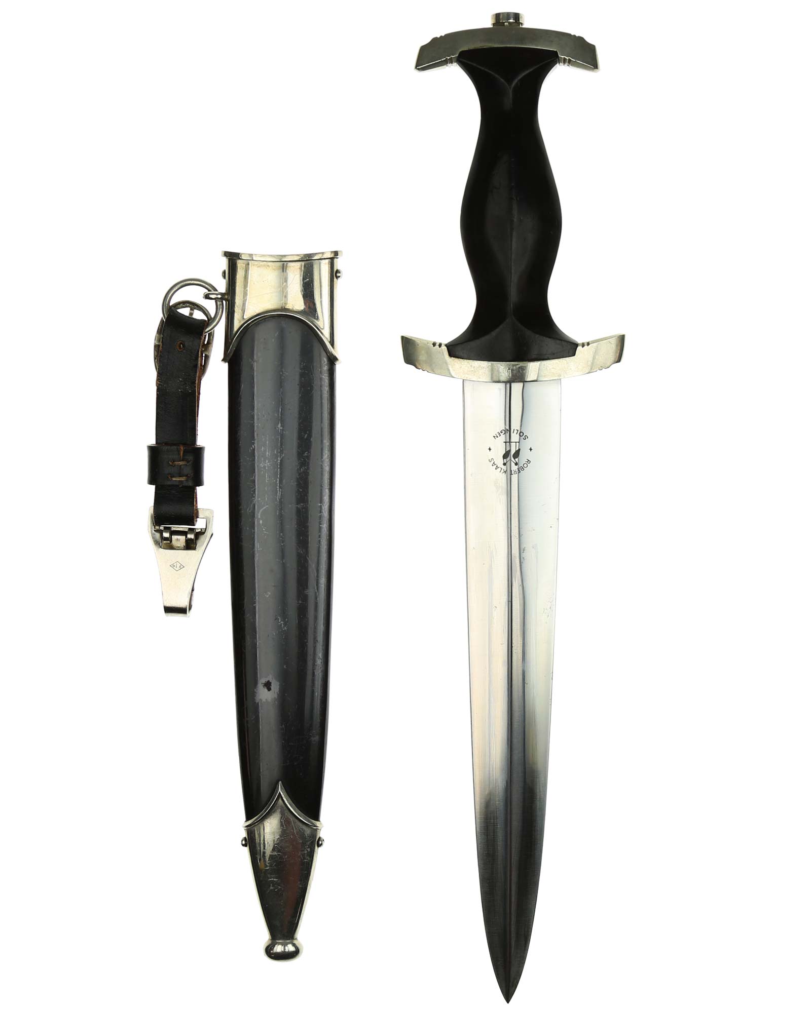 Клинок: Клинок кинжала прямой, стальной, двулезвийный, кинжального типа, с выраженным центральным ребром. На одной стороне клинка методом травления нанесен девиз СС «Meine Ehre heisst Treue» (Моя честь называется верностью). Клинок на оборотной стороне у основания стоит клеймо производителя Robert Klaas Solingen (Клаас Роберт Золинген).