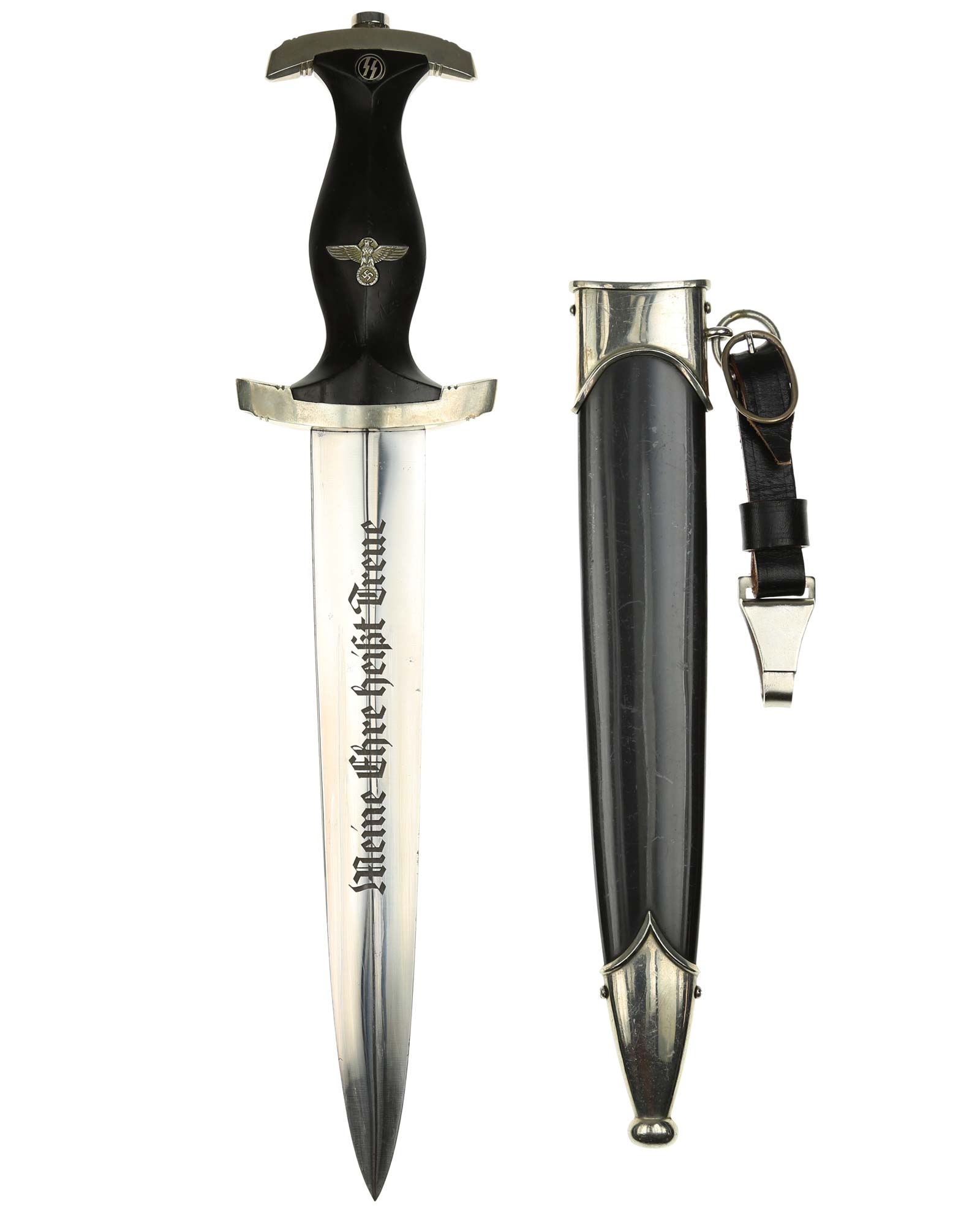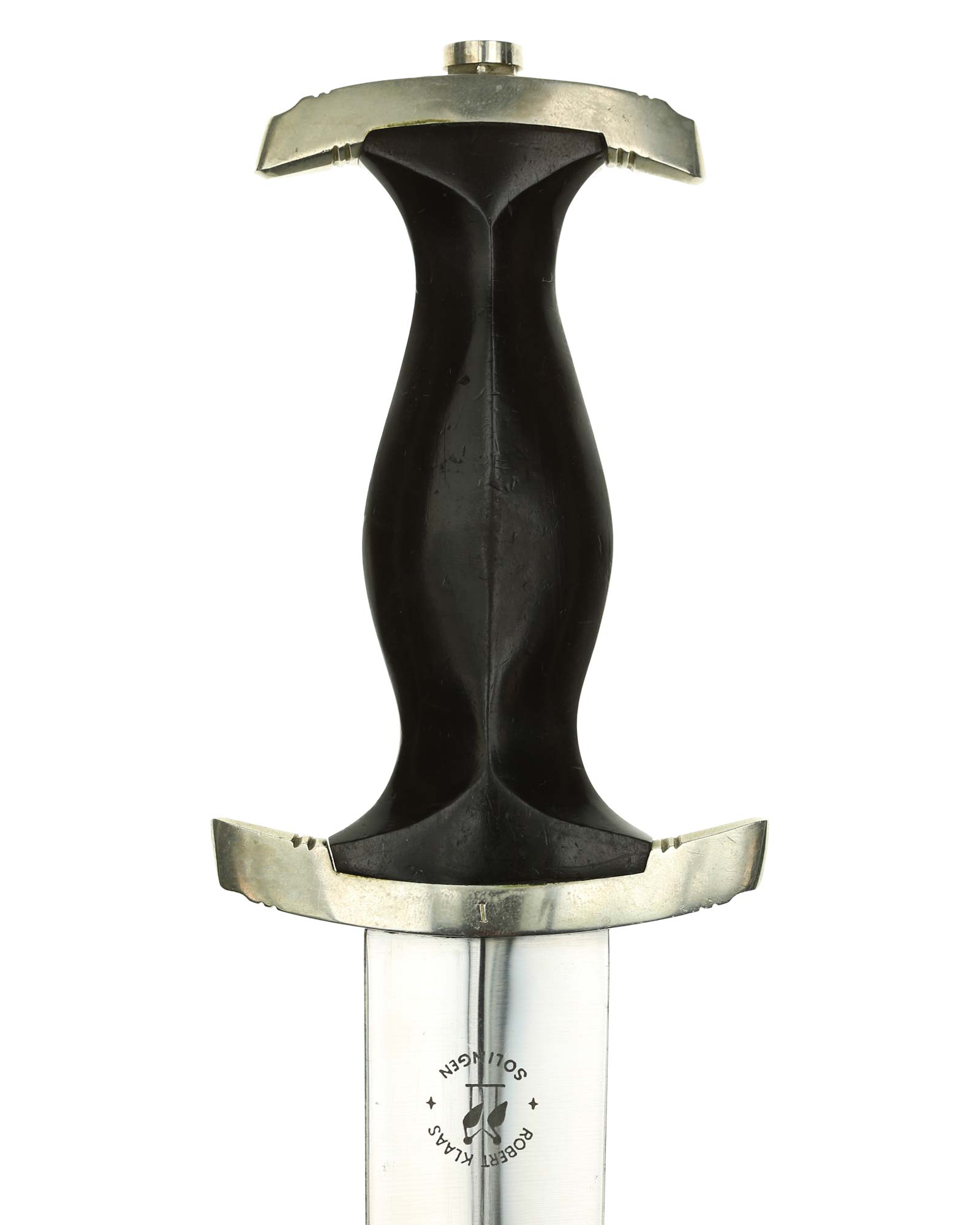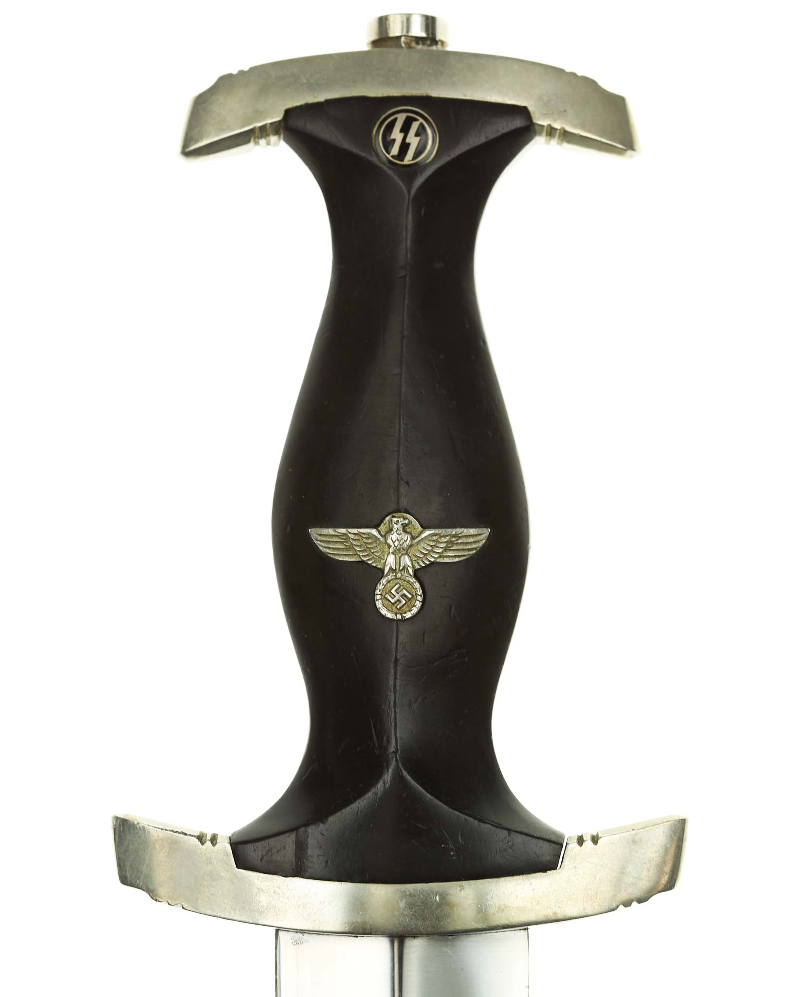 Клинок: Клинок кинжала прямой, стальной, двулезвийный, кинжального типа, с выраженным центральным ребром. На одной стороне клинка методом травления нанесен девиз СС «Meine Ehre heisst Treue» (Моя честь называется верностью). Клинок на оборотной стороне у основания стоит клеймо производителя Robert Klaas Solingen (Клаас Роберт Золинген).