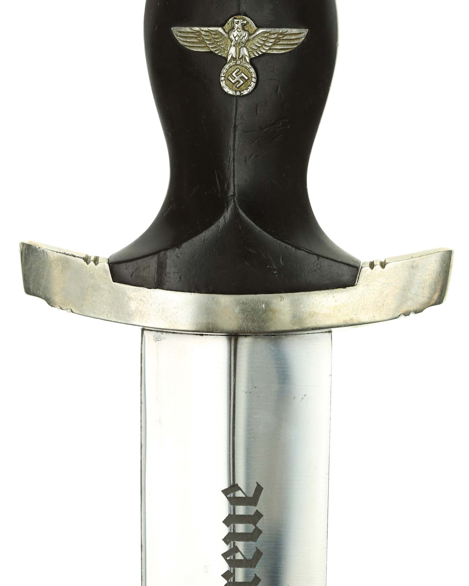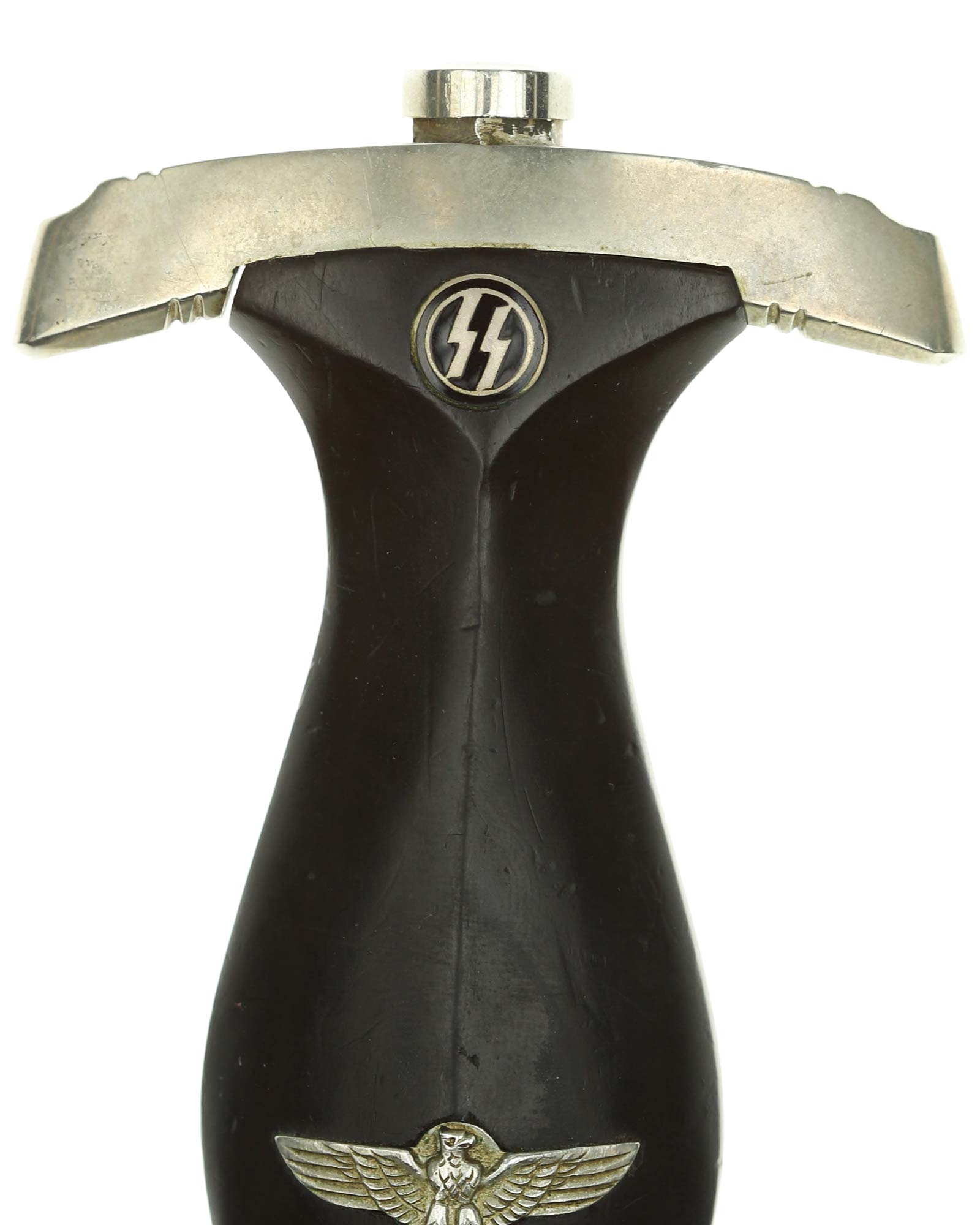 Рукоять: Рукоять из мореного в черный цвет дерева. Рукоять в верхней части имеет вставку в виде черного эмалевого глазка с рунами, в средней части рукояти – металлический знак в виде стилизованного изображения раскинувшего крылья орла, держащего в когтях венок со свастикой. Металлические элементы гарды изготовлены из мельхиора. Крестовина С-образная, белого металла, с концами, чуть загнутыми вверх, в несколько увеличенном и перевернутом виде копирует навершие рукояти - "I" [Мюнхен].