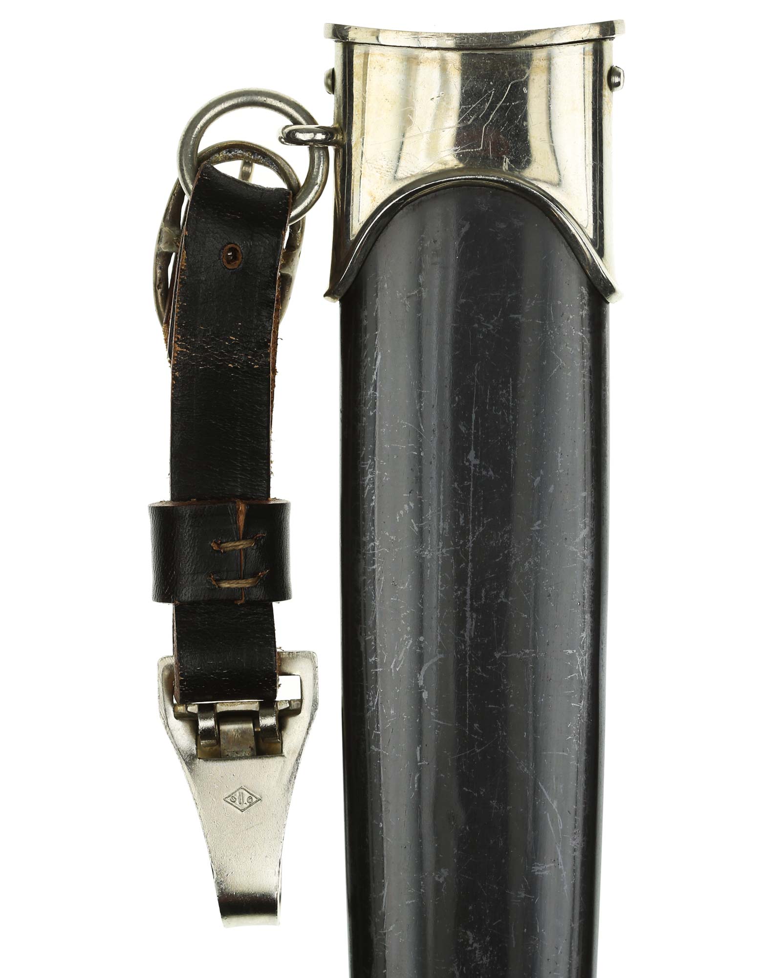 Ножны: Ножны металлические. Прибор ножен изготовлен из белого металла и состоит из устья с гайкой и кольцом для подвешивания га ремень и устья с шариком.