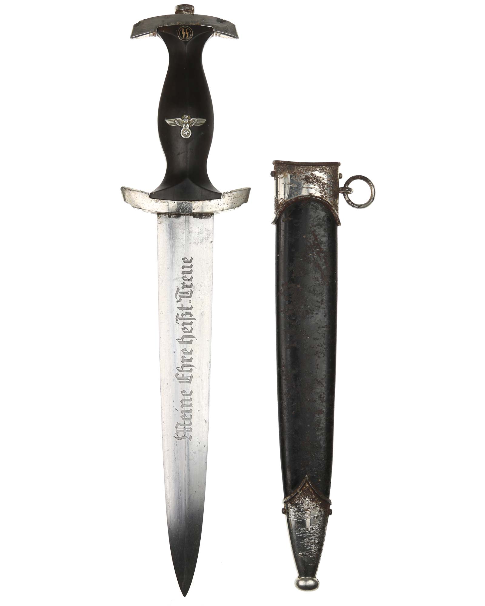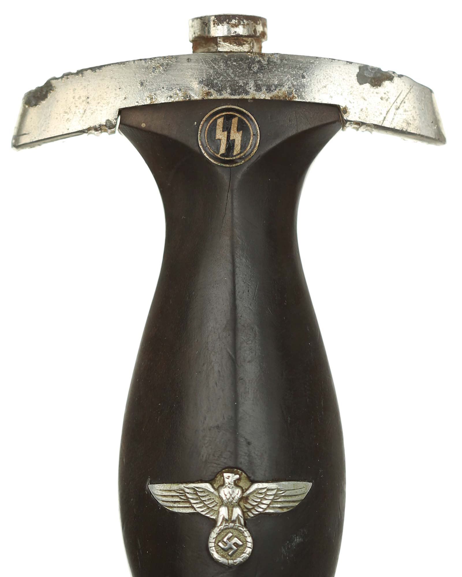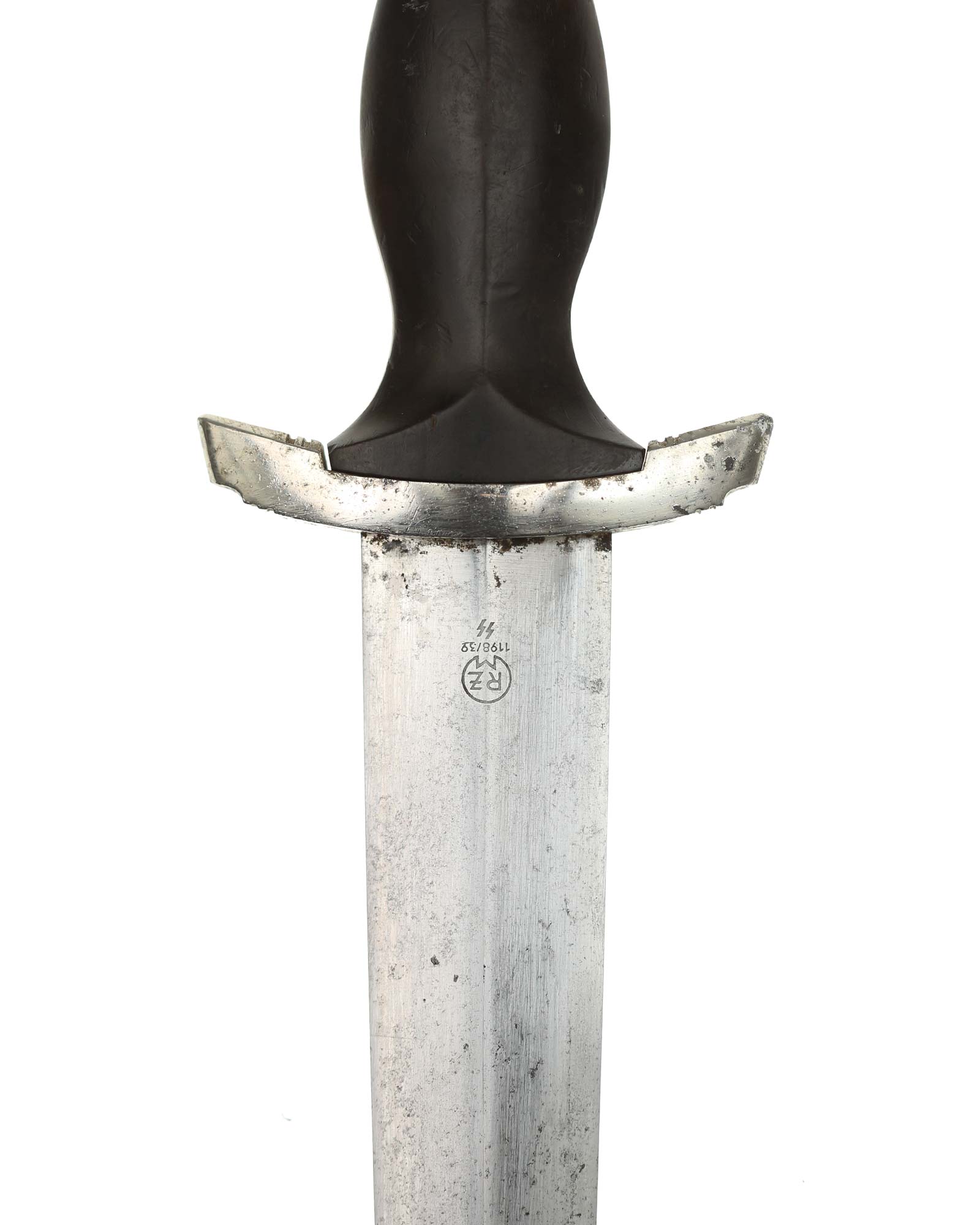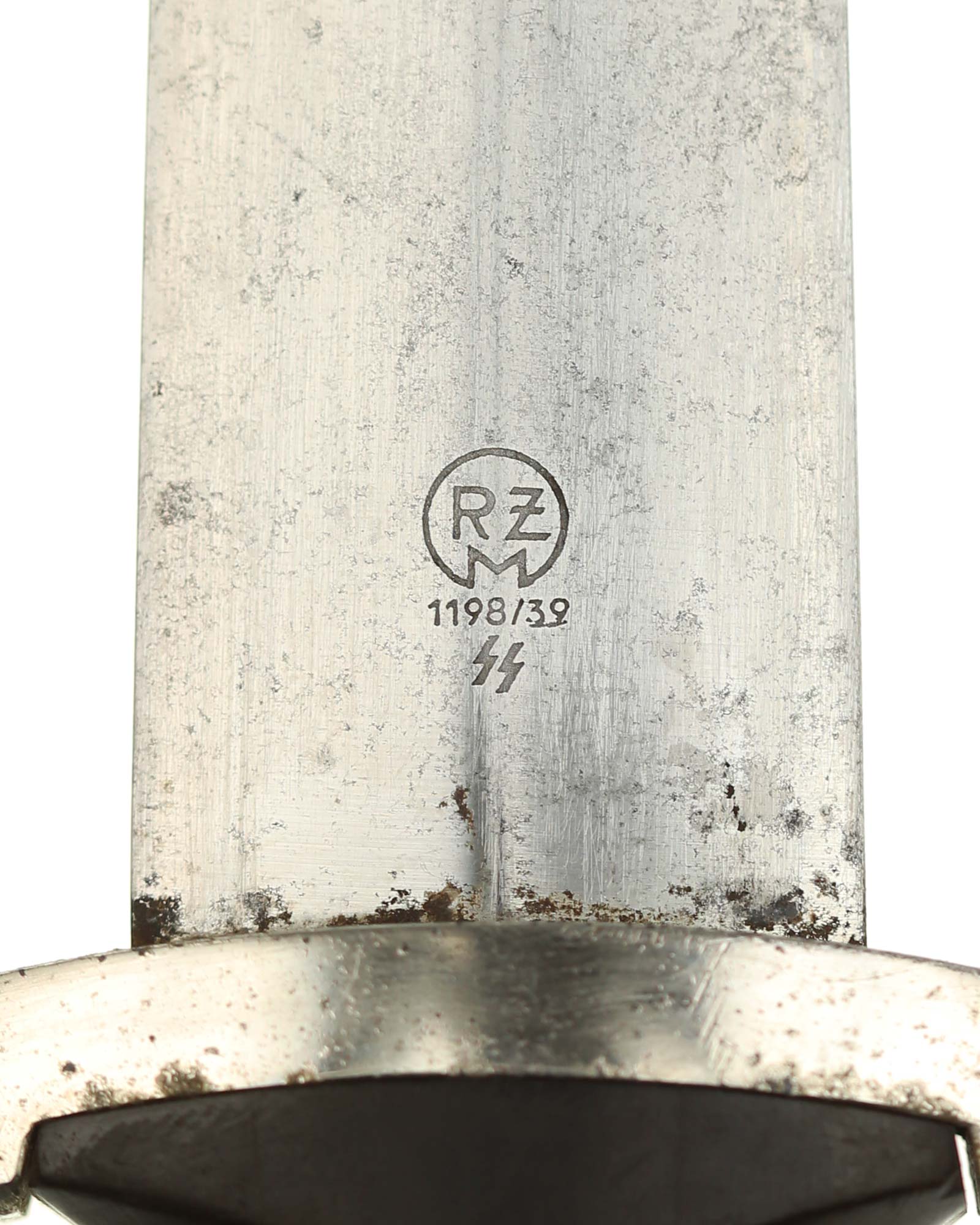 Клинок: Клинок кинжала прямой, стальной, двулезвийный, кинжального типа, с выраженным центральным ребром. На одной стороне клинка методом травления нанесен девиз СС «Meine Ehre heisst Treue» (Моя честь называется верностью). Клинок на оборотной стороне у основания стоит клеймо производителя RZM 1198/39 SS (F.W. Höller Solingen).