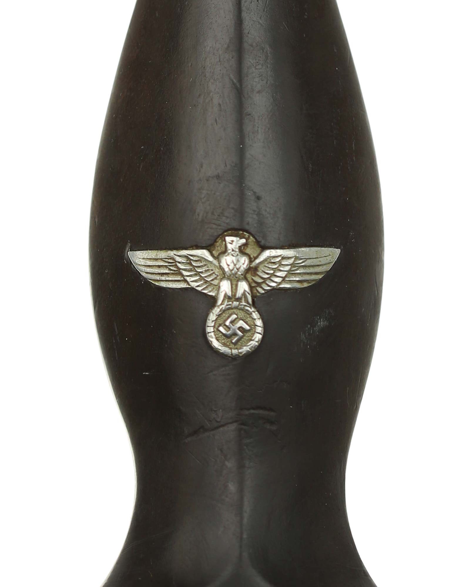 Рукоять: Рукоять из мореного в черный цвет дерева. Рукоять в верхней части имеет вставку в виде черного эмалевого глазка с рунами, в средней части – вставка в виде орла СС.