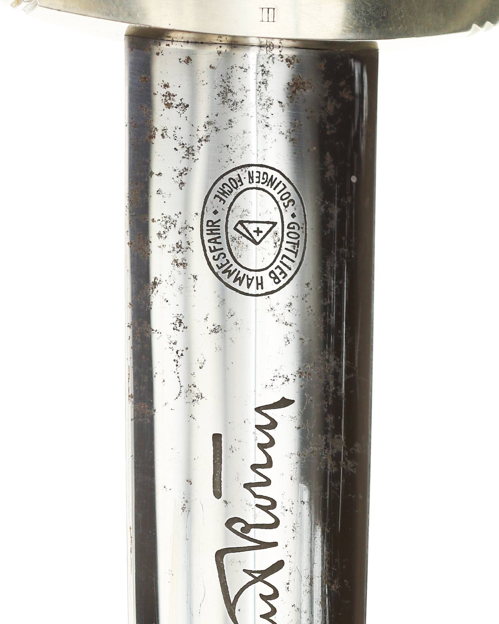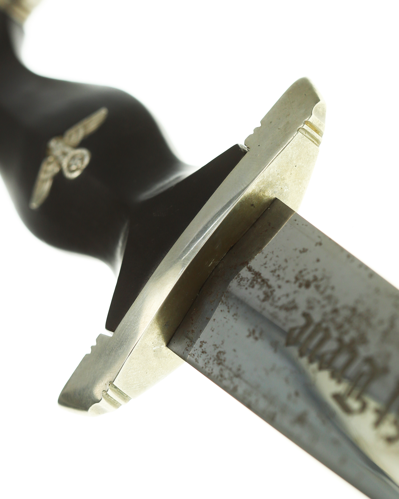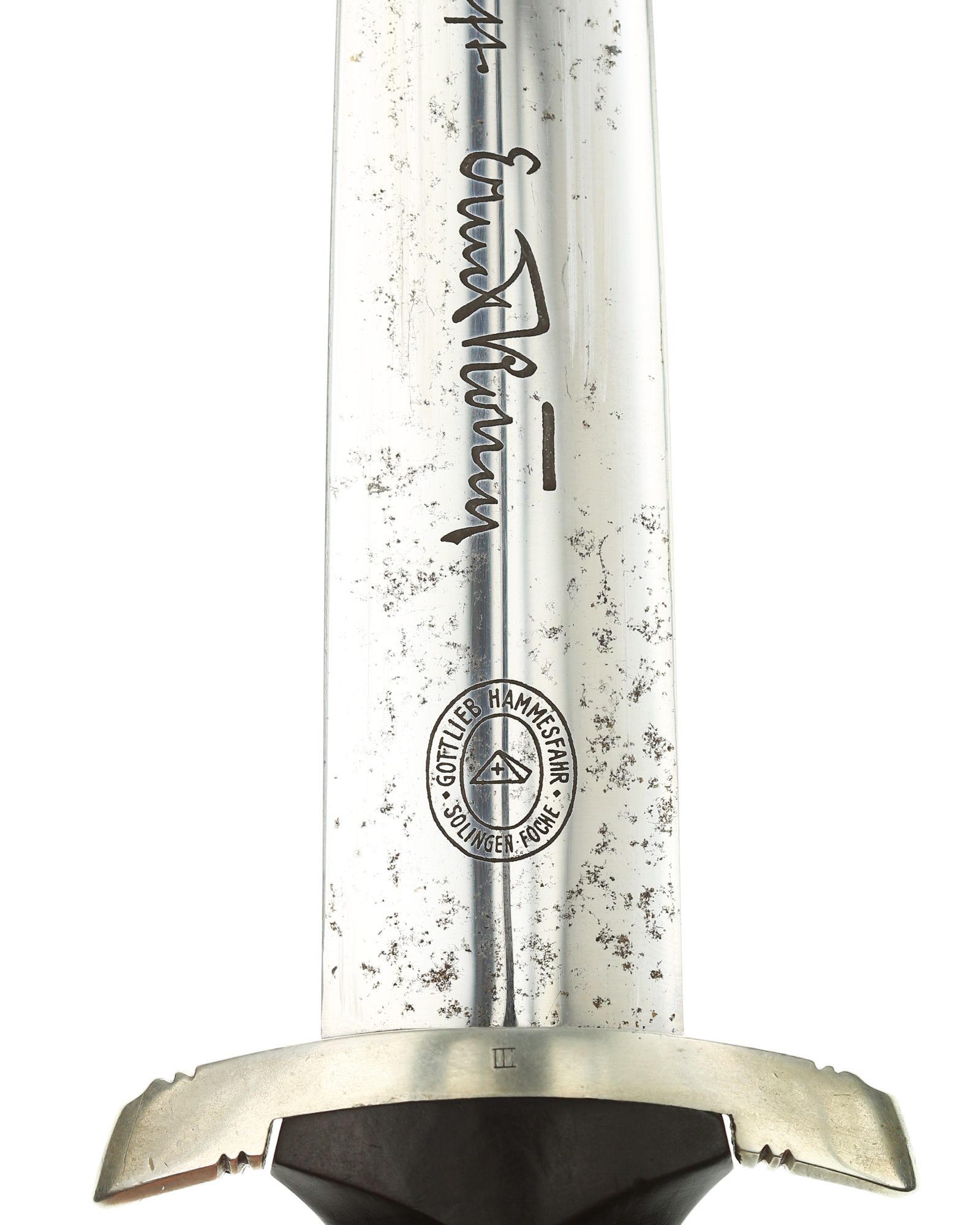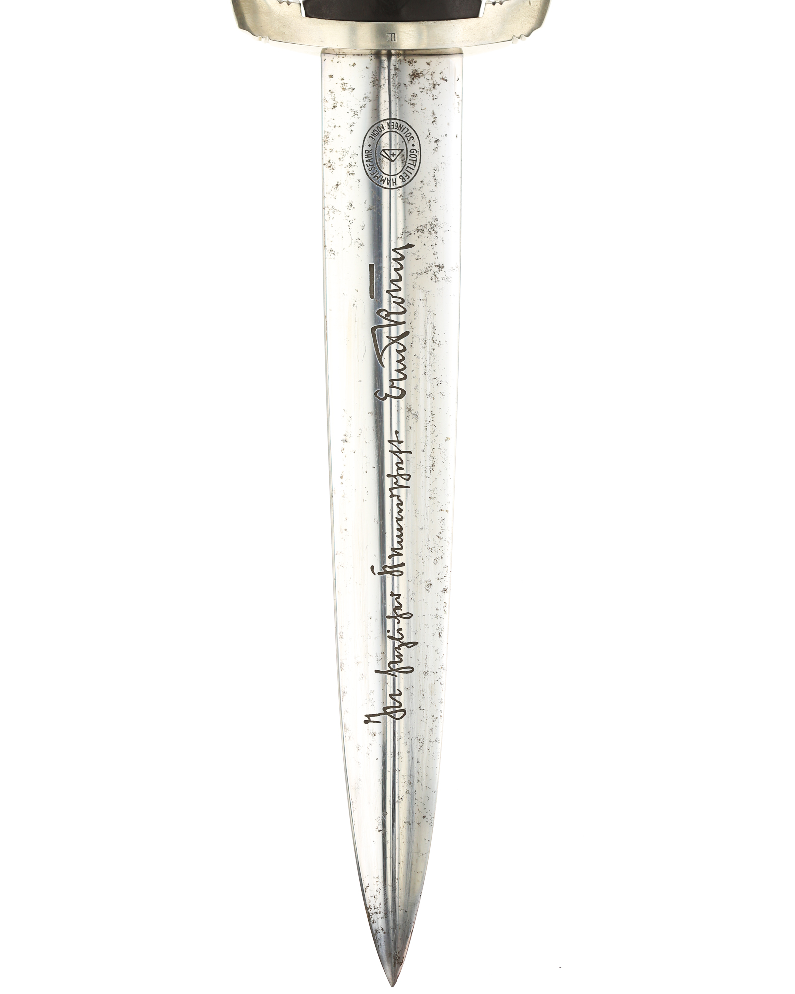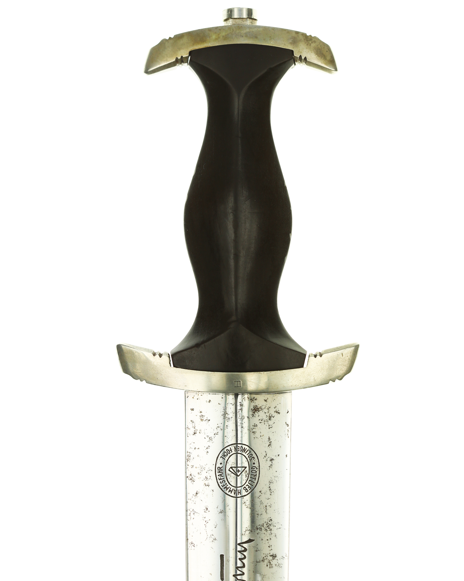 Клинок: Клинок стальной, классический кинжального типа, прямой, двулезвийный, с выраженным центральным ребром. Чрезвычайно редкий вариант кинжала SS "Schutz Staffeln" с полностью сохранившейся наградной надписью от на оборотной стороне клинка. Кинжал изготовлен в середине 1930-х годов известной фирмой "Gottlieb Hammesfahr Solingen-Foche" (Готтлиб Хаммесфар Золинген), клеймо на клинке маленького размера и расположено очень близко к гарде - это характерно только для наградных кинжалов, чтобы наградная надпись была в пропорции и могла полностью поместиться на клинке. На лицевой стороне клинка традиционно нанесен девиз SS "Meine Ehre heißt Treue" (Моя честь называется Верность). На оборотной стороне помещена дарственная надпись "In herzlicher Kameradshaft Ernst Röhm" (В знак сердечной дружбы Эрнст Рём).