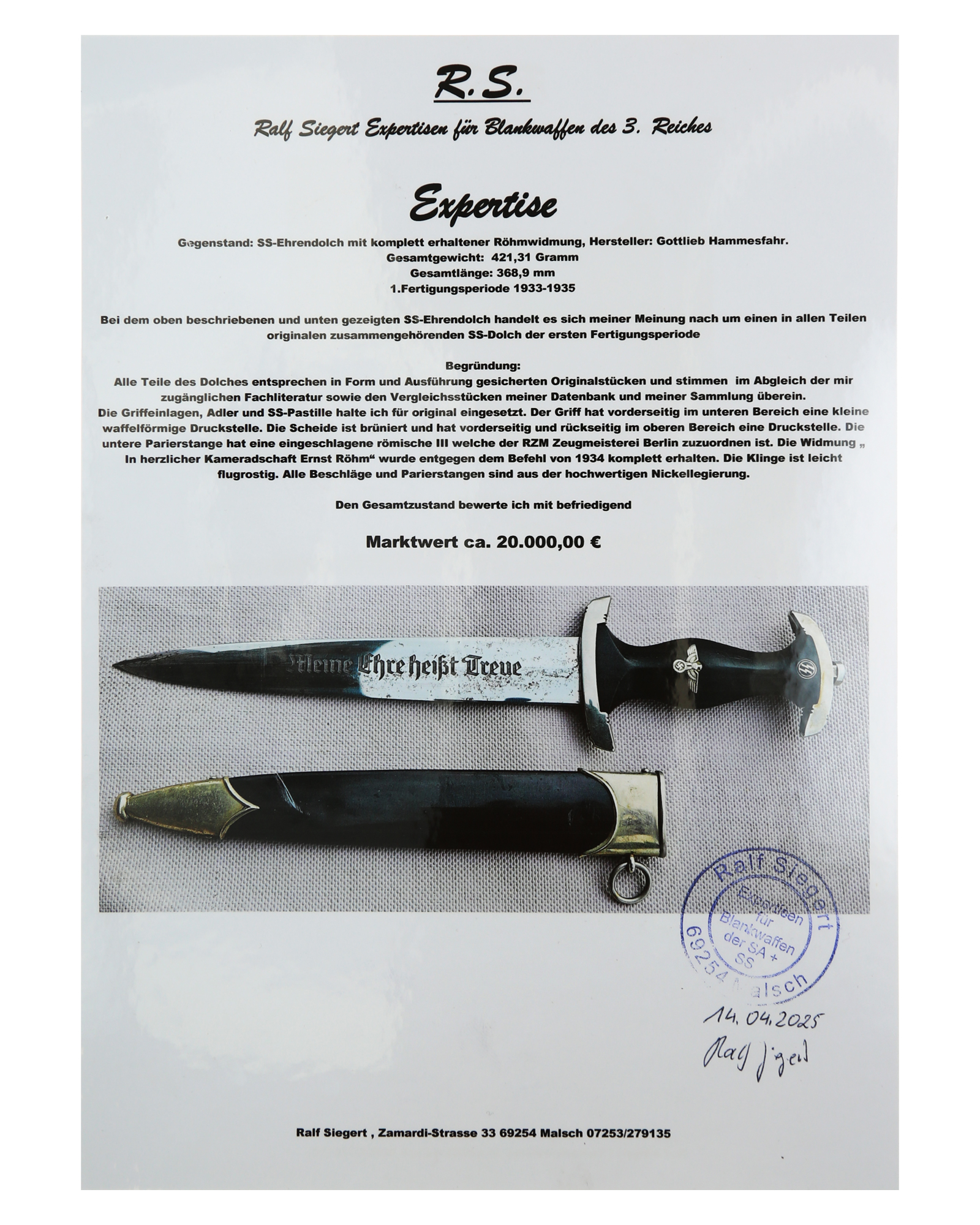 Ранний парадный кинжал СС [SS Schutzstaffel]. Ранний период производства 1933-1935 годы. Чрезвычайно редкий вариант кинжала SS "Schutzstaffel" с полностью сохранившейся наградной надписью от Эрнста Рема. Производитель фирма Gottlieb Hammesfahr Solingen-Foche (Готтлиб Хаммесфар Золинген).