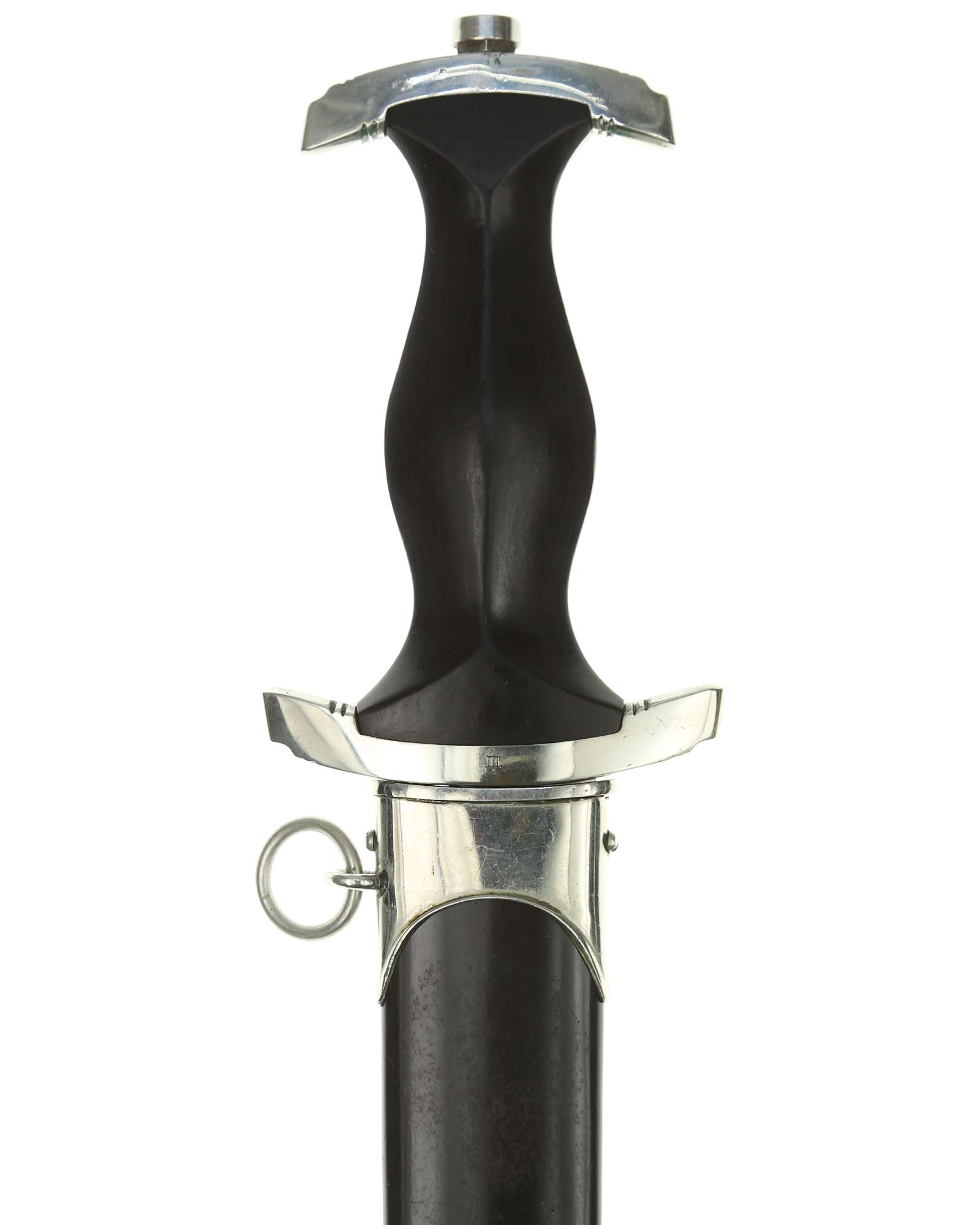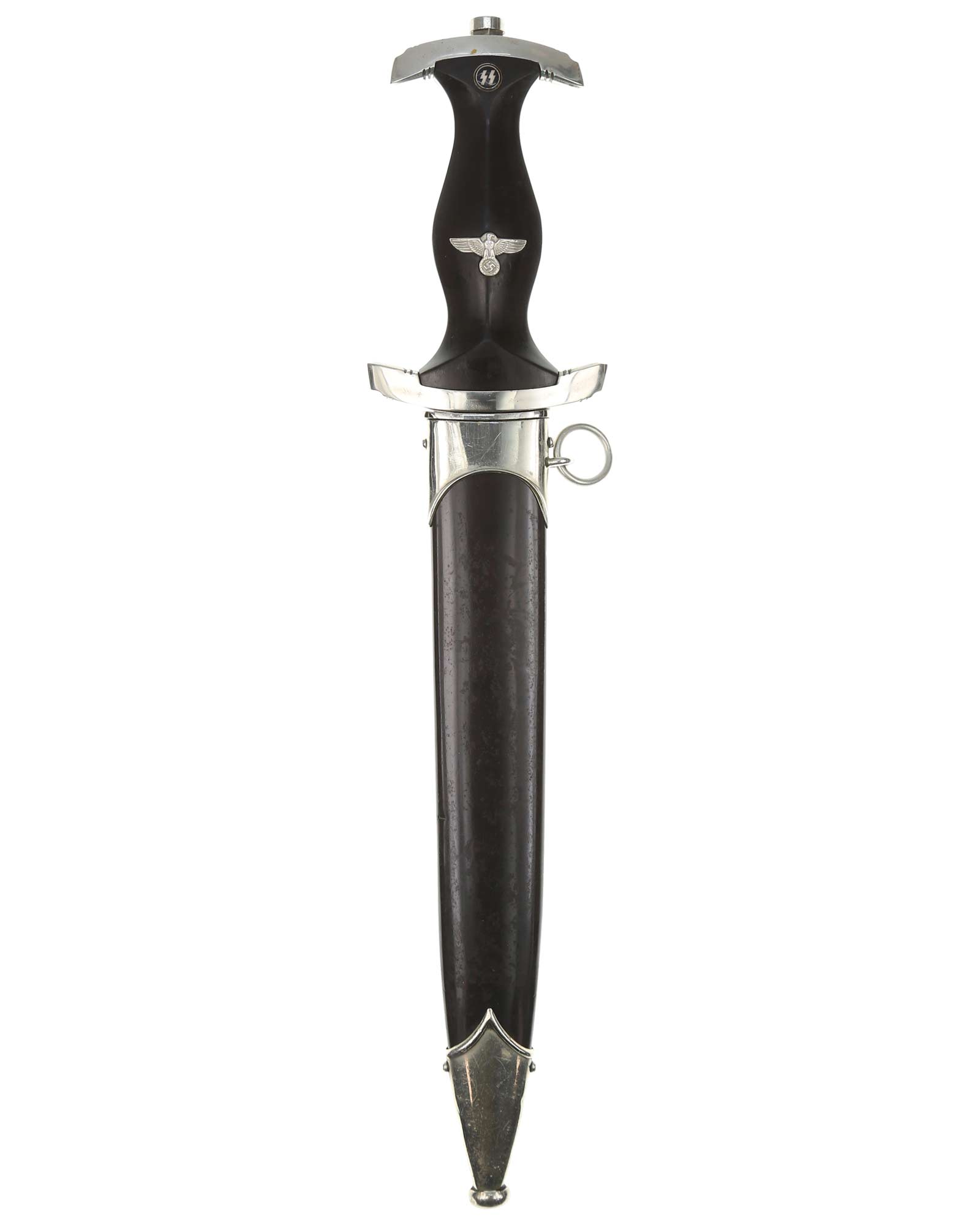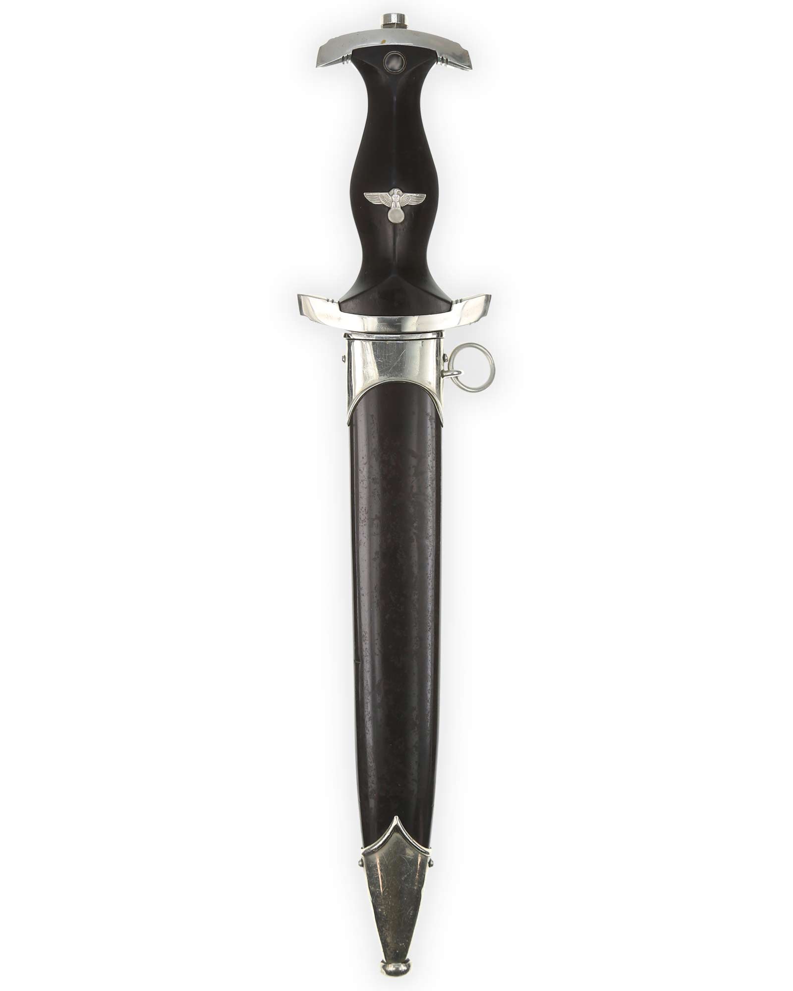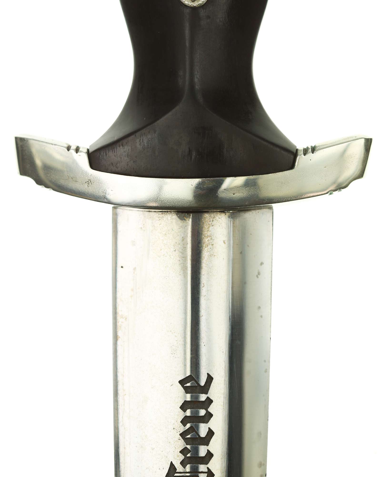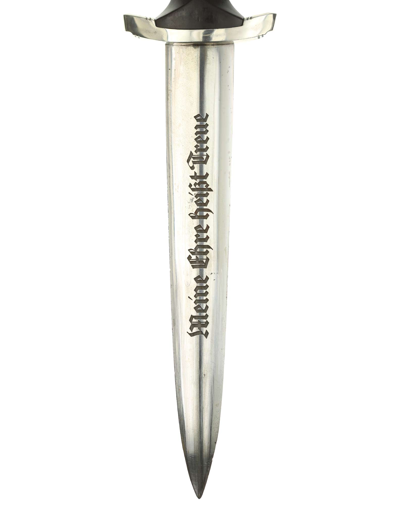 Клинок: Клинок стальной, классический кинжального типа, прямой, двулезвийный, с выраженным центральным ребром. Чрезвычайно редкий вариант кинжала SS "Schutz Staffeln" с полностью сохранившейся наградной надписью от на оборотной стороне клинка. Кинжал изготовлен в середине 1930-х годов известной фирмой "Robert Klaas Solingen" (Роберт Клаас Золинген), клеймо на клинке маленького размера и расположено очень близко к гарде - это характерно только для наградных кинжалов, чтобы наградная надпись была в пропорции и могла полностью поместиться на клинке. На лицевой стороне клинка традиционно нанесен девиз SS "Meine Ehre heißt Treue" (Моя честь называется Верность). На оборотной стороне помещена дарственная надпись "In herzlicher Kameradshaft Ernst Röhm" (В знак сердечной дружбы Эрнст Рём).
