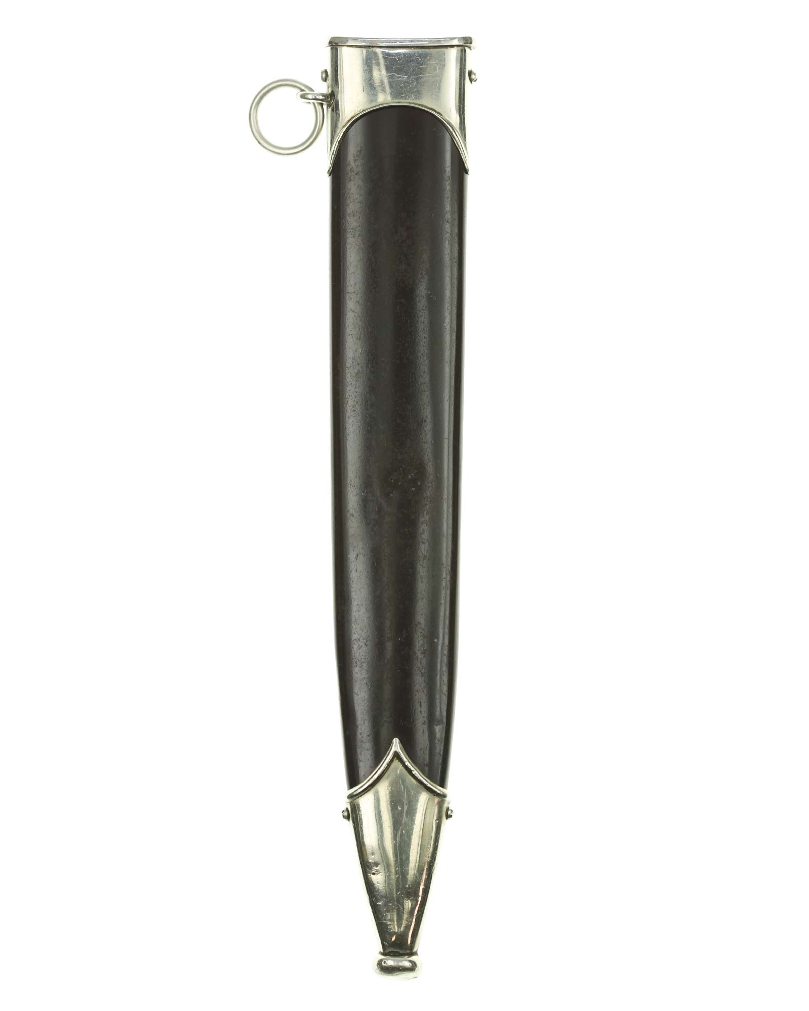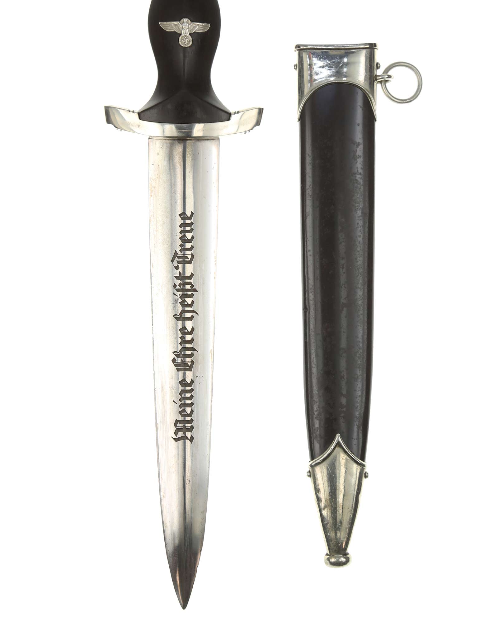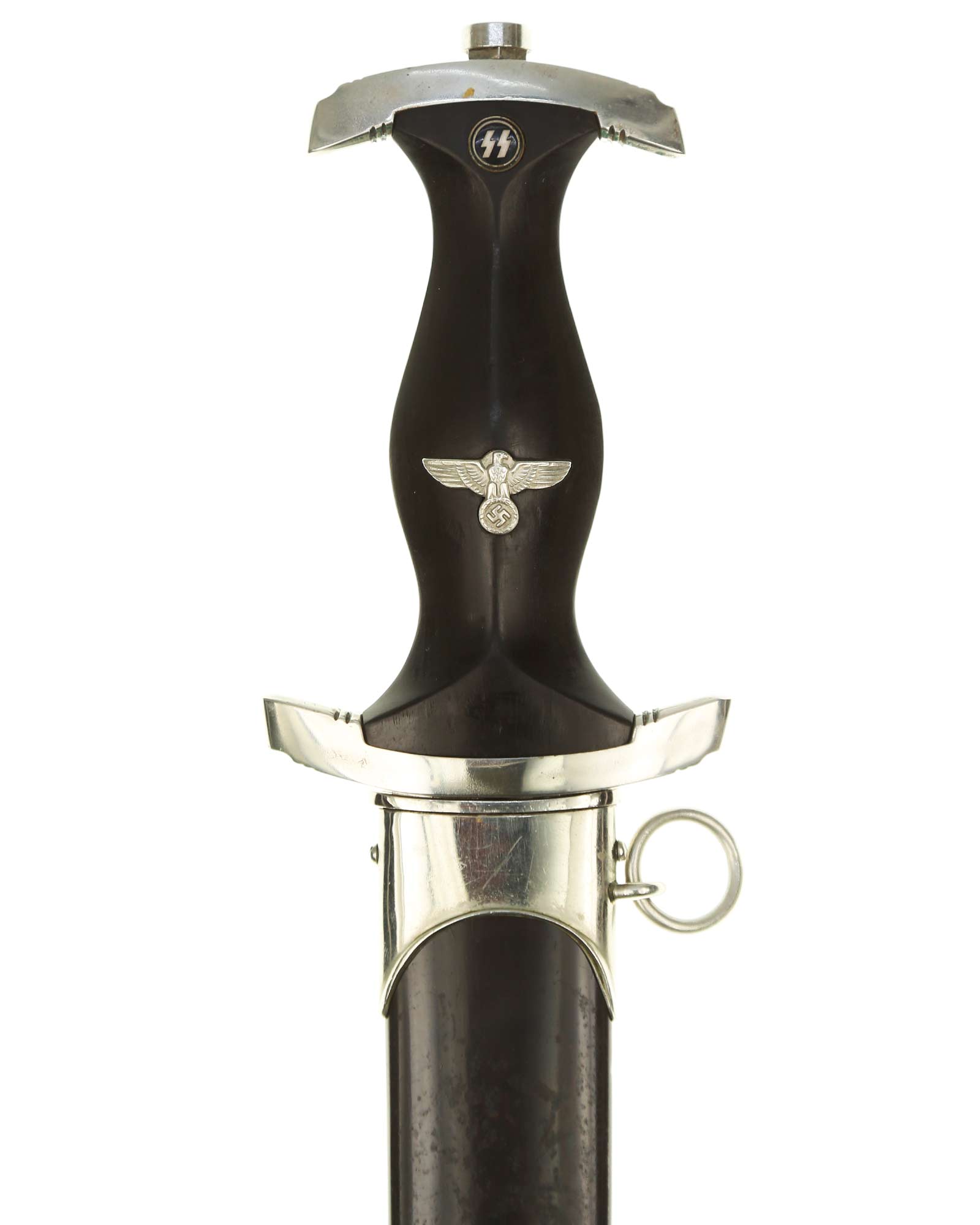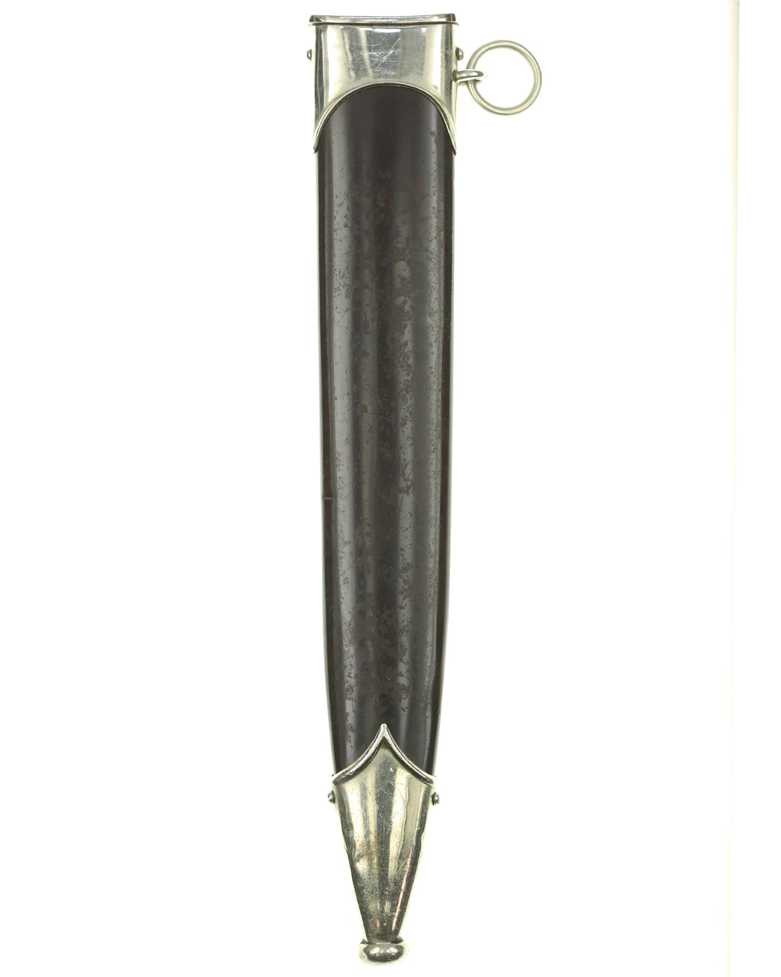 Клинок: Клинок стальной, классический кинжального типа, прямой, двулезвийный, с выраженным центральным ребром. Чрезвычайно редкий вариант кинжала SS "Schutz Staffeln" с полностью сохранившейся наградной надписью от на оборотной стороне клинка. Кинжал изготовлен в середине 1930-х годов известной фирмой "Robert Klaas Solingen" (Роберт Клаас Золинген), клеймо на клинке маленького размера и расположено очень близко к гарде - это характерно только для наградных кинжалов, чтобы наградная надпись была в пропорции и могла полностью поместиться на клинке. На лицевой стороне клинка традиционно нанесен девиз SS "Meine Ehre heißt Treue" (Моя честь называется Верность). На оборотной стороне помещена дарственная надпись "In herzlicher Kameradshaft Ernst Röhm" (В знак сердечной дружбы Эрнст Рём).