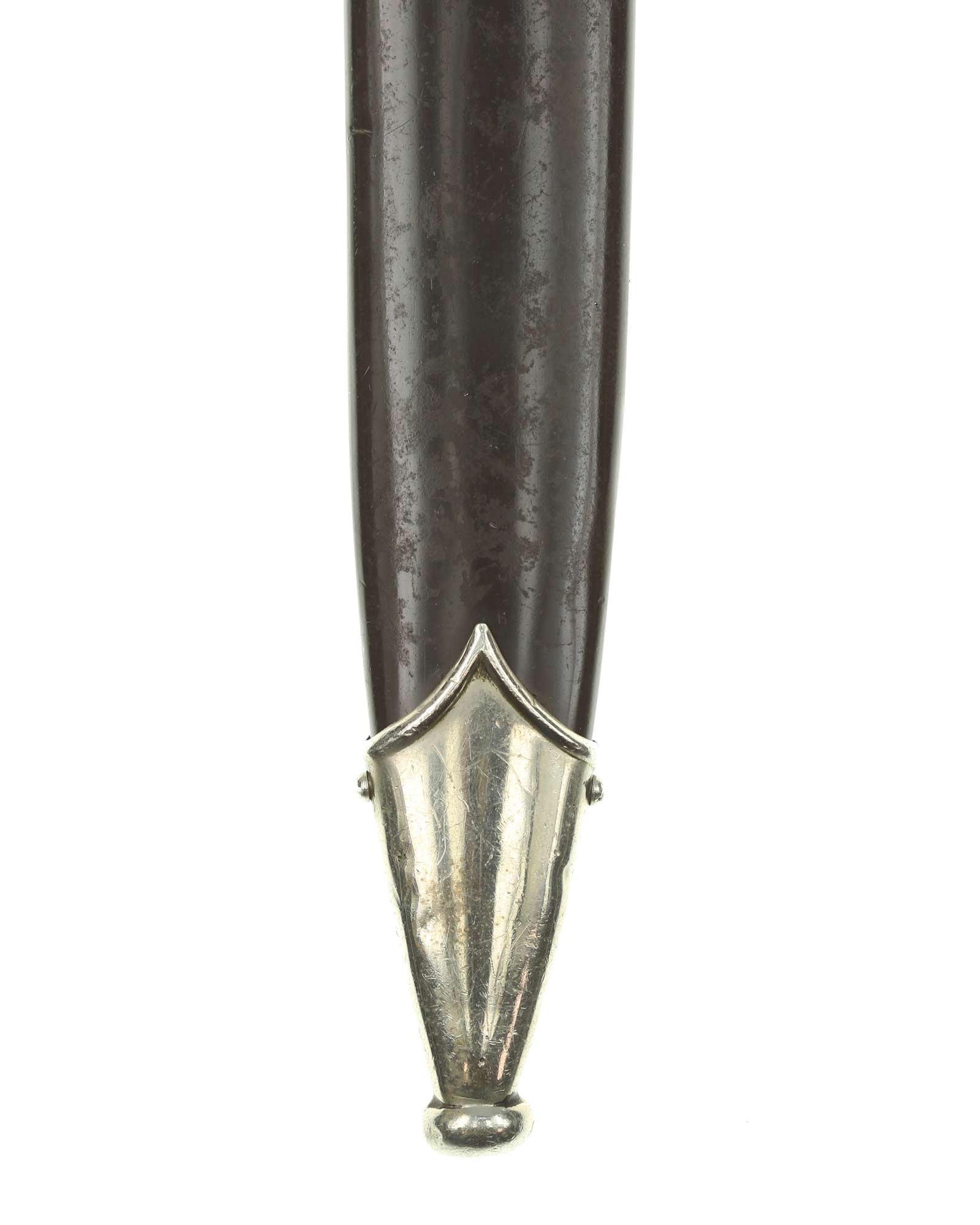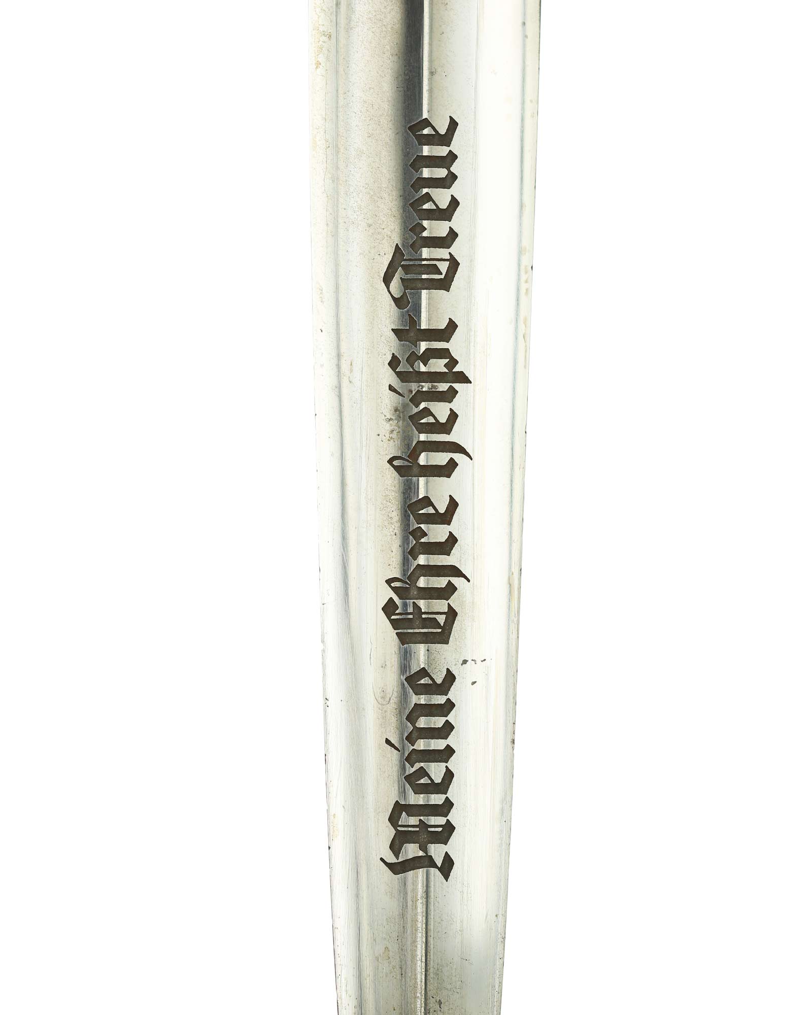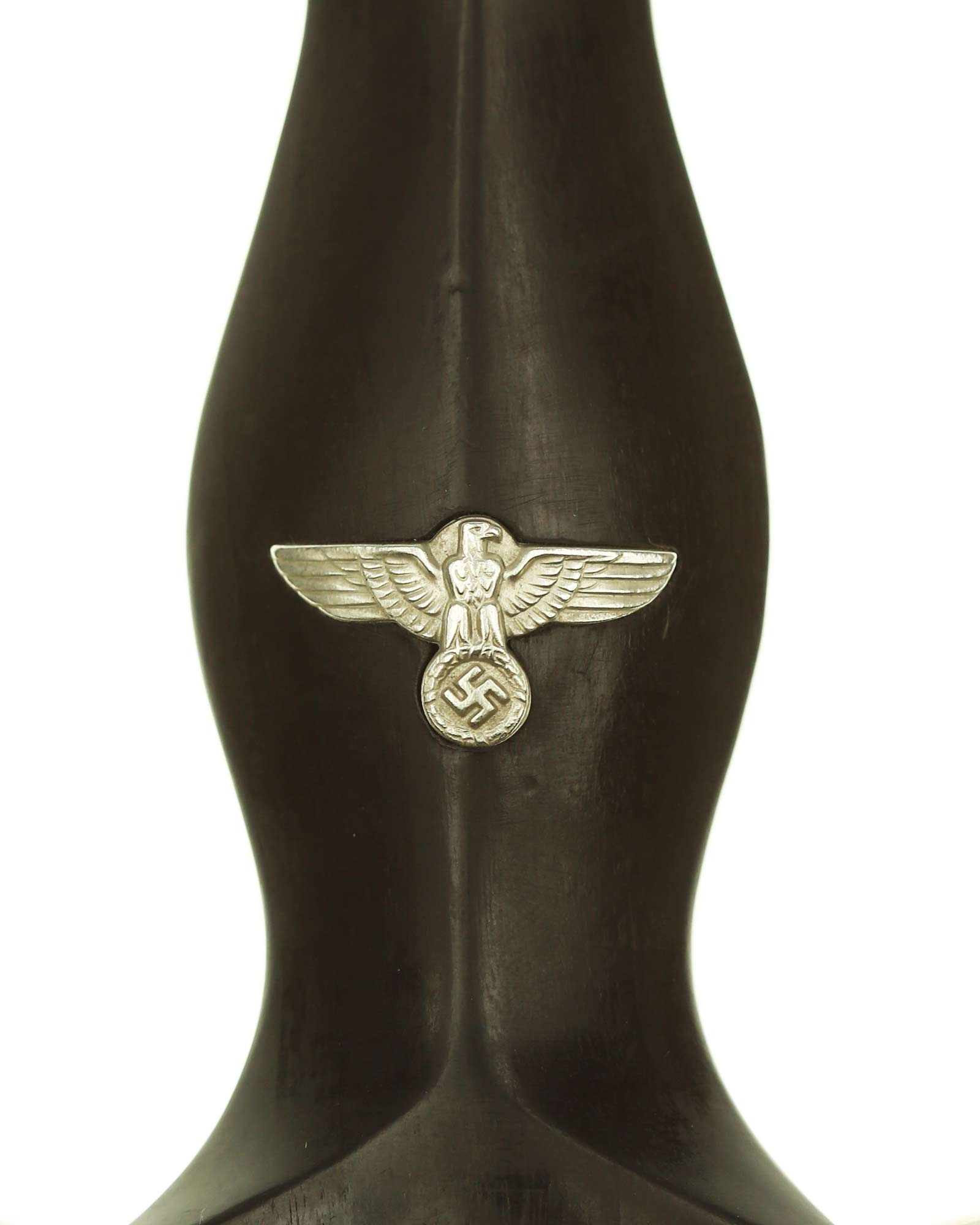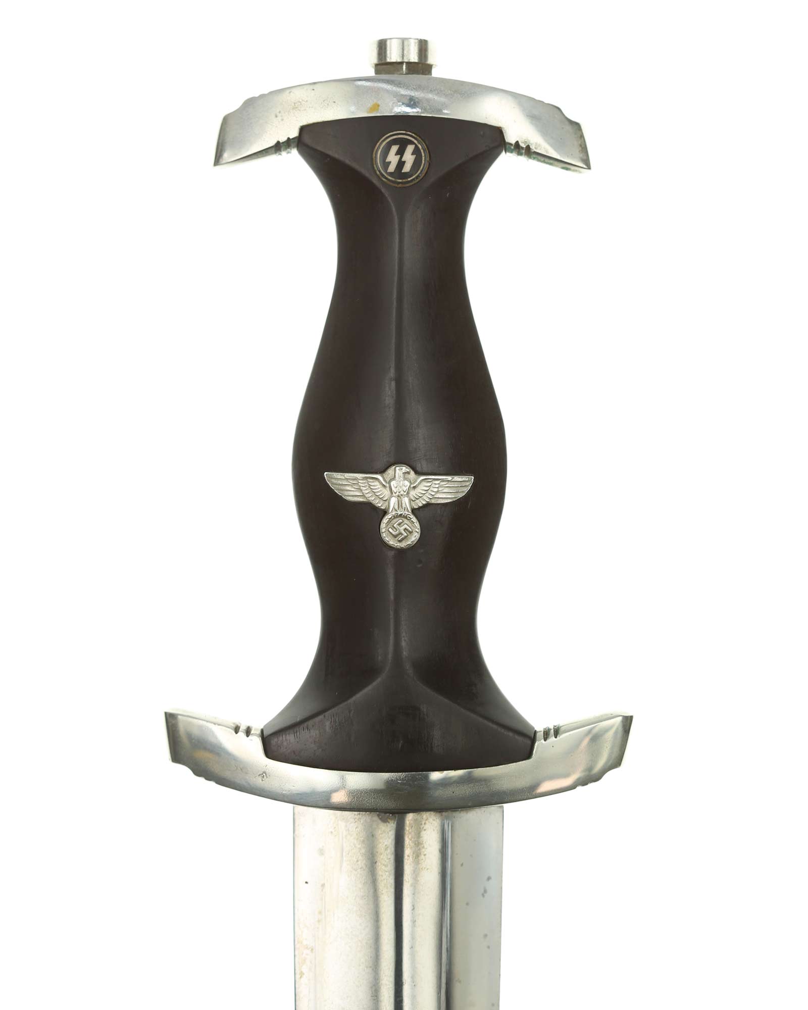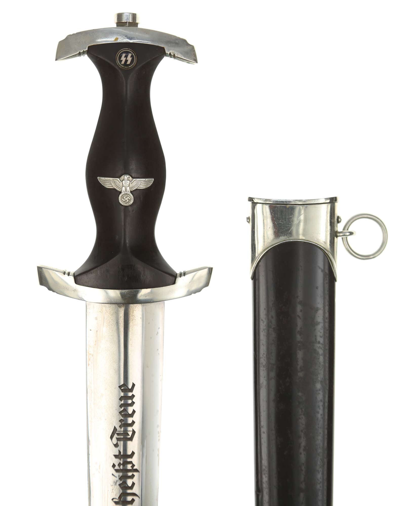 Клинок: Клинок стальной, классический кинжального типа, прямой, двулезвийный, с выраженным центральным ребром. Чрезвычайно редкий вариант кинжала SS "Schutz Staffeln" с полностью сохранившейся наградной надписью от на оборотной стороне клинка. Кинжал изготовлен в середине 1930-х годов известной фирмой "Robert Klaas Solingen" (Роберт Клаас Золинген), клеймо на клинке маленького размера и расположено очень близко к гарде - это характерно только для наградных кинжалов, чтобы наградная надпись была в пропорции и могла полностью поместиться на клинке. На лицевой стороне клинка традиционно нанесен девиз SS "Meine Ehre heißt Treue" (Моя честь называется Верность). На оборотной стороне помещена дарственная надпись "In herzlicher Kameradshaft Ernst Röhm" (В знак сердечной дружбы Эрнст Рём).