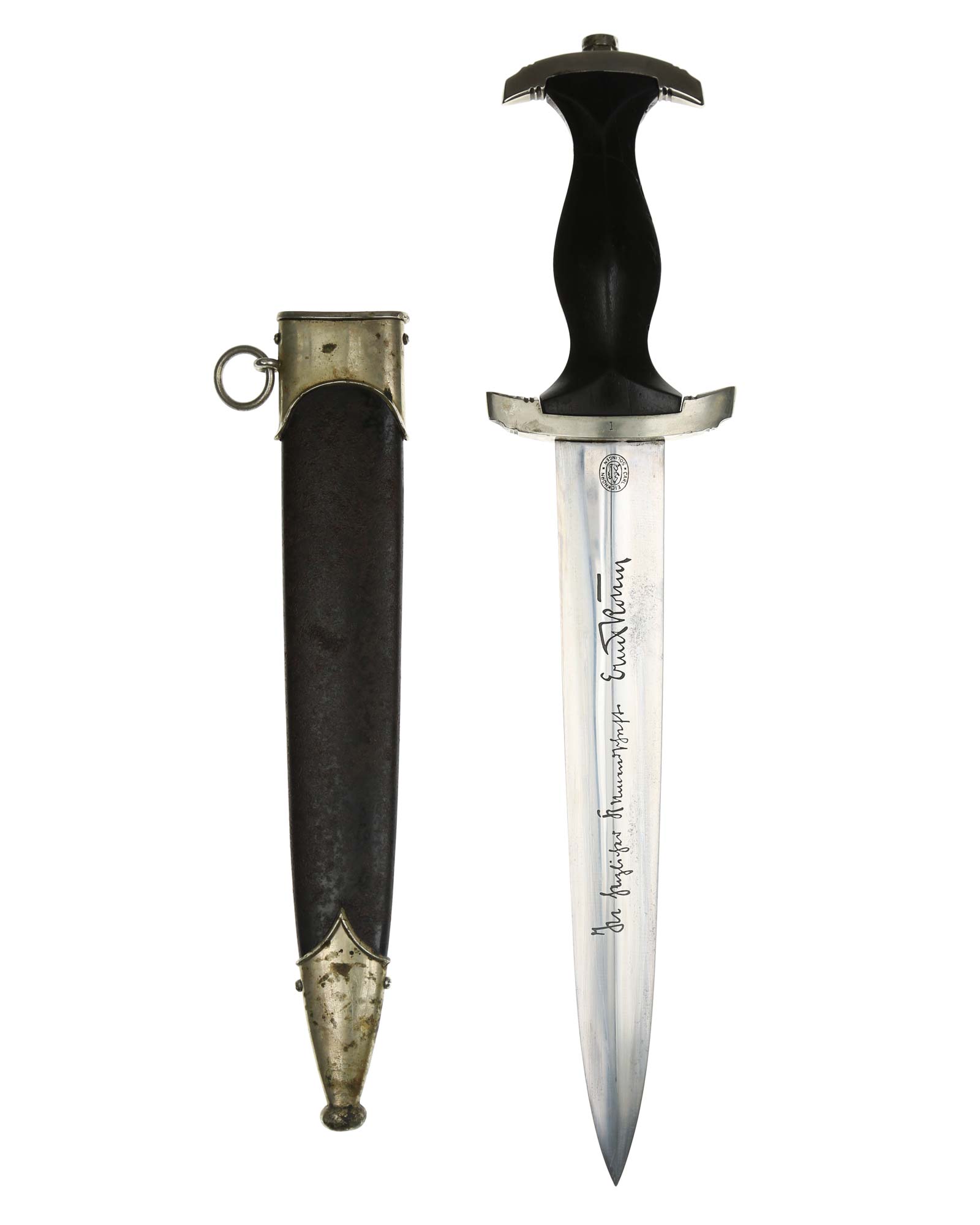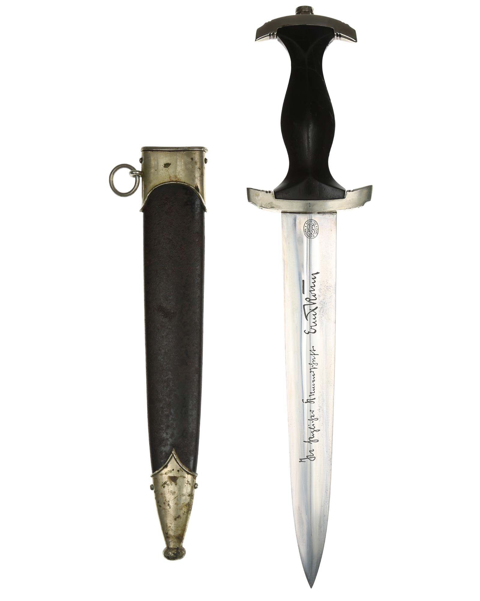 Ранний парадный кинжал СС [SS Schutzstaffel]. Ранний период производства 1933-1935 годы. Чрезвычайно редкий вариант кинжала SS "Schutzstaffel" с полностью сохранившейся наградной надписью от Эрнста Рема.