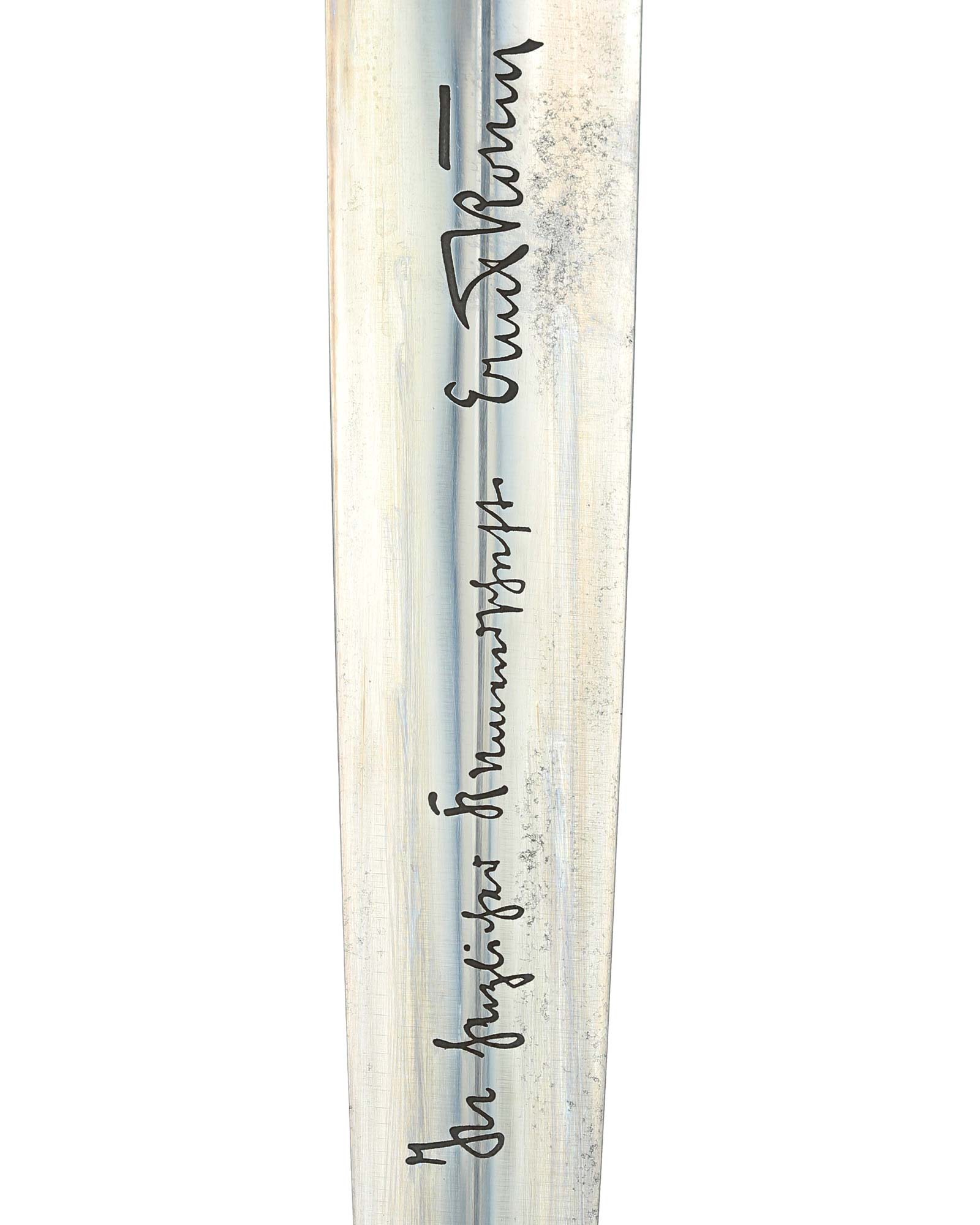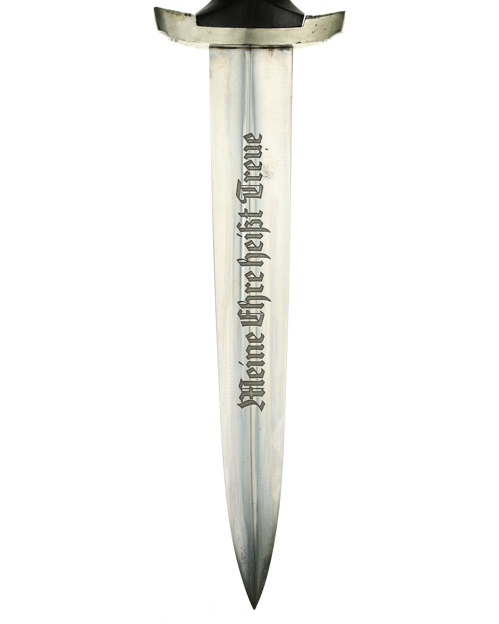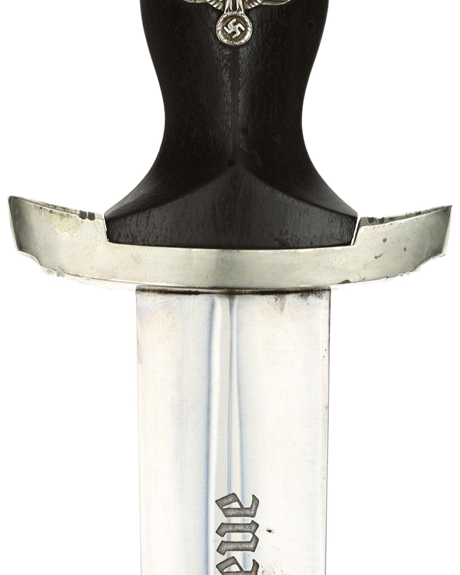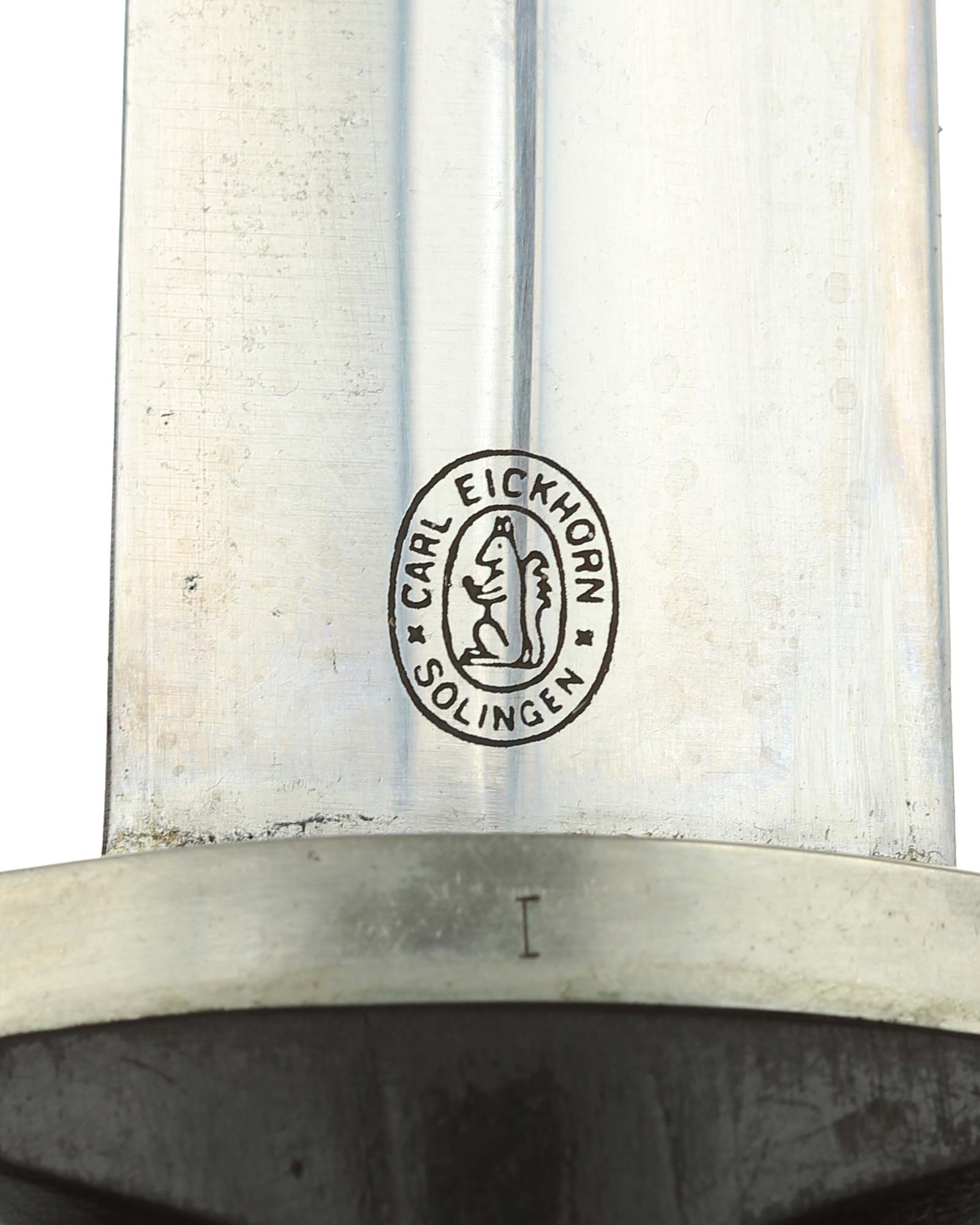 Клинок: Клинок стальной, классический кинжального типа, прямой, двулезвийный, с выраженным центральным ребром. Чрезвычайно редкий вариант кинжала SS "Schutz Staffeln" с полностью сохранившейся наградной надписью от на оборотной стороне клинка. Кинжал изготовлен в середине 1930-х годов известной фирмой "Carl Eickhorn" (элитной оружейной фирмой в Золингене, выпускавшей высококачественное холодное оружие, в т.ч. для СС), клеймо на клинке маленького размера и расположено очень близко к гарде - это характерно только для наградных кинжалов, чтобы наградная надпись была в пропорции и могла полностью поместиться на клинке. На лицевой стороне клинка традиционно нанесен девиз SS "Meine Ehre heißt Treue" (Моя честь называется Верность). На оборотной стороне помещена дарственная надпись "In herzlicher Kameradshaft Ernst Röhm" (В знак сердечной дружбы Эрнст Рём).