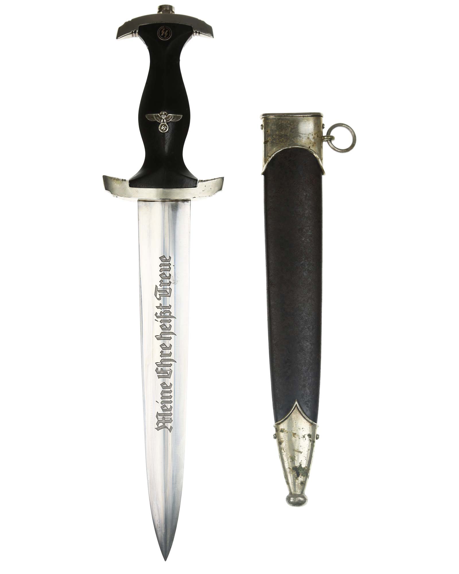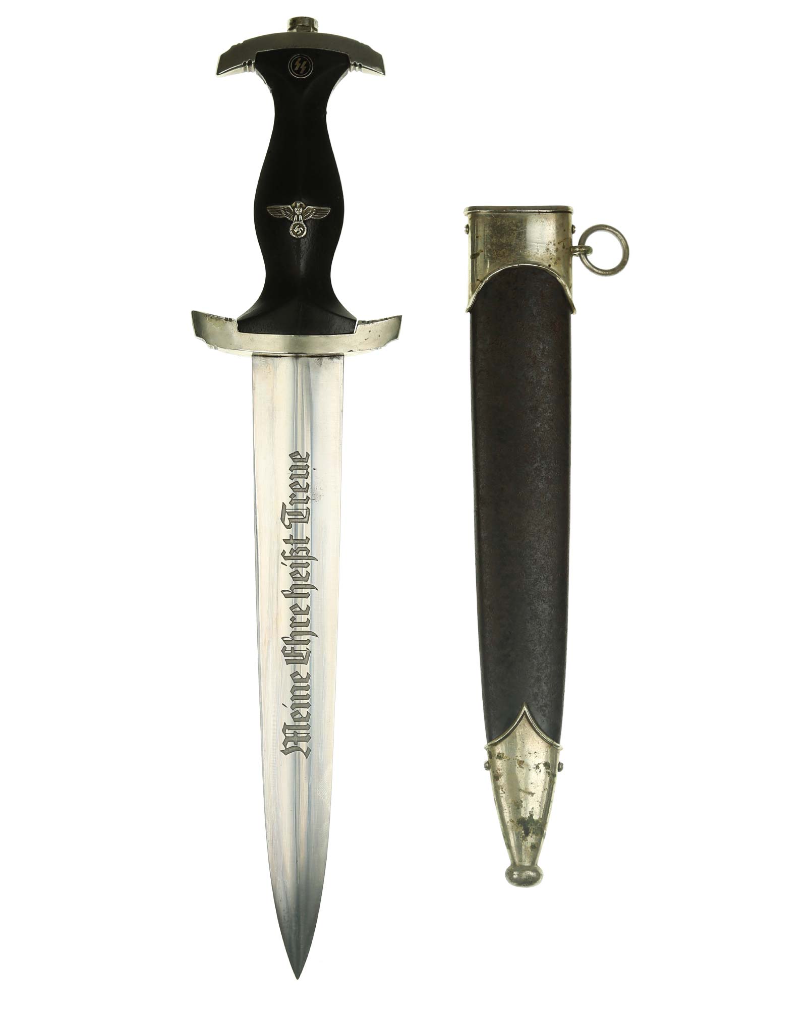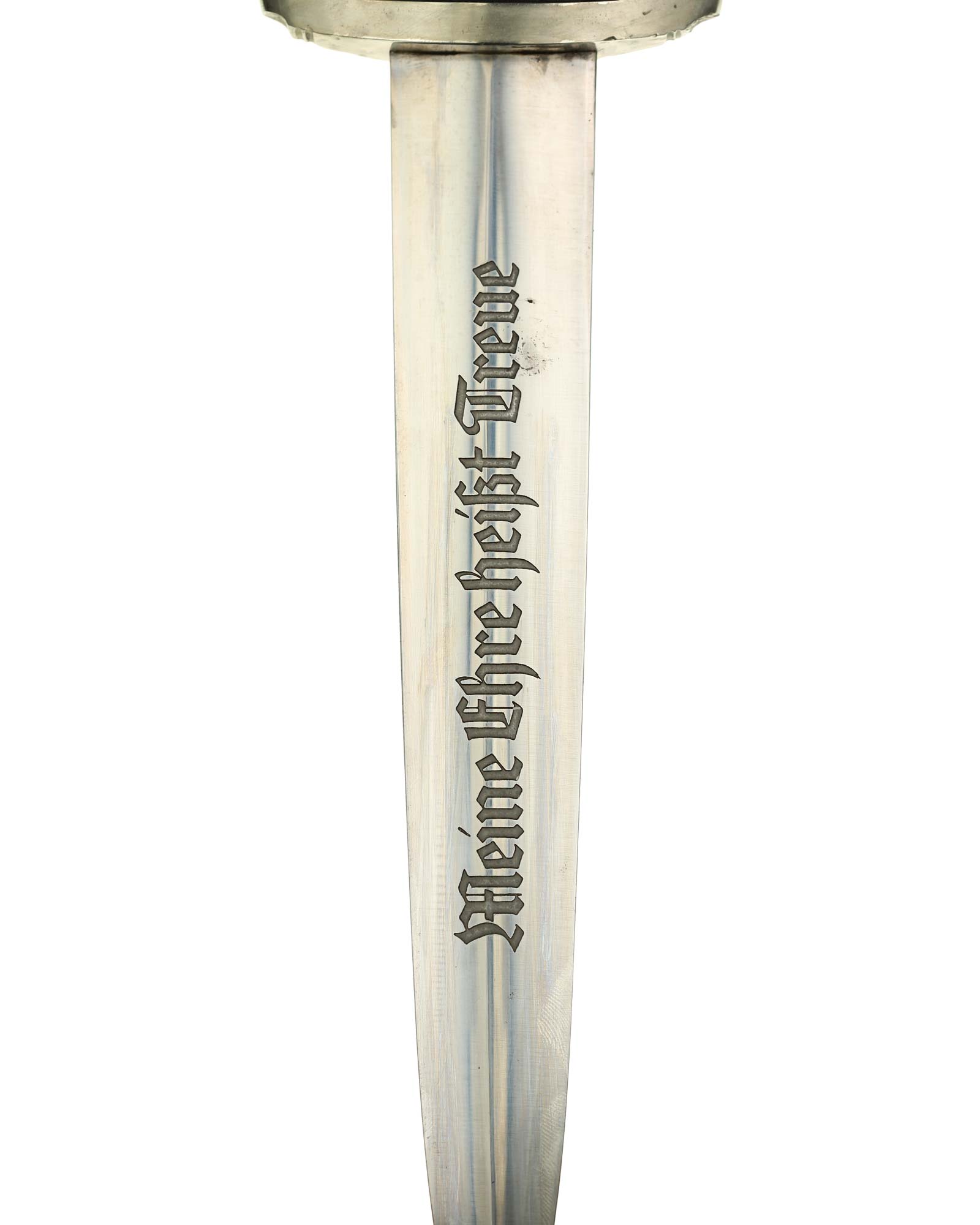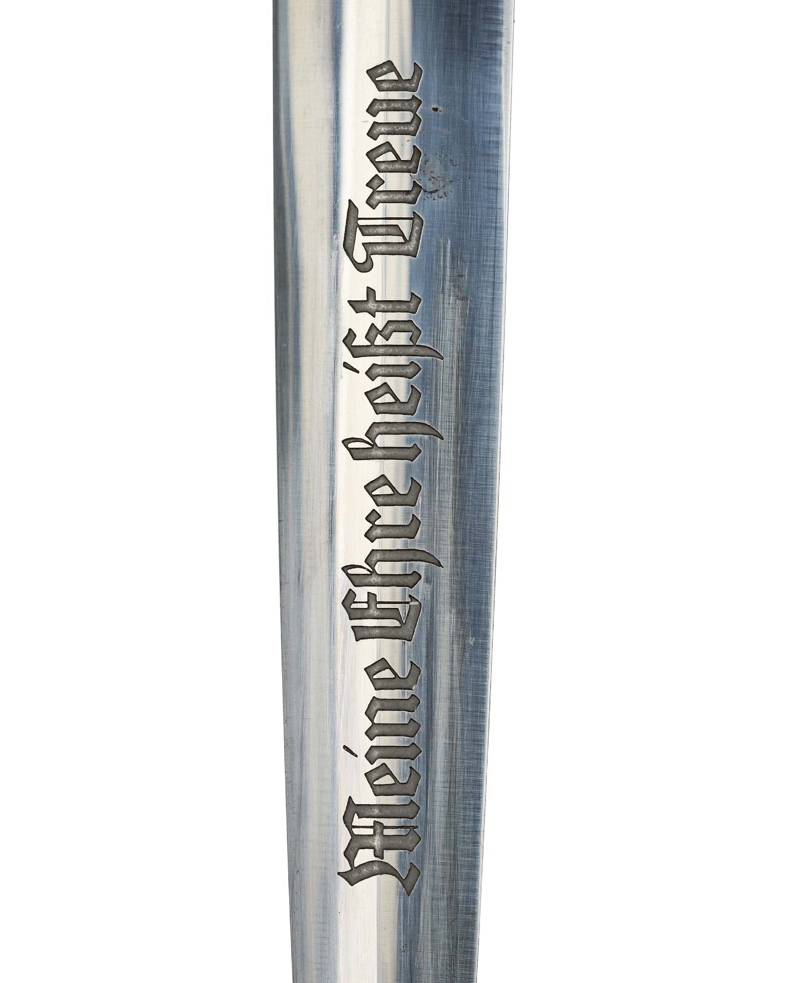 Клинок: Клинок стальной, классический кинжального типа, прямой, двулезвийный, с выраженным центральным ребром. Чрезвычайно редкий вариант кинжала SS "Schutz Staffeln" с полностью сохранившейся наградной надписью от на оборотной стороне клинка. Кинжал изготовлен в середине 1930-х годов известной фирмой "Carl Eickhorn" (элитной оружейной фирмой в Золингене, выпускавшей высококачественное холодное оружие, в т.ч. для СС), клеймо на клинке маленького размера и расположено очень близко к гарде - это характерно только для наградных кинжалов, чтобы наградная надпись была в пропорции и могла полностью поместиться на клинке. На лицевой стороне клинка традиционно нанесен девиз SS "Meine Ehre heißt Treue" (Моя честь называется Верность). На оборотной стороне помещена дарственная надпись "In herzlicher Kameradshaft Ernst Röhm" (В знак сердечной дружбы Эрнст Рём).