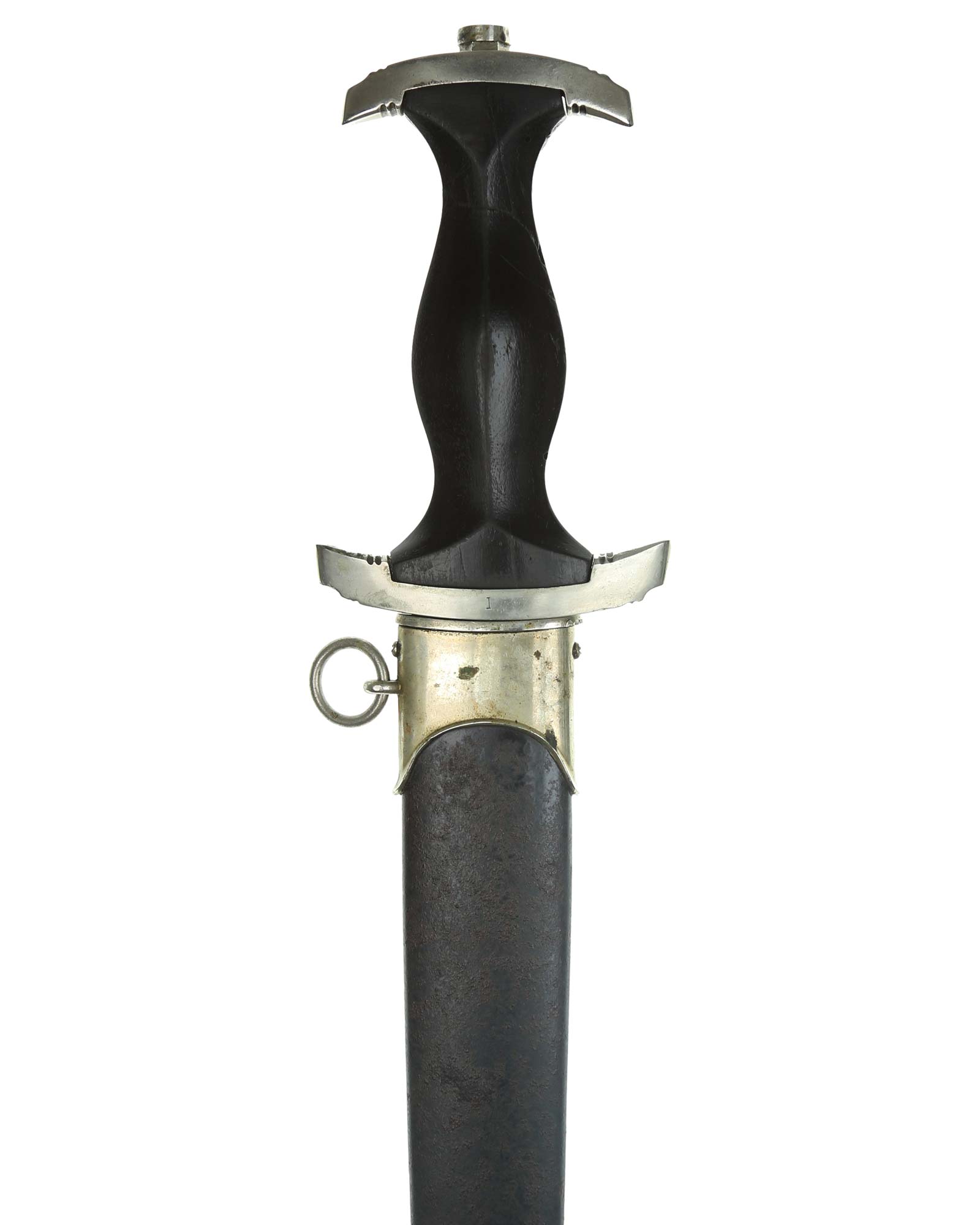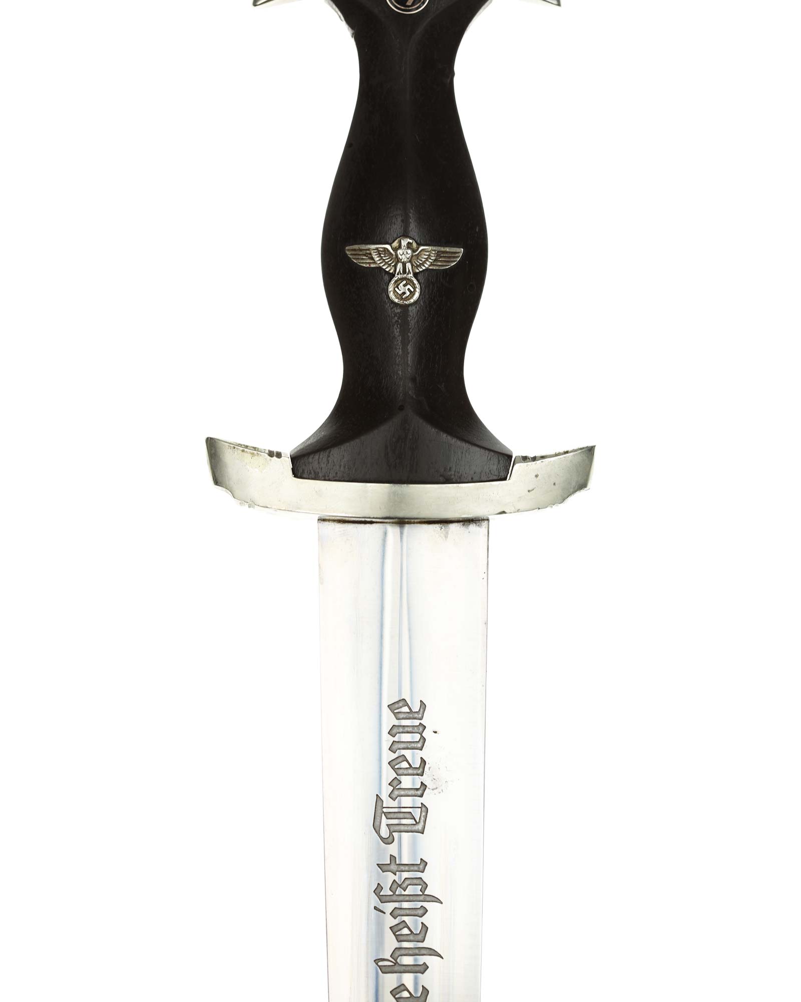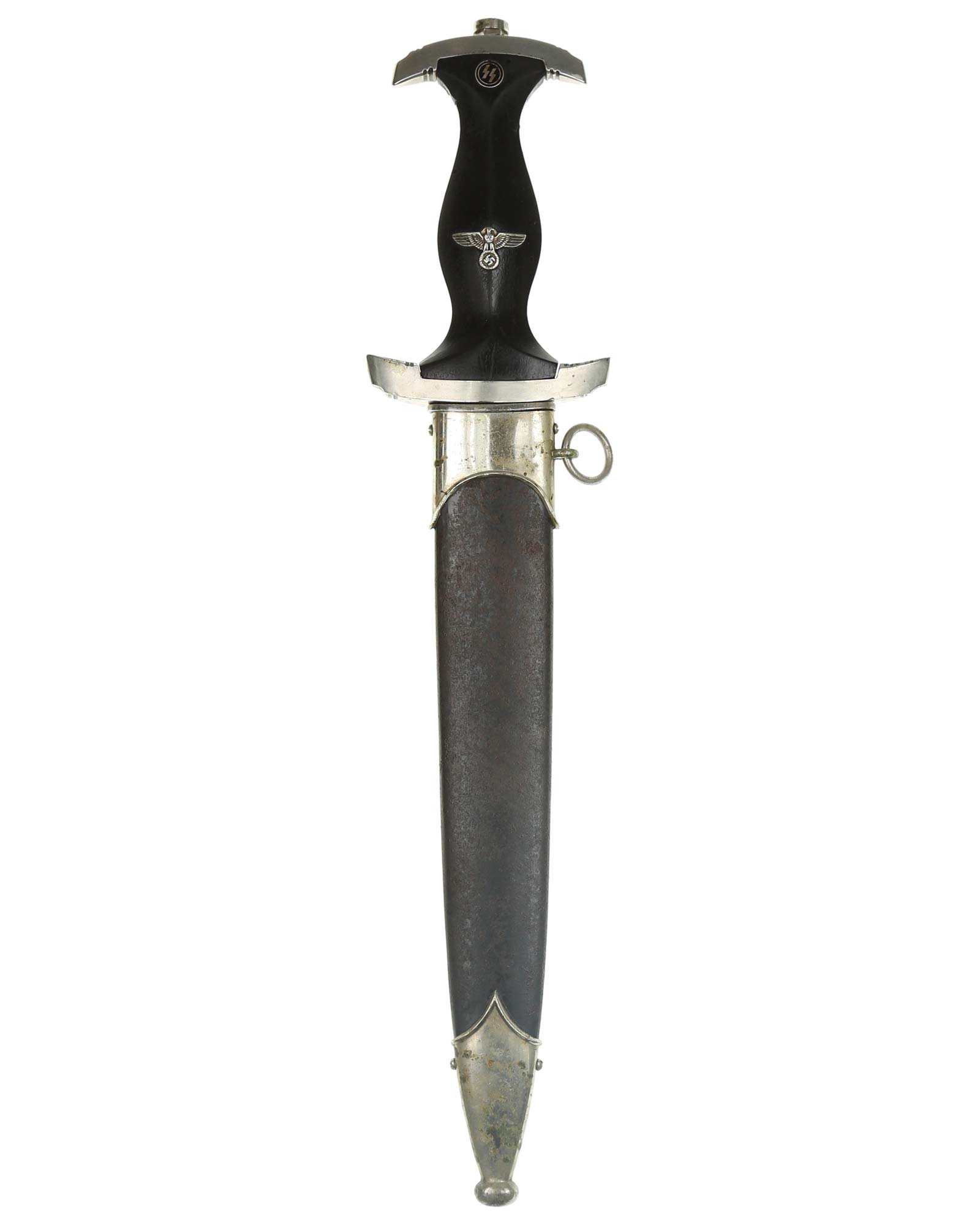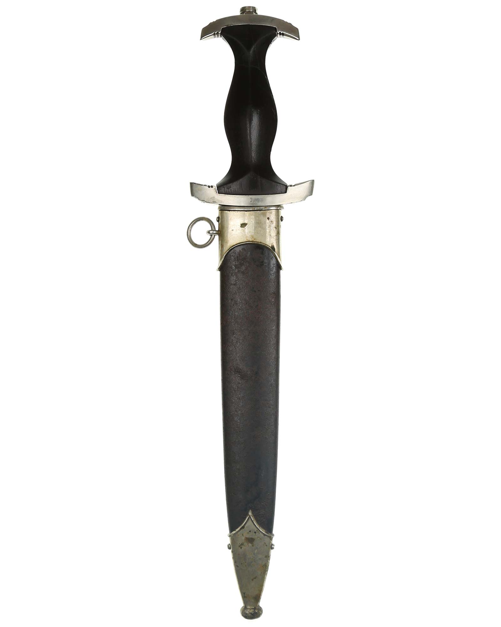 Клинок: Клинок стальной, классический кинжального типа, прямой, двулезвийный, с выраженным центральным ребром. Чрезвычайно редкий вариант кинжала SS "Schutz Staffeln" с полностью сохранившейся наградной надписью от на оборотной стороне клинка. Кинжал изготовлен в середине 1930-х годов известной фирмой "Carl Eickhorn" (элитной оружейной фирмой в Золингене, выпускавшей высококачественное холодное оружие, в т.ч. для СС), клеймо на клинке маленького размера и расположено очень близко к гарде - это характерно только для наградных кинжалов, чтобы наградная надпись была в пропорции и могла полностью поместиться на клинке. На лицевой стороне клинка традиционно нанесен девиз SS "Meine Ehre heißt Treue" (Моя честь называется Верность). На оборотной стороне помещена дарственная надпись "In herzlicher Kameradshaft Ernst Röhm" (В знак сердечной дружбы Эрнст Рём).