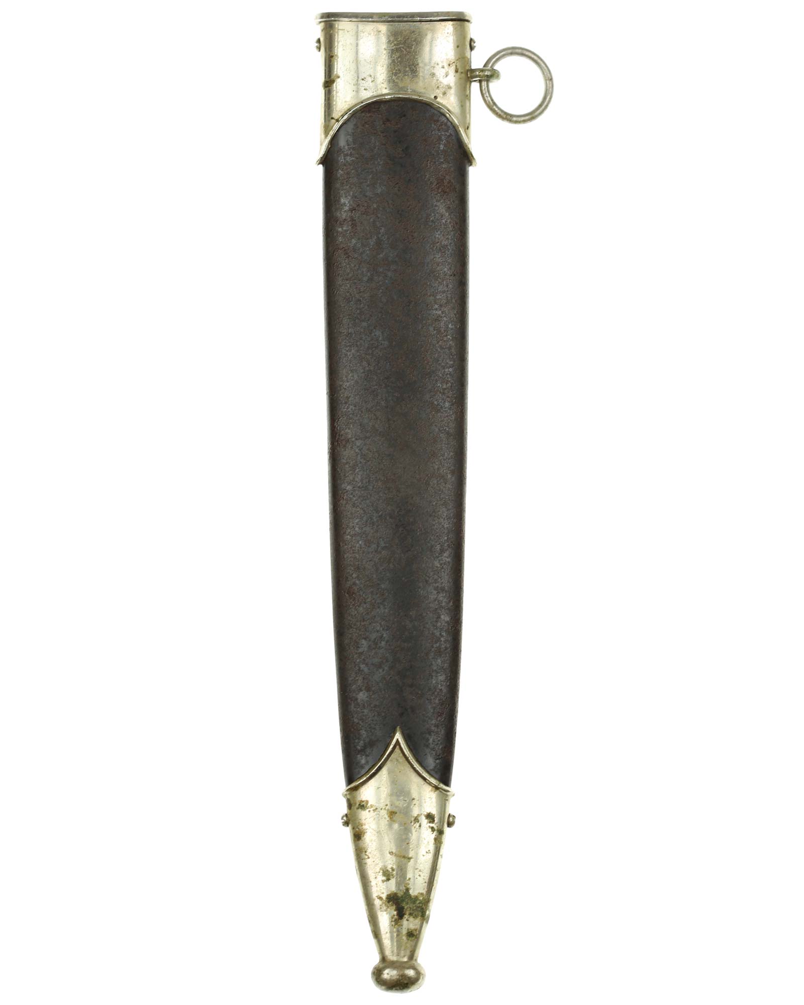 Рукоять: Металлические элементы гарды мельхиоровые, вмонтированный в рукоять орел также изготовлен из мельхиора, что свидетельствует о раннем выпуске кинжала. Рукоять изготовлена из мореного в черный цвет дерева.