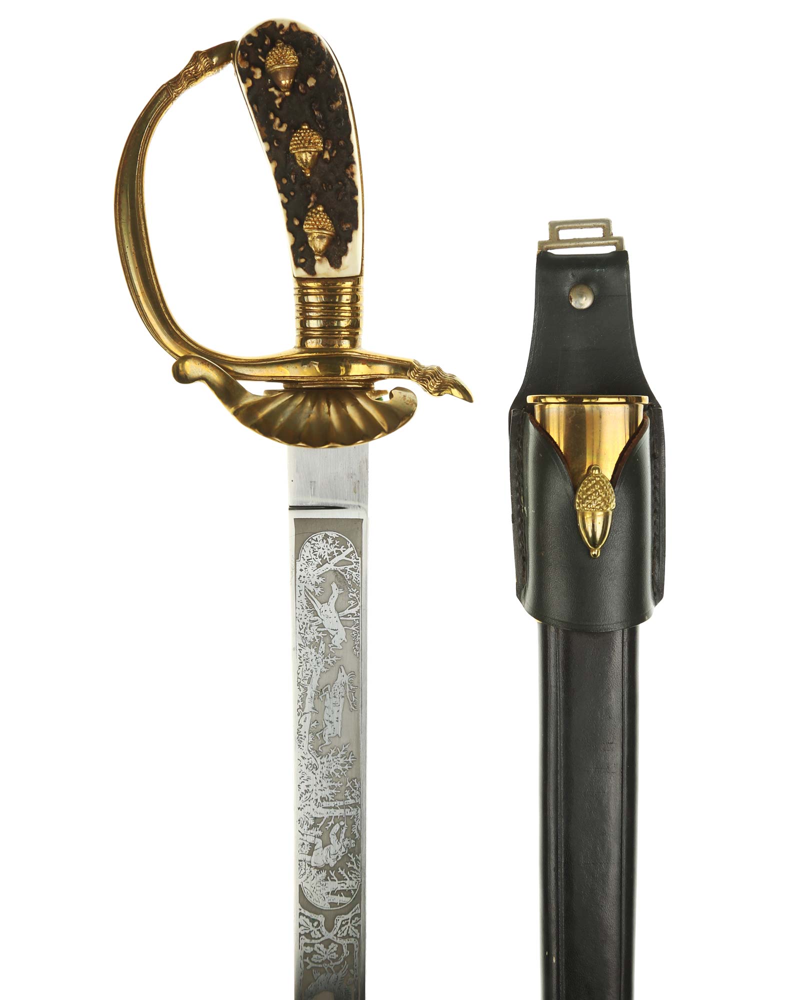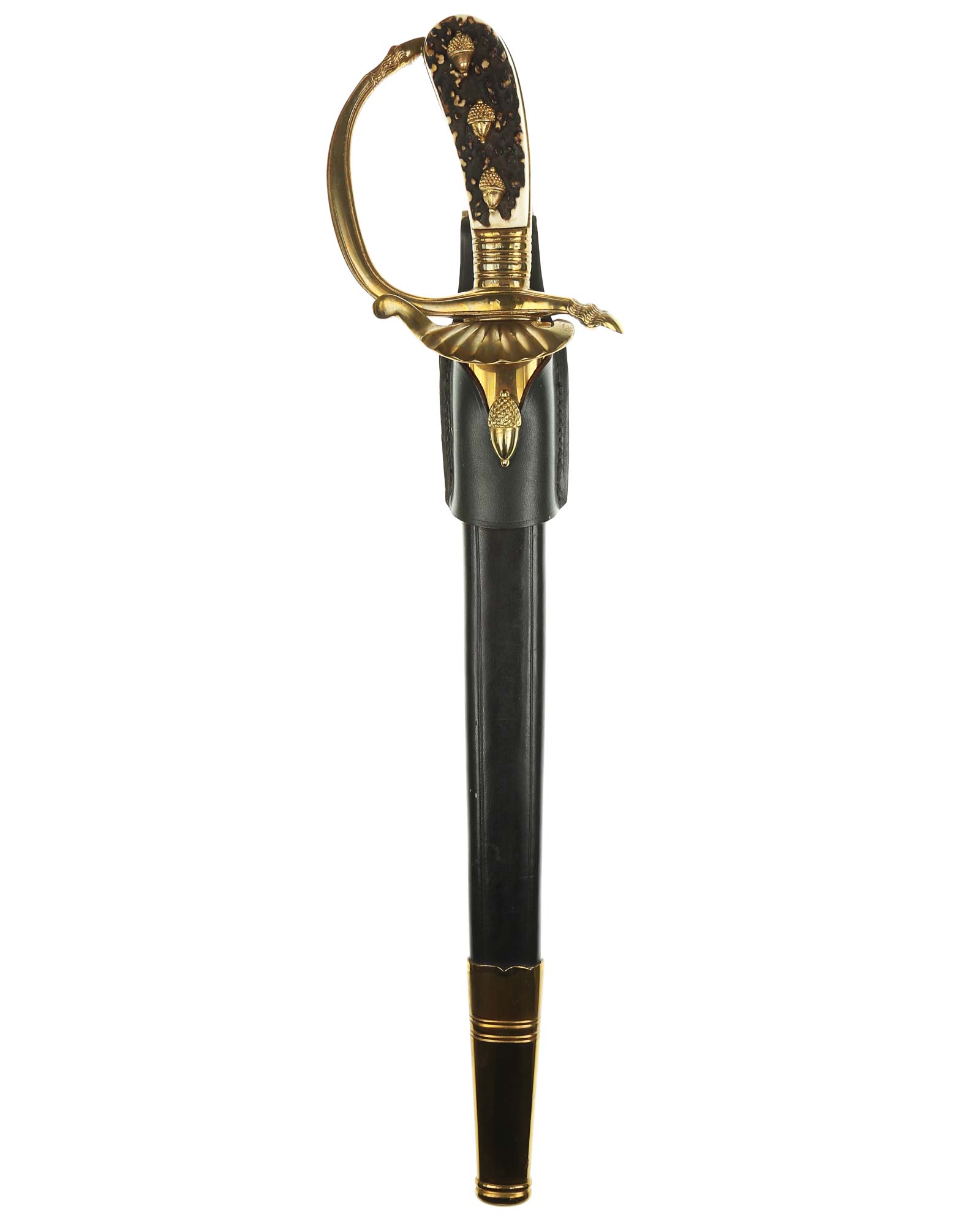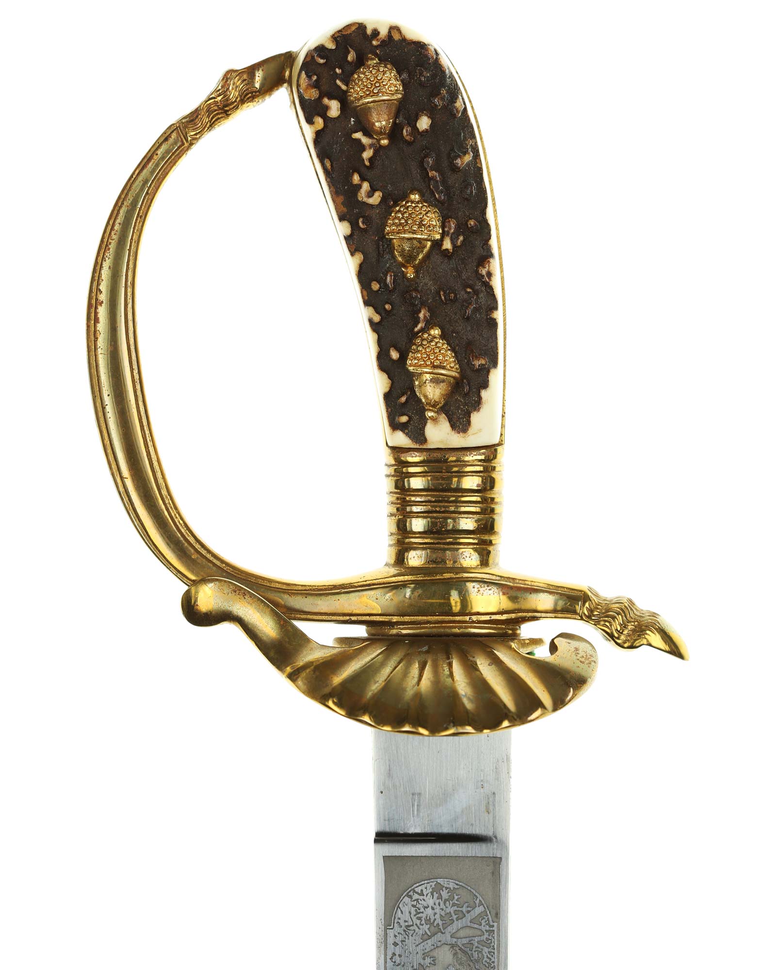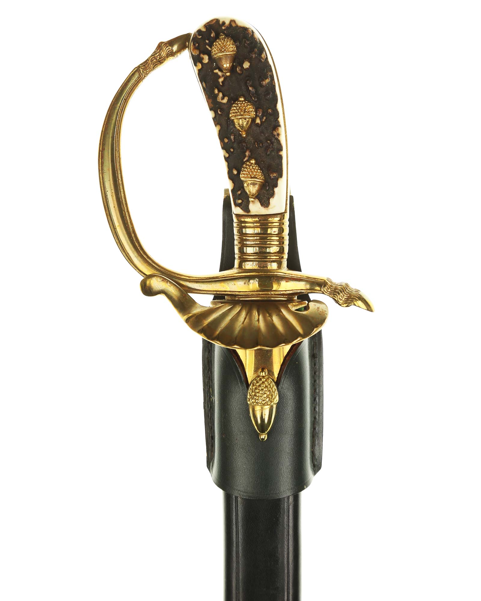 Рукоять: Эфес состоит из гарды, рукояти и декоративного щитка. Прибор эфеса выполнен из белого металла и покрыт золотым лаком. Крестовина образована защитной дужкой, направленной одной стороной к навершию, а второй в противоположную сторону. Под крестовиной установлен щитик. Рукоять образована двумя щечками из кости. На щечках с двух сторон расположены бронзовые накладки в виде желудей.