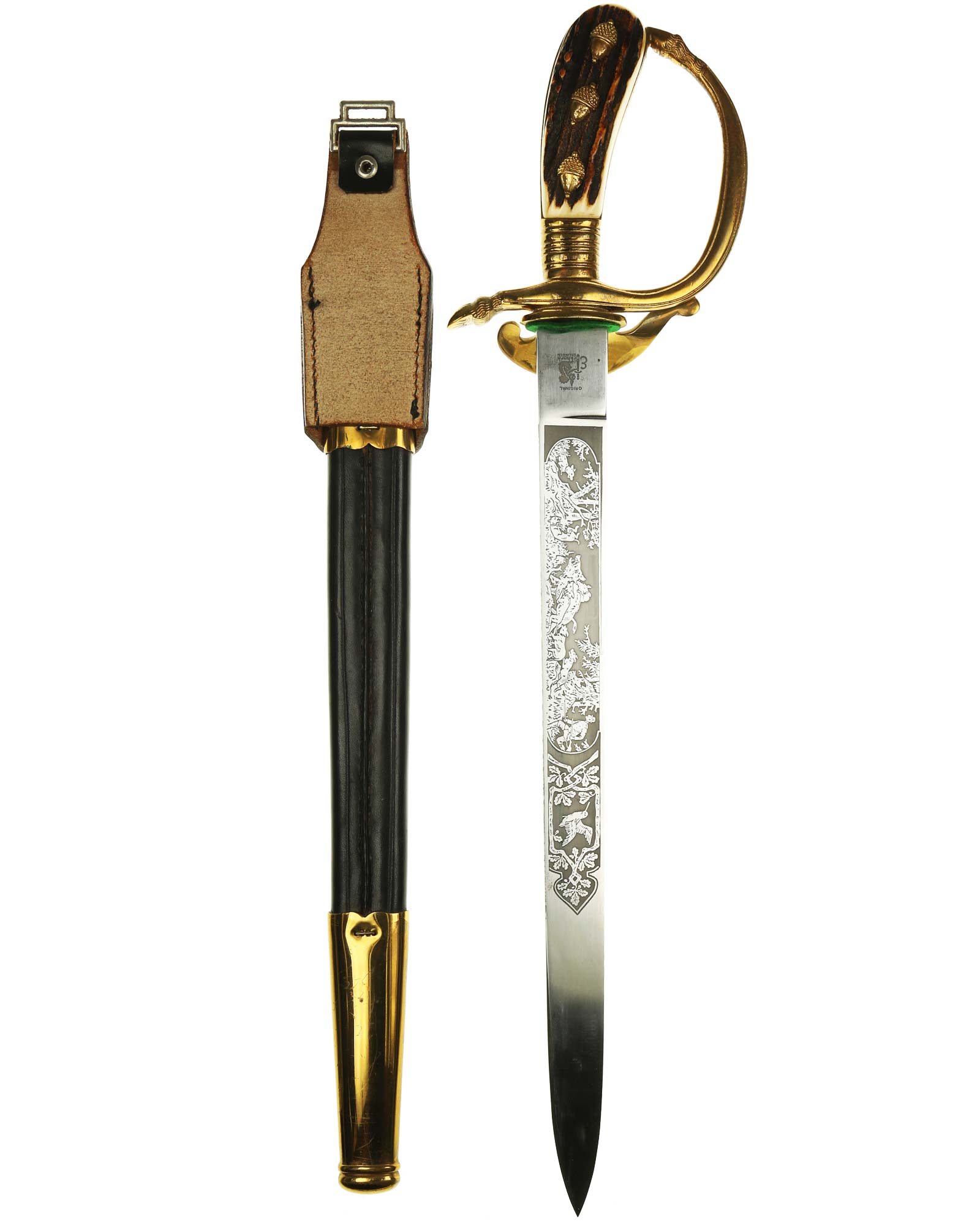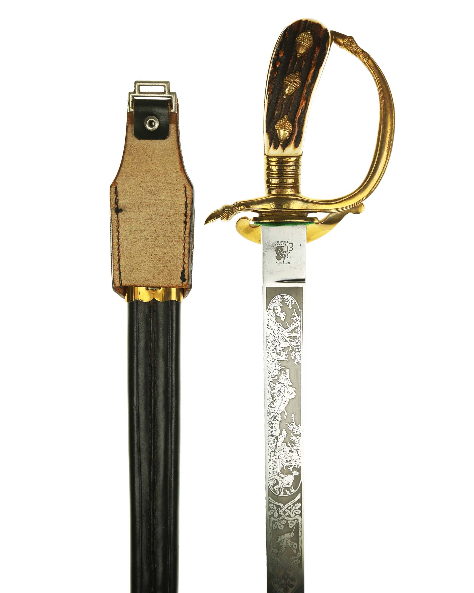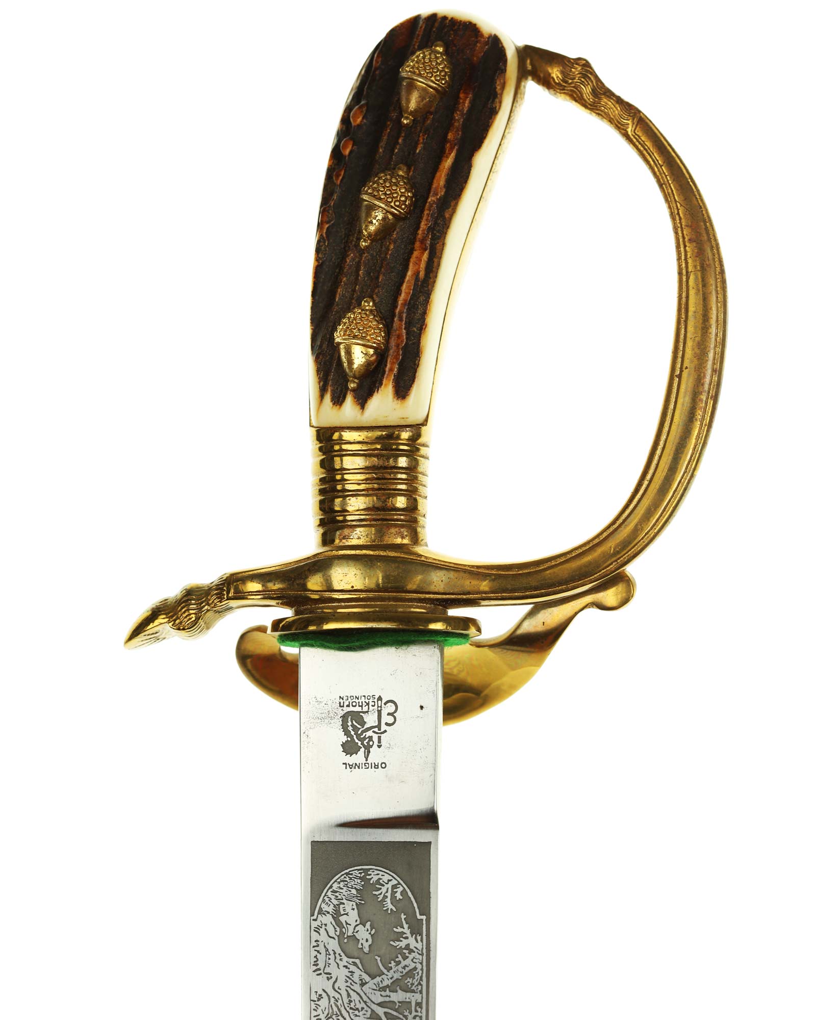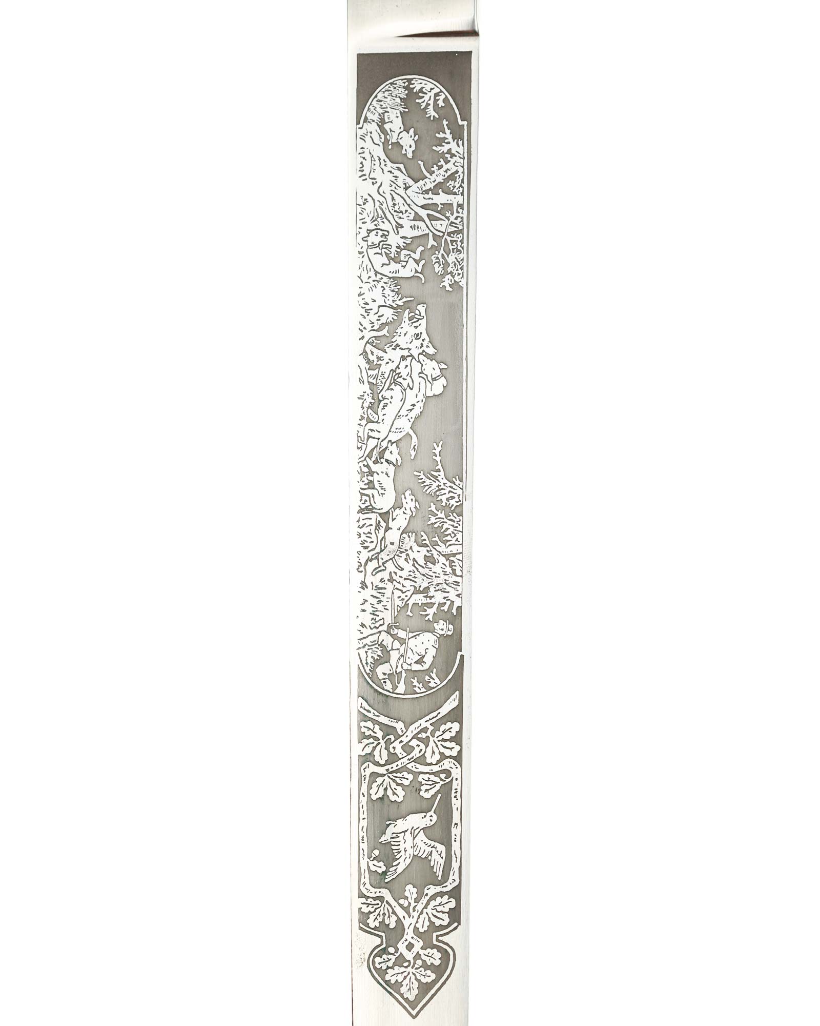 Клинок: Клинок прямой, стальной, двулезвийный, плоский, с двух сторон украшен травленым орнаментом с изображением охотничьих сцен. На пяте клинка клеймо производителя - «Original Eickhorn Solingen», клеймо немецкой фирмы «Карл Айкхорн Золинген».