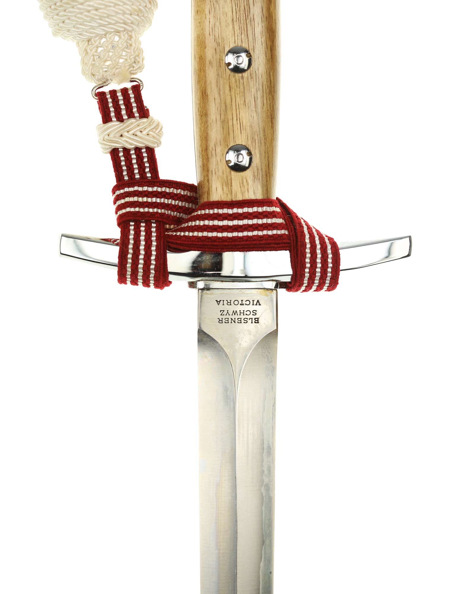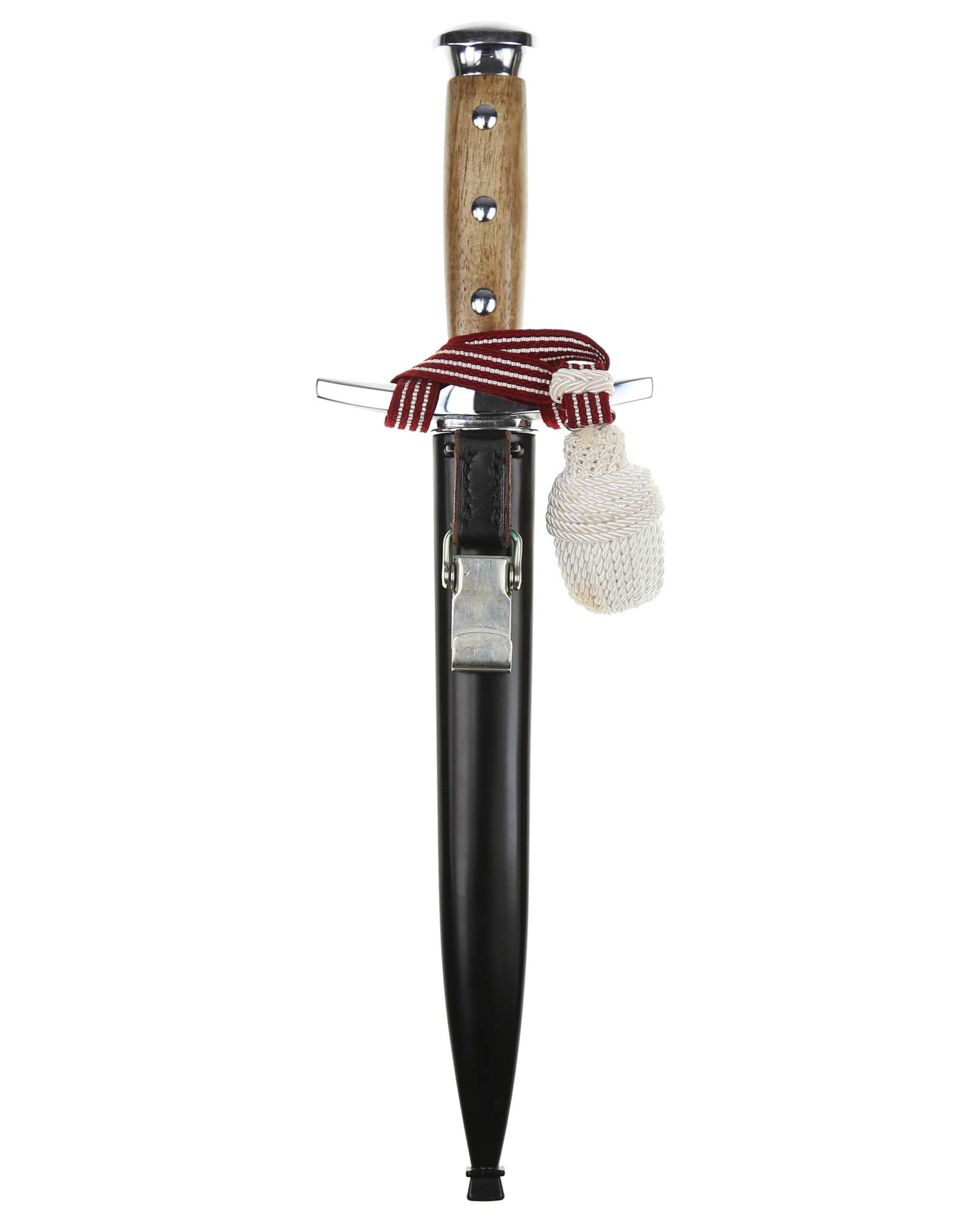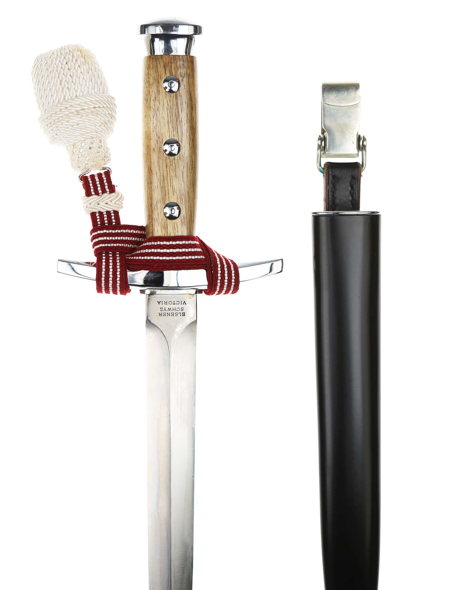 Кортик армейский офицерский и унтер-офицерский обр. 1943 г. Рукоять металлическая, с двумя деревянными лакированными накладками по бокам. Накладки скреплены между собой тремя металлическими штифтами. Головка рукояти металлическая, овального сечения. К кортику прилагаются подвеска и темляк. Клинок прямой, плоский, ромбического сечения. На пяте, с одной стороны, стоит клеймо производителя ELSENER SCHWYZ; с другой порядковый номер #212721. Ножны металлические, крашеные в черный цвет.