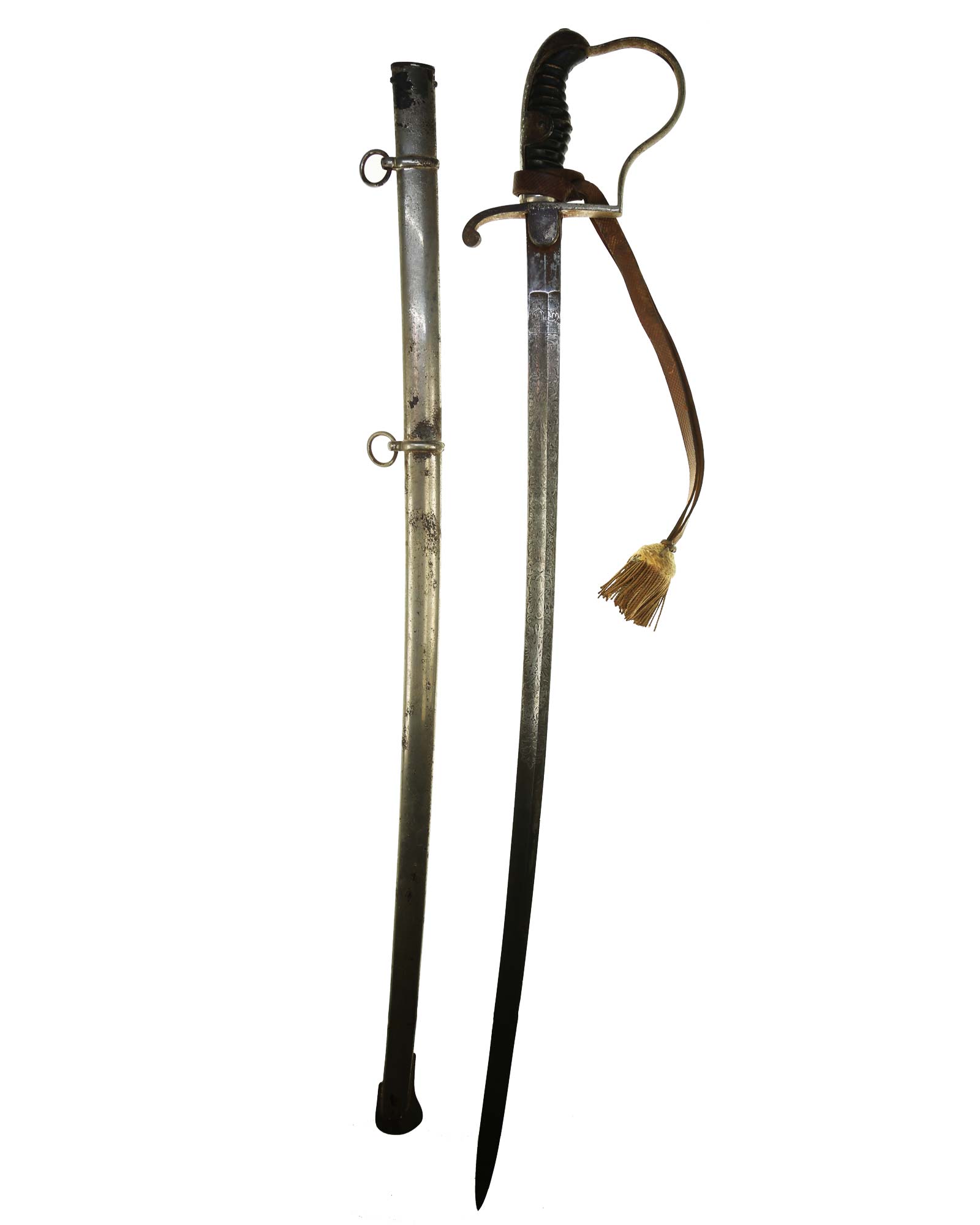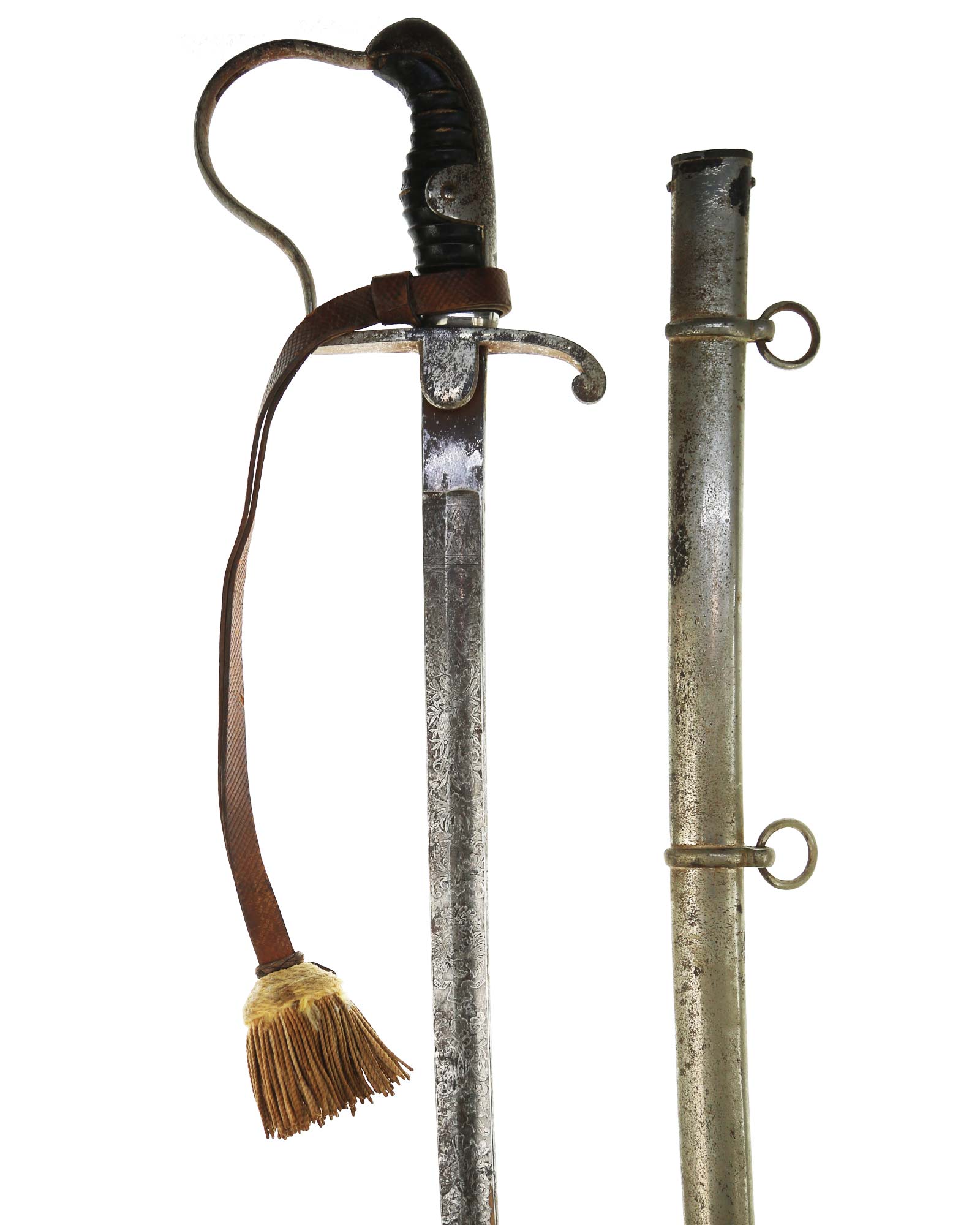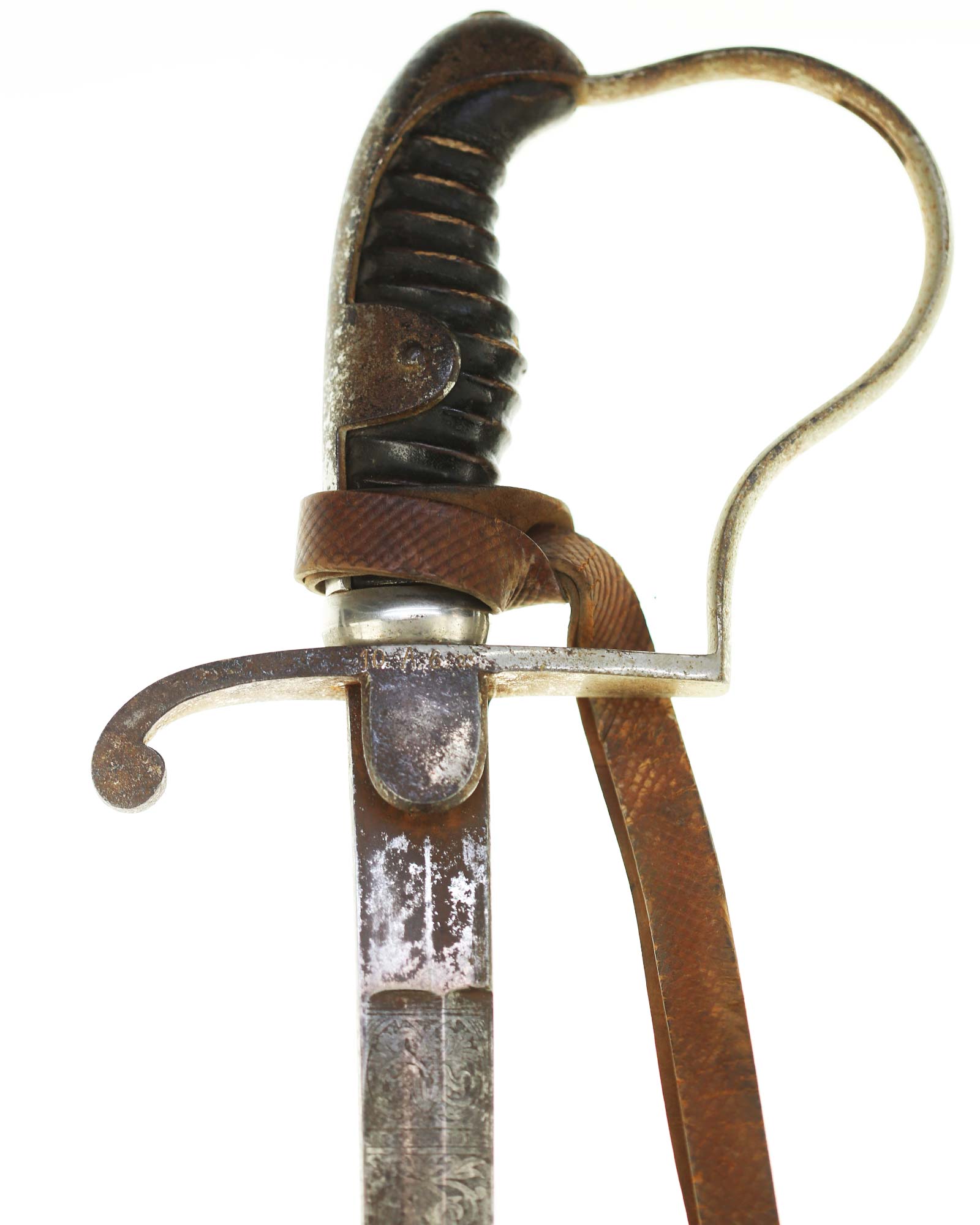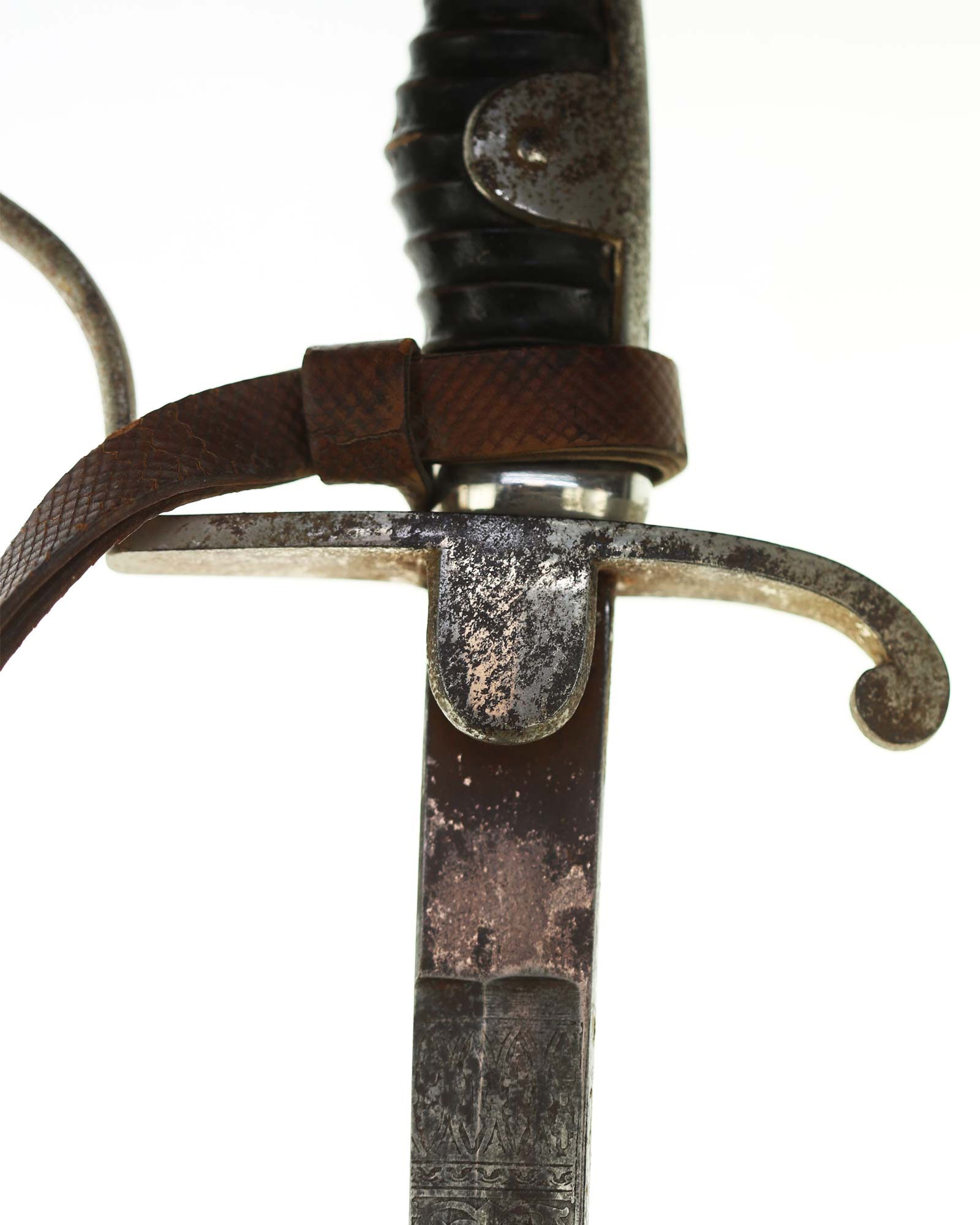 Прусская кавалерийская сабля с гравировкой. Гладкий сосуд с черной деревянной ручкой. Клинок протравлен. Ножны покрыты серебром. Перекресток пронумерован. Общий вес: 1118г. 970 мм.
