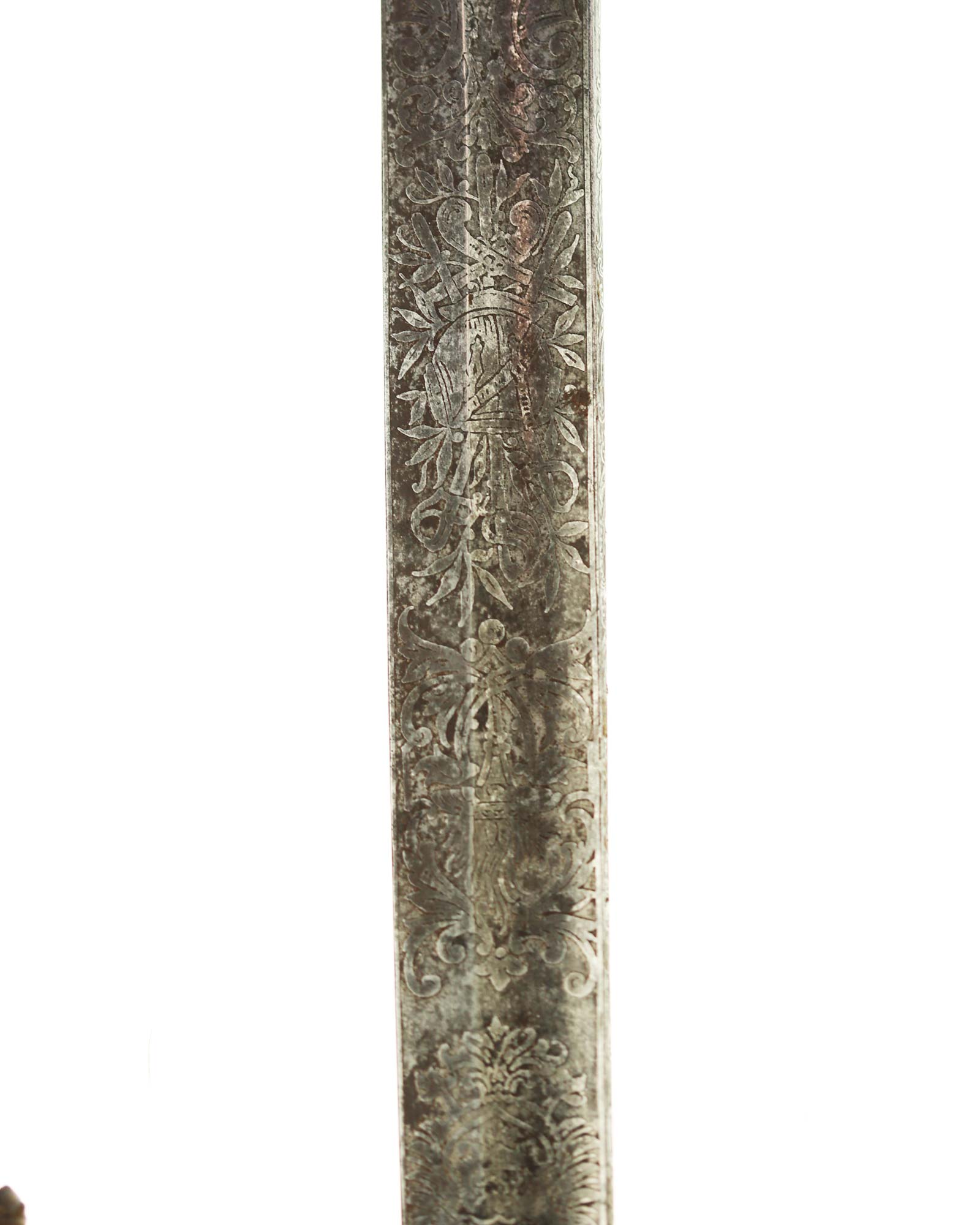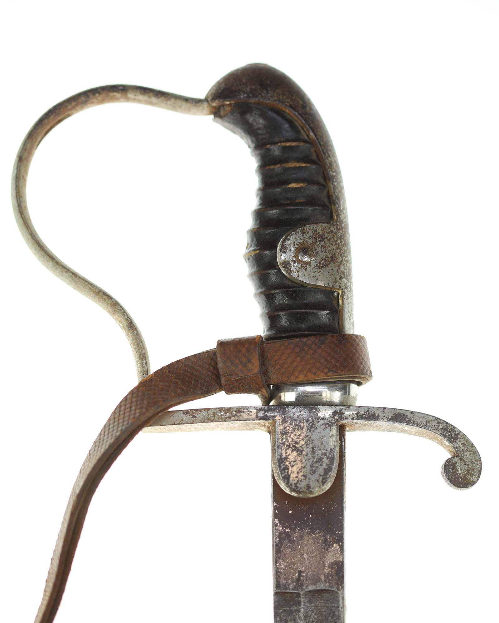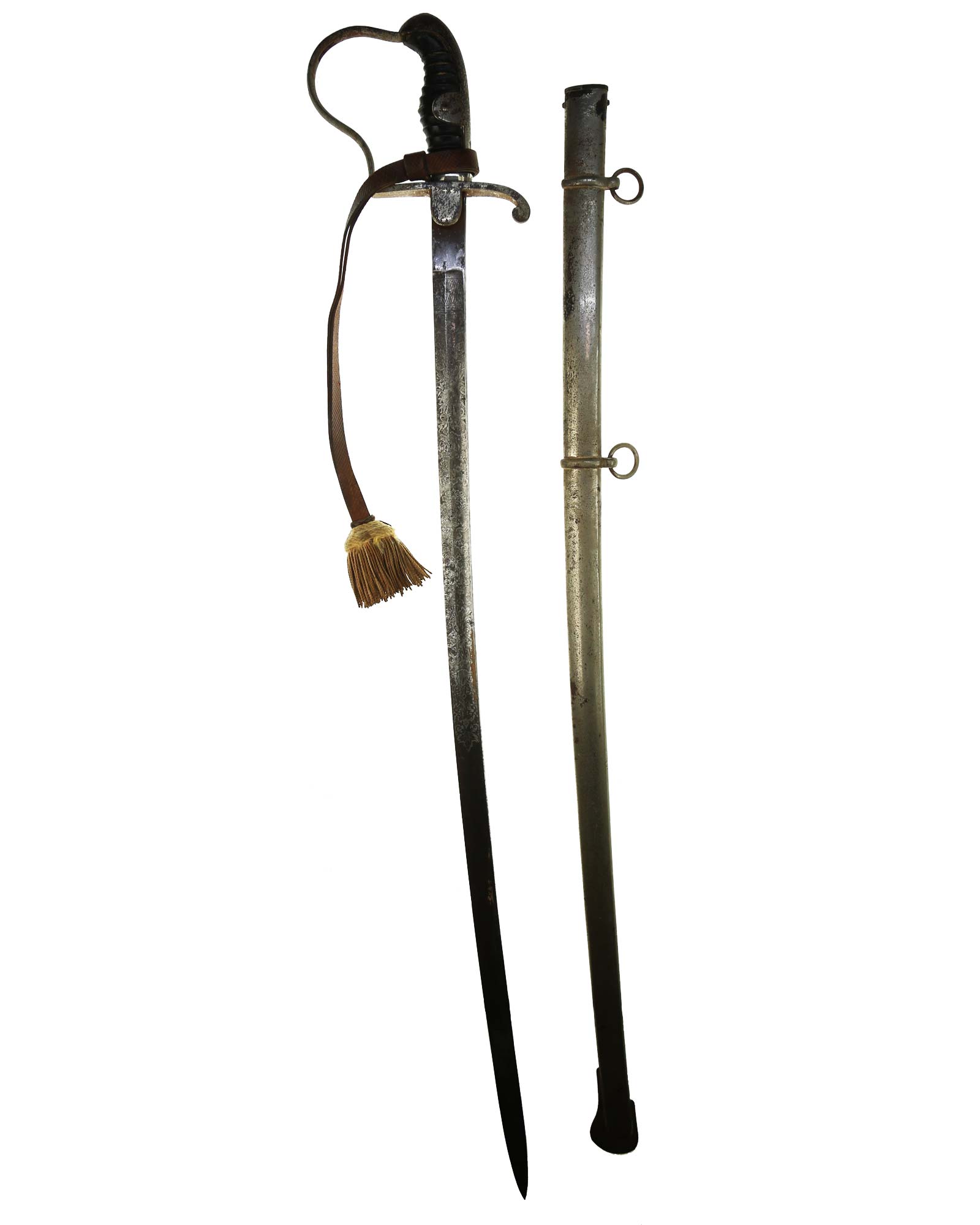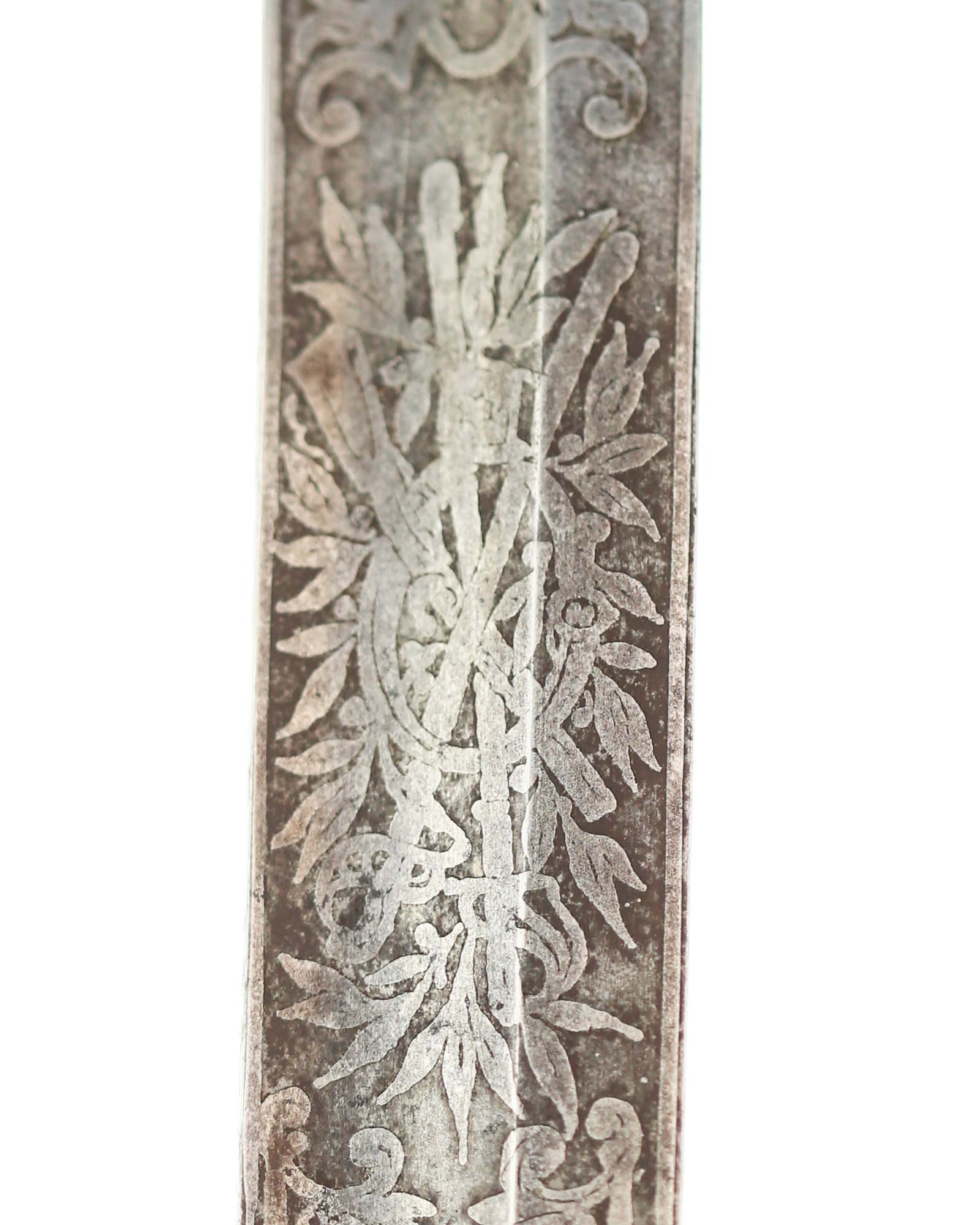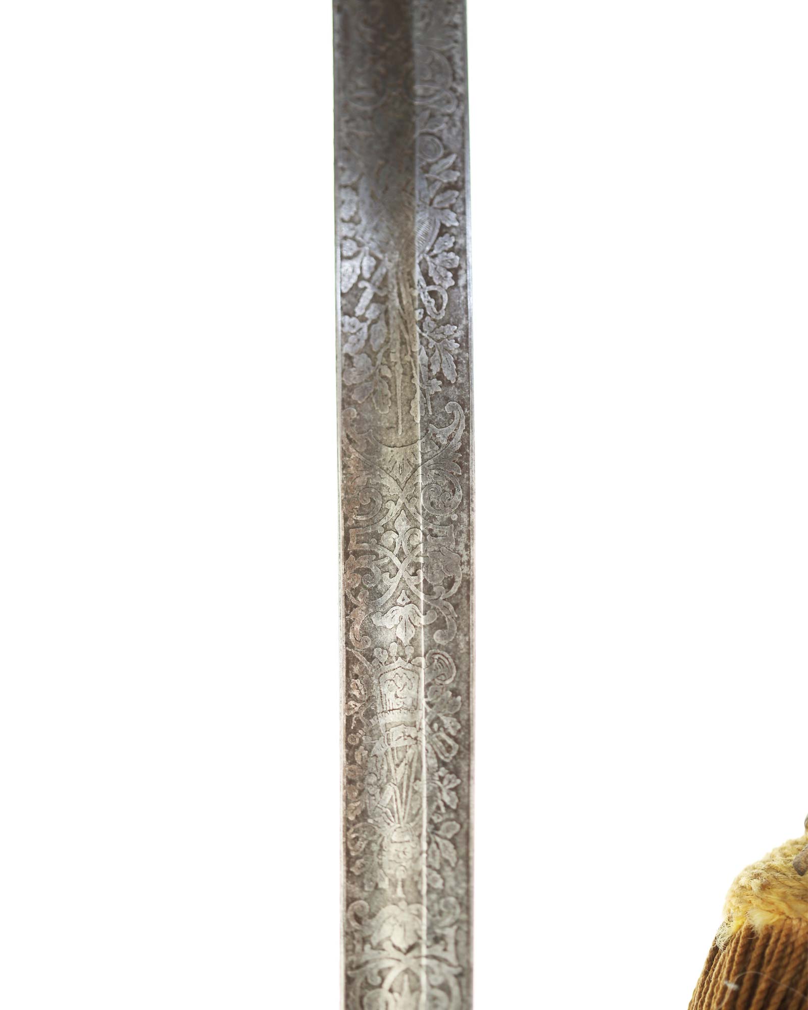Прусская кавалерийская сабля с гравировкой. Гладкий сосуд с черной деревянной ручкой. Клинок протравлен. Ножны покрыты серебром. Перекресток пронумерован. Общий вес: 1118г. 970 мм.