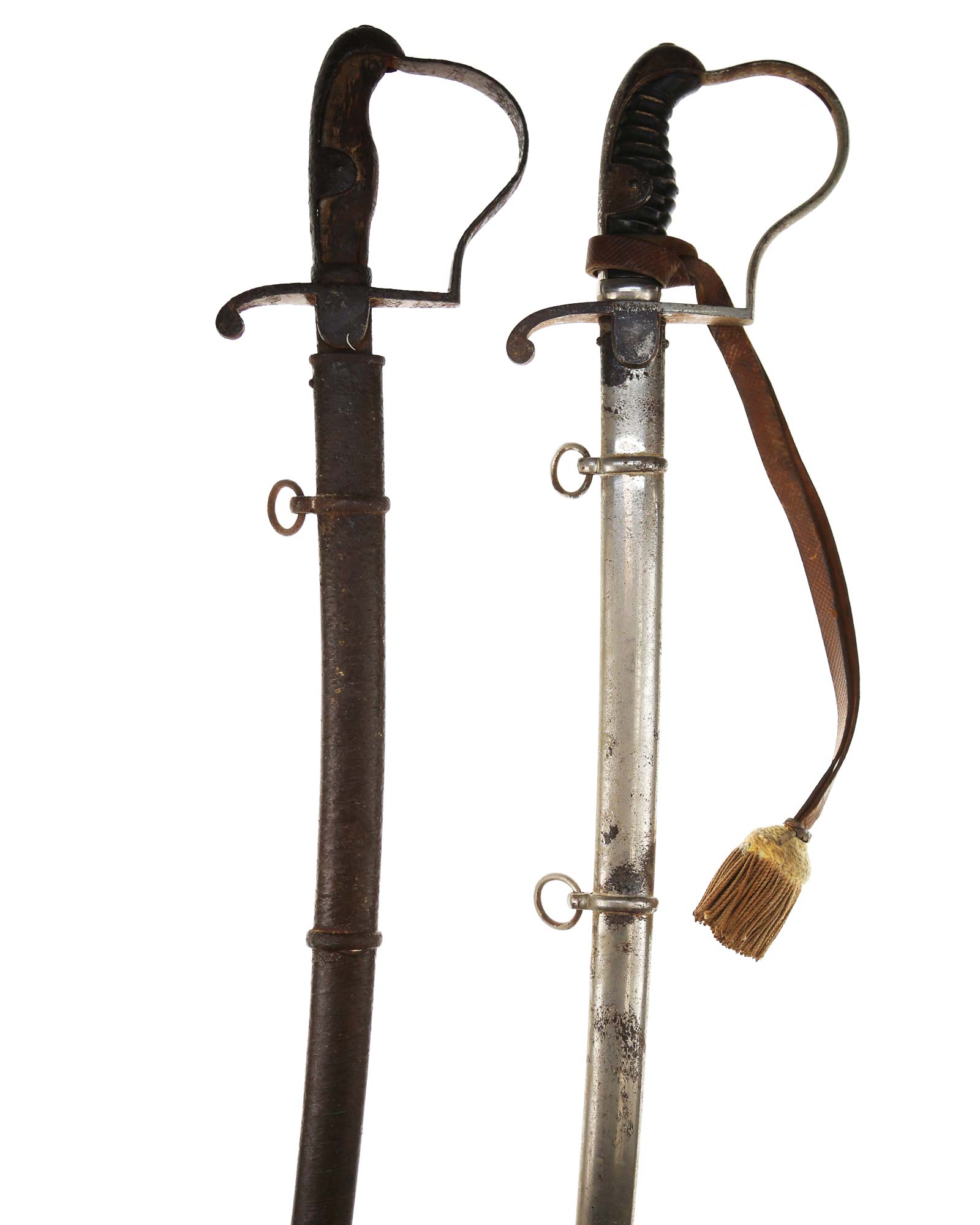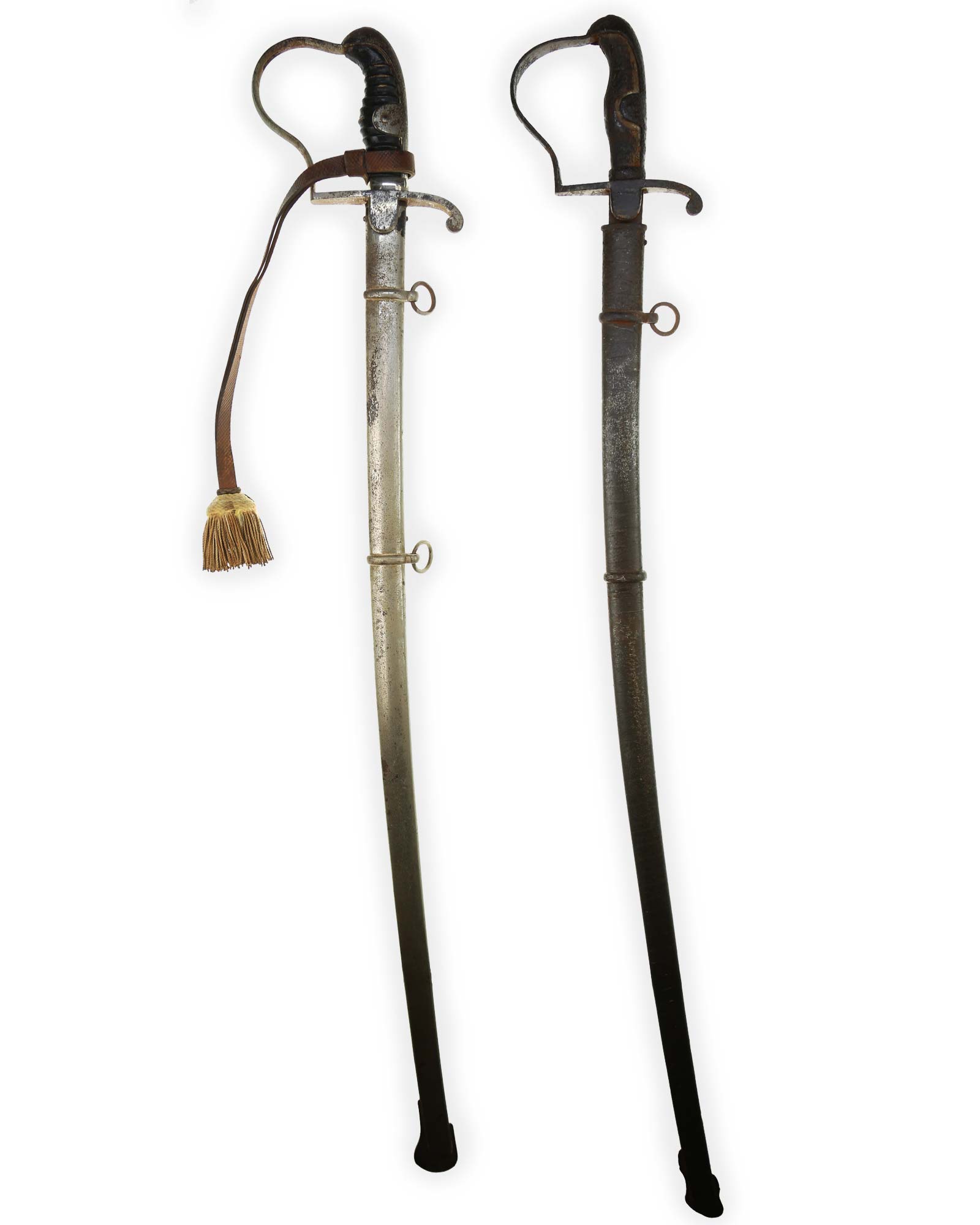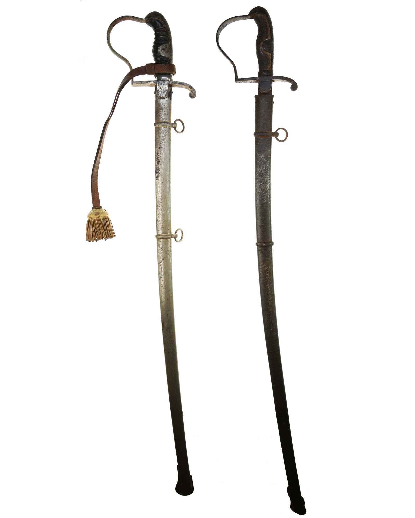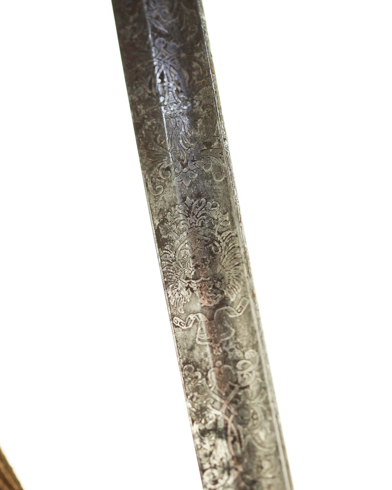 Прусская кавалерийская сабля с гравировкой. Гладкий сосуд с черной деревянной ручкой. Клинок протравлен. Ножны покрыты серебром. Перекресток пронумерован. Общий вес: 1118г. 970 мм.