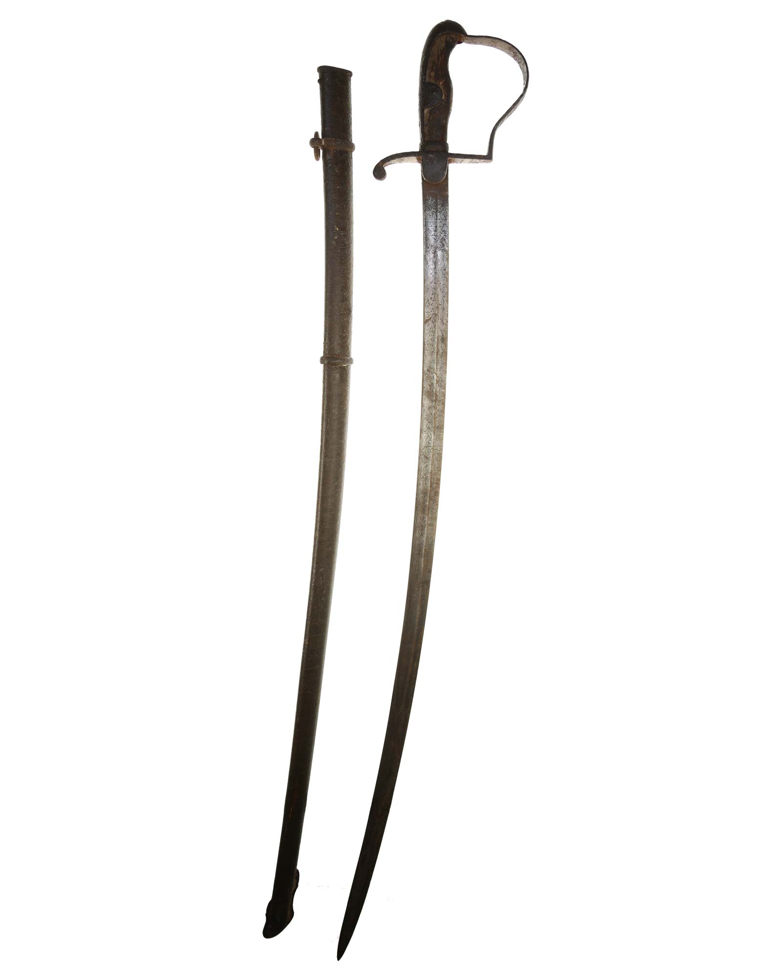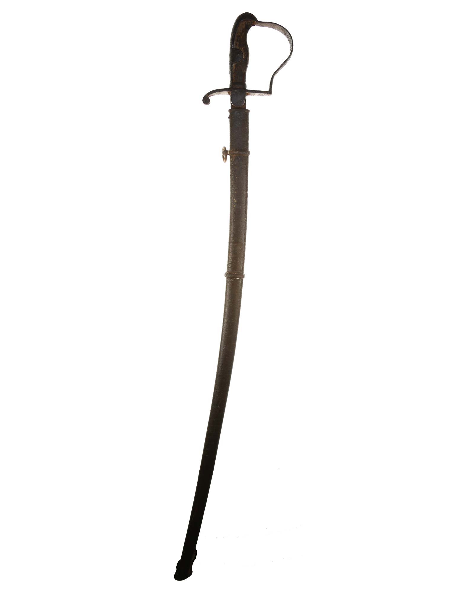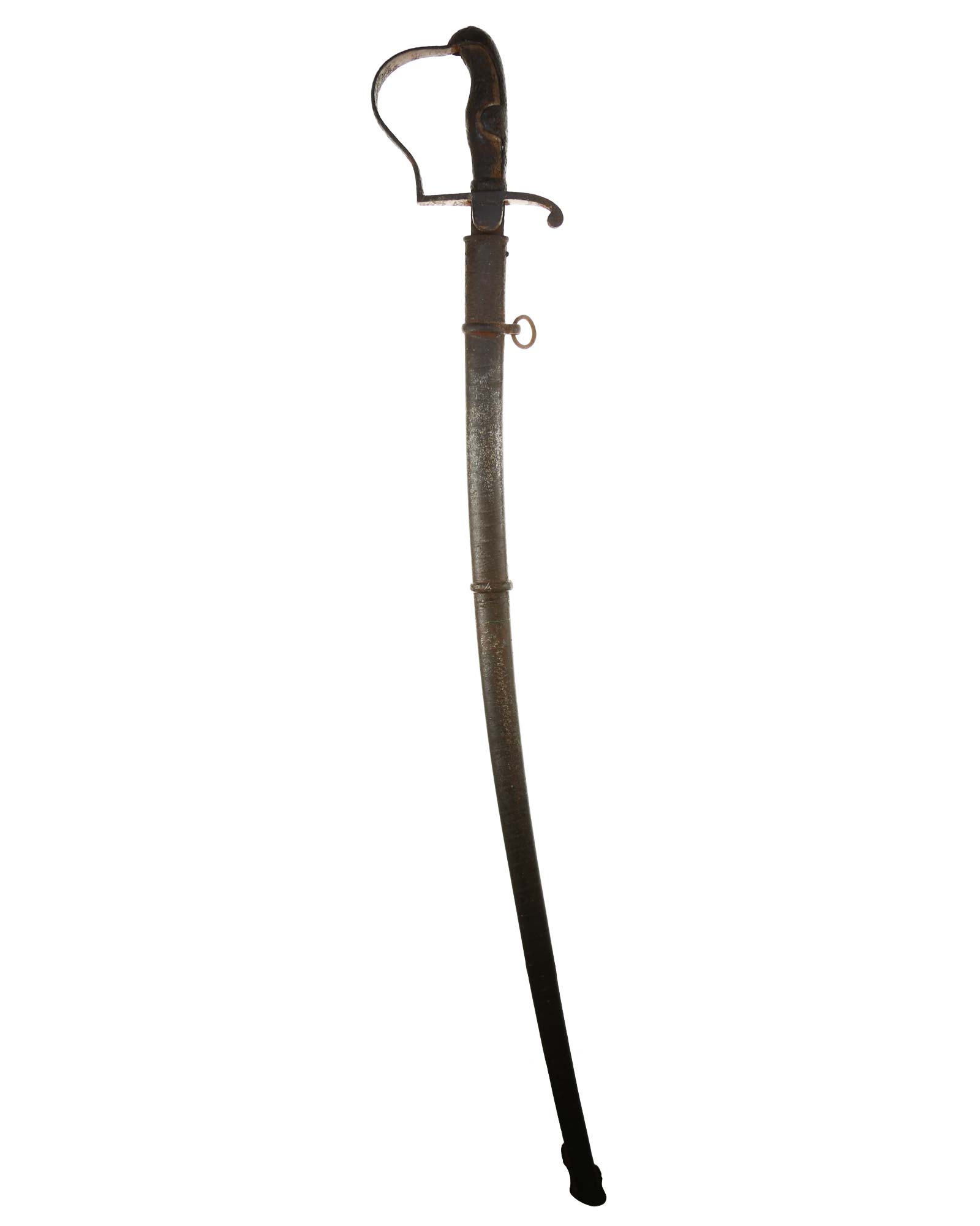 Прусская кавалерийская сабля с гравировкой. Гладкий сосуд с деревянной ручкой. Клинок протравлен. Ножны окрашены в черный цвет. Общий вес: 1055г. 990 мм.