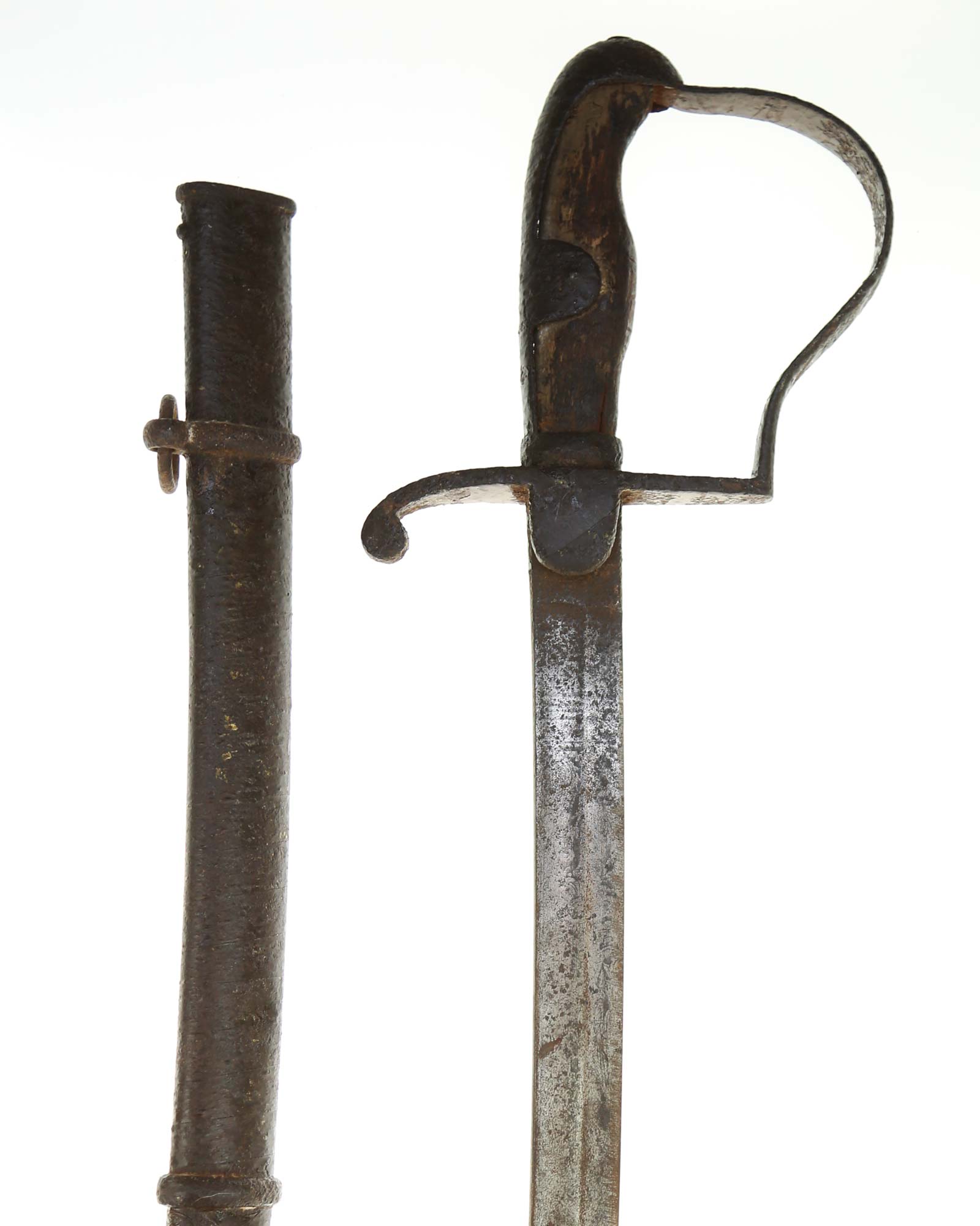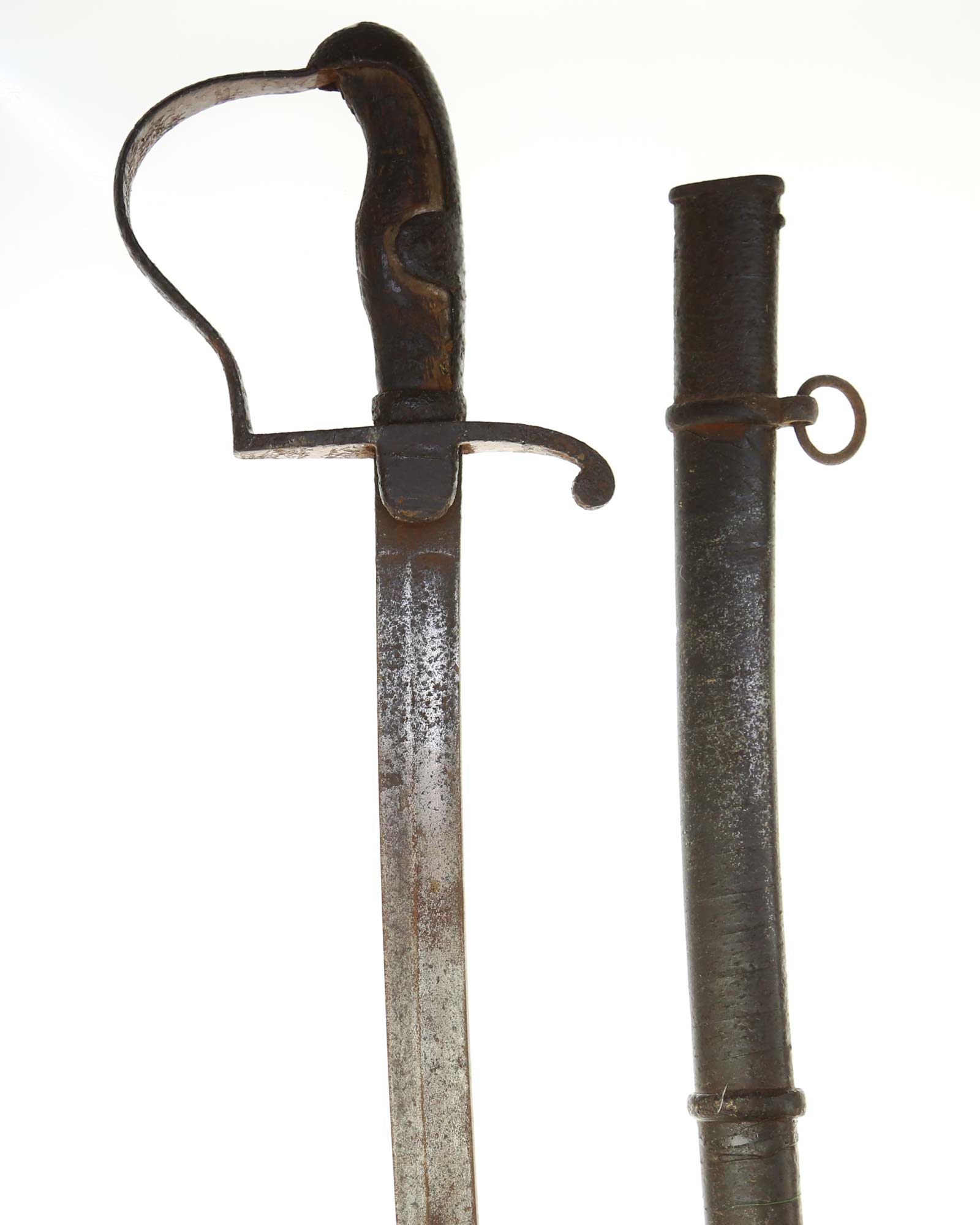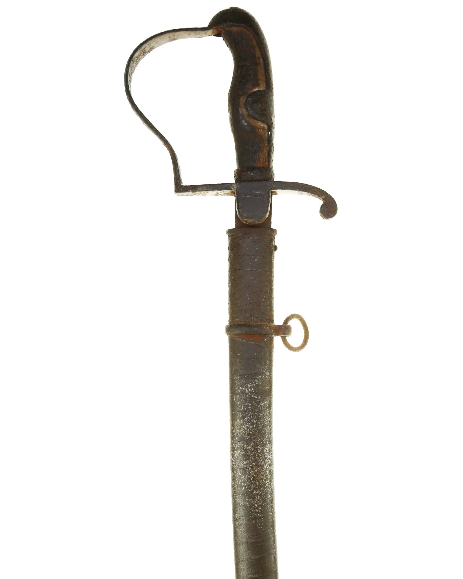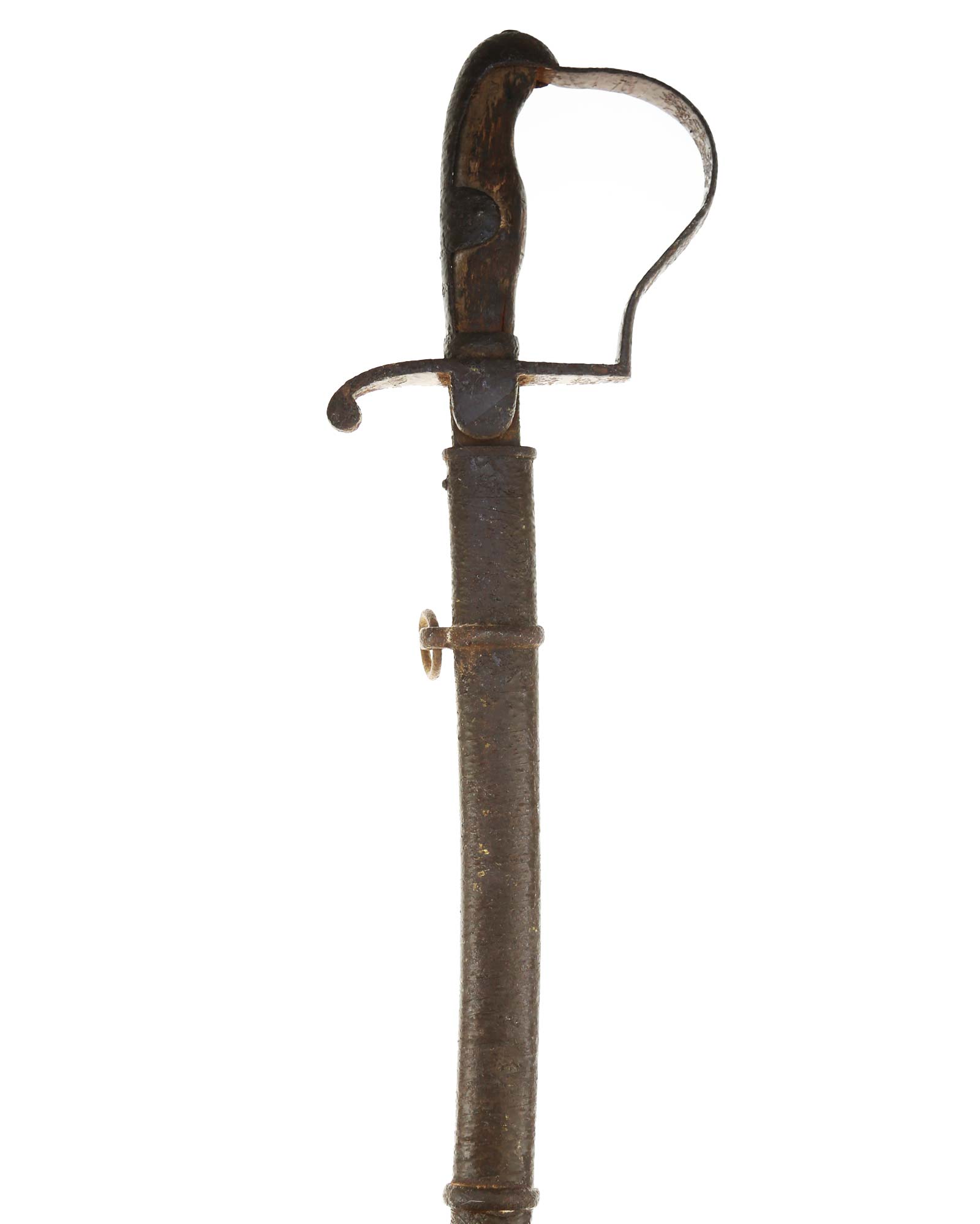 Прусская кавалерийская сабля с гравировкой. Гладкий сосуд с деревянной ручкой. Клинок протравлен. Ножны окрашены в черный цвет. Общий вес: 1055г. 990 мм.