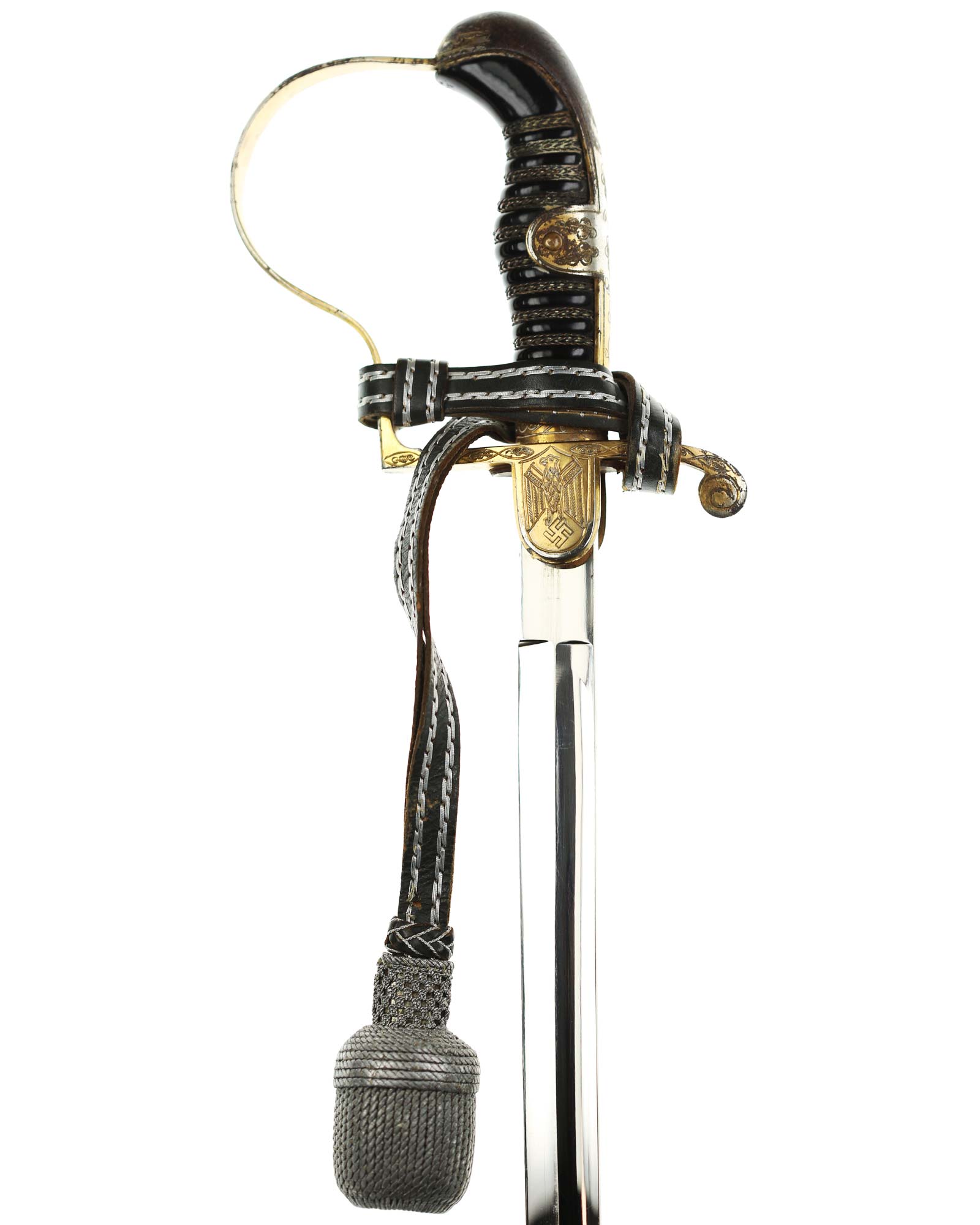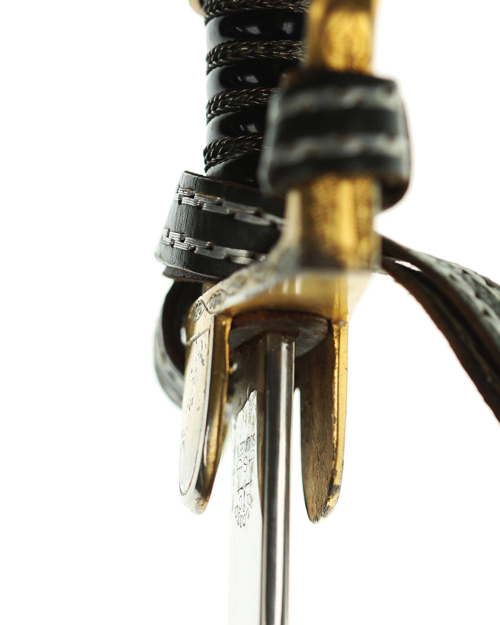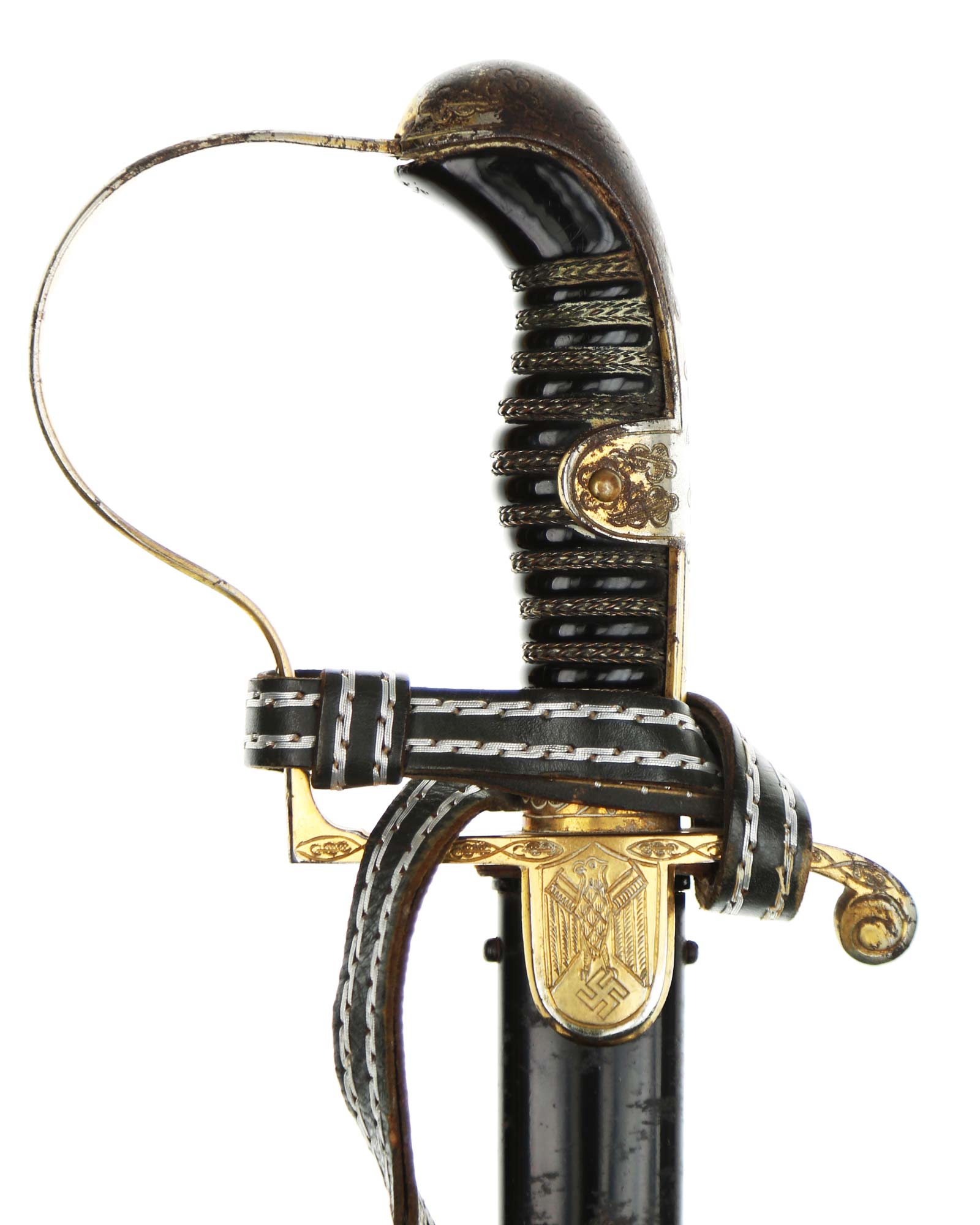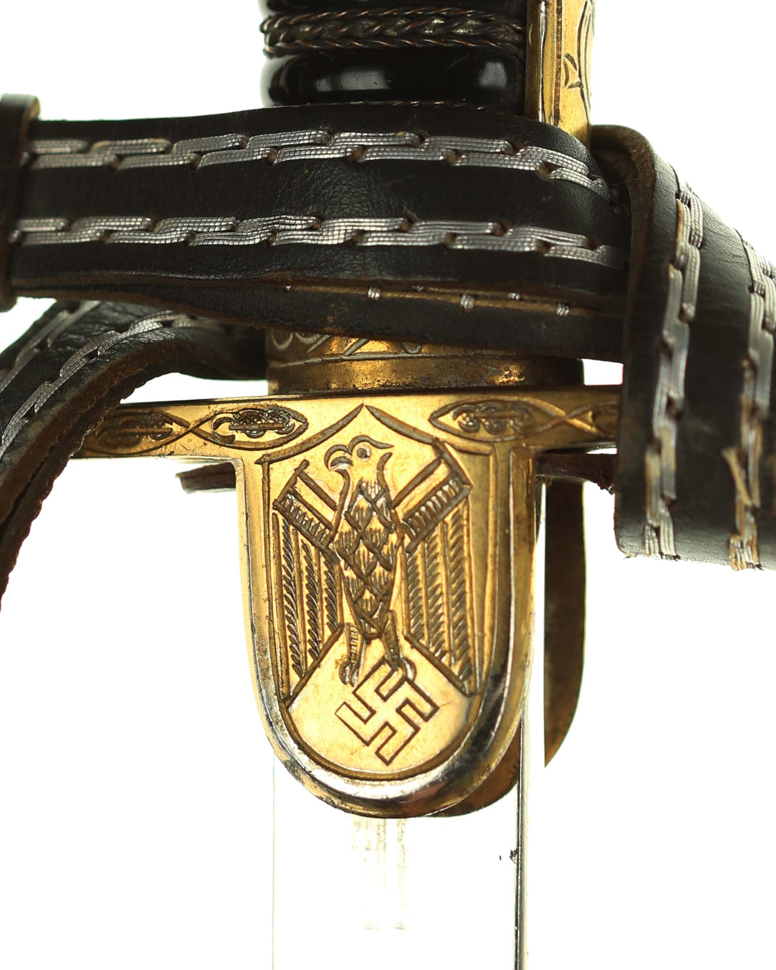 Рукоять: Эфес «блюхеровского» типа, состоит из рукояти и гарды. Гарда латунная, с одной защитной дужкой, переходящей под прямым углом в крестовину рукояти, дальний конец которой загнут вниз по направлению к обуху клинка. В центре крестовины располагаются два декоративных щитика, на одном из которых имеется войсковая эмблема Вермахта в виде орла, на другой декоративный медальон. Рукоять бакелитовая, с горизонтальными желобками, перевитыми металлической проволокой. Спинка рукояти сплошная, с растительным орнаментом по центру, плавно переходящая в головку, выполненную в виде головы льва. В глазах льва вставлено два красных камня. В центре спинки рукояти имеется декоративное расширение.