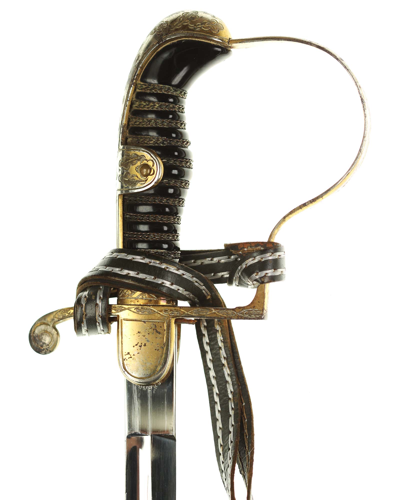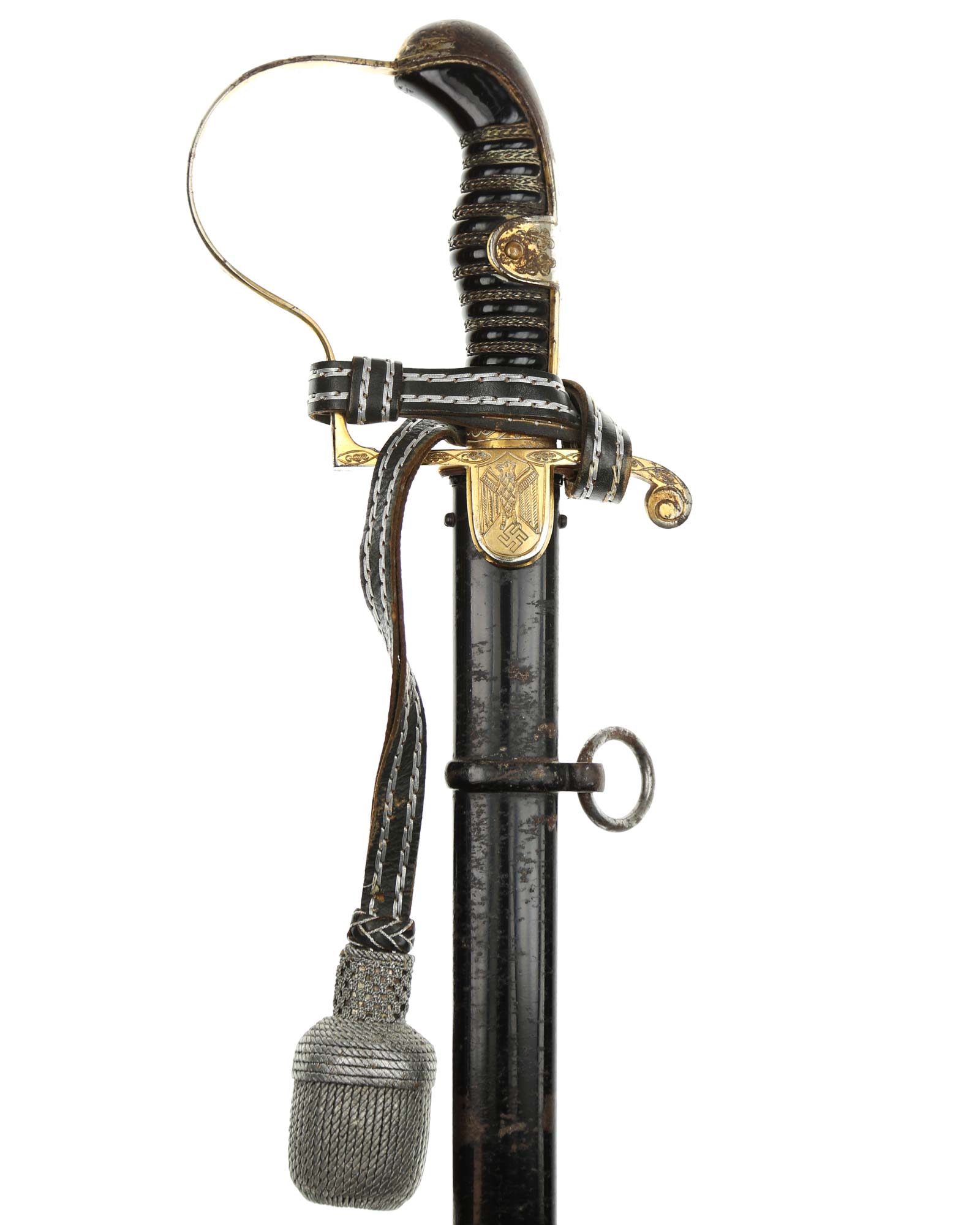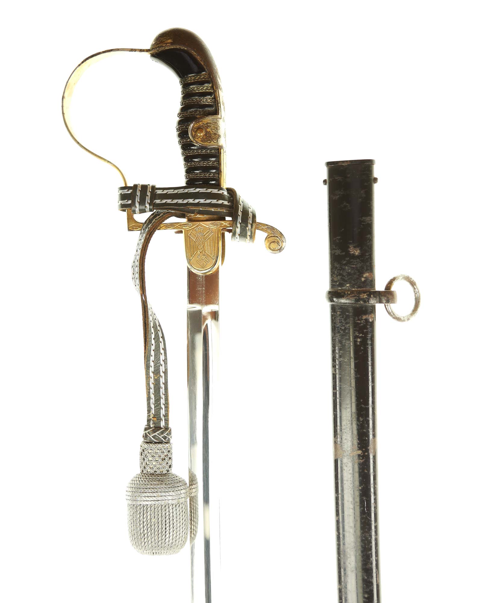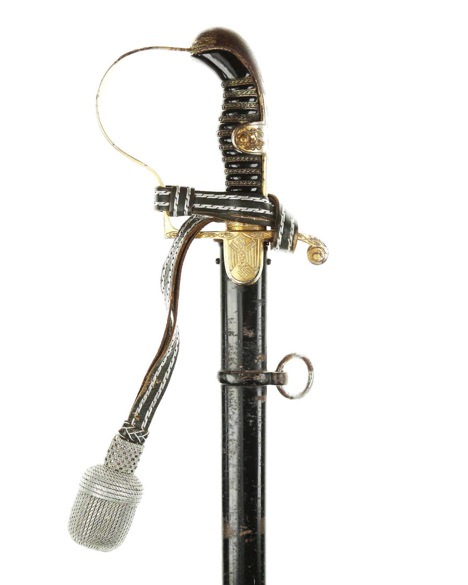 Рукоять: Эфес «блюхеровского» типа, состоит из рукояти и гарды. Гарда латунная, с одной защитной дужкой, переходящей под прямым углом в крестовину рукояти, дальний конец которой загнут вниз по направлению к обуху клинка. В центре крестовины располагаются два декоративных щитика, на одном из которых имеется войсковая эмблема Вермахта в виде орла, на другой декоративный медальон. Рукоять бакелитовая, с горизонтальными желобками, перевитыми металлической проволокой. Спинка рукояти сплошная, с растительным орнаментом по центру, плавно переходящая в головку, выполненную в виде головы льва. В глазах льва вставлено два красных камня. В центре спинки рукояти имеется декоративное расширение.