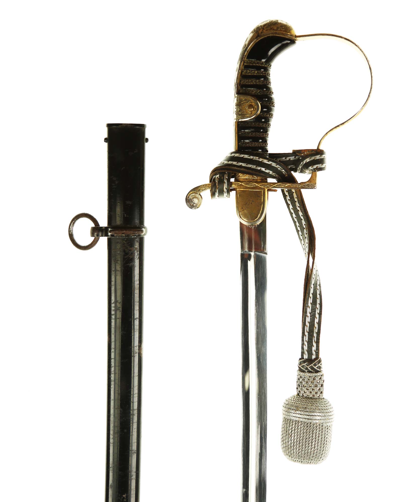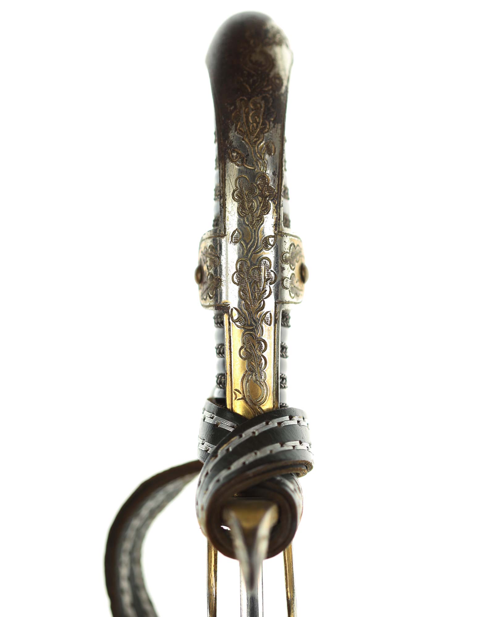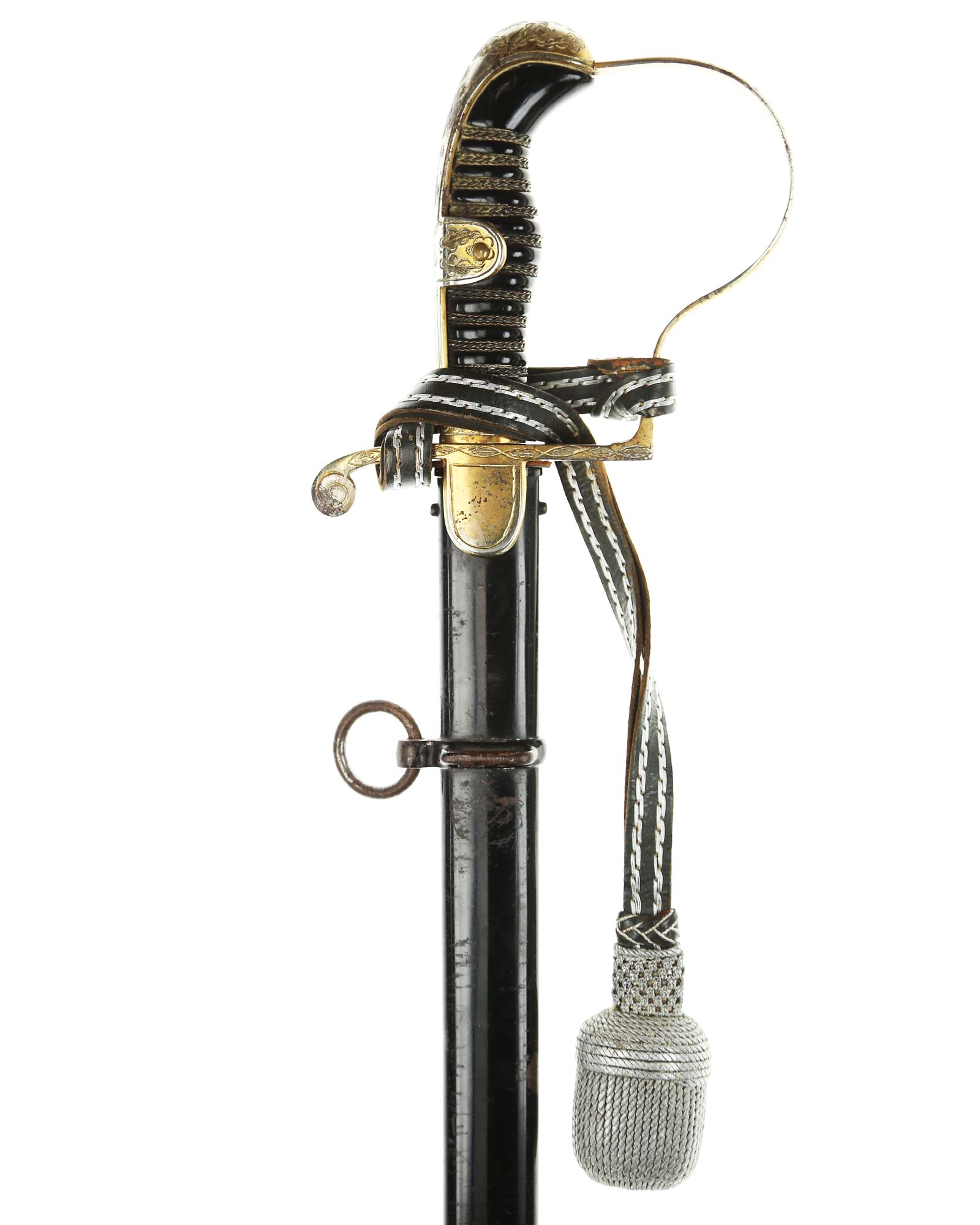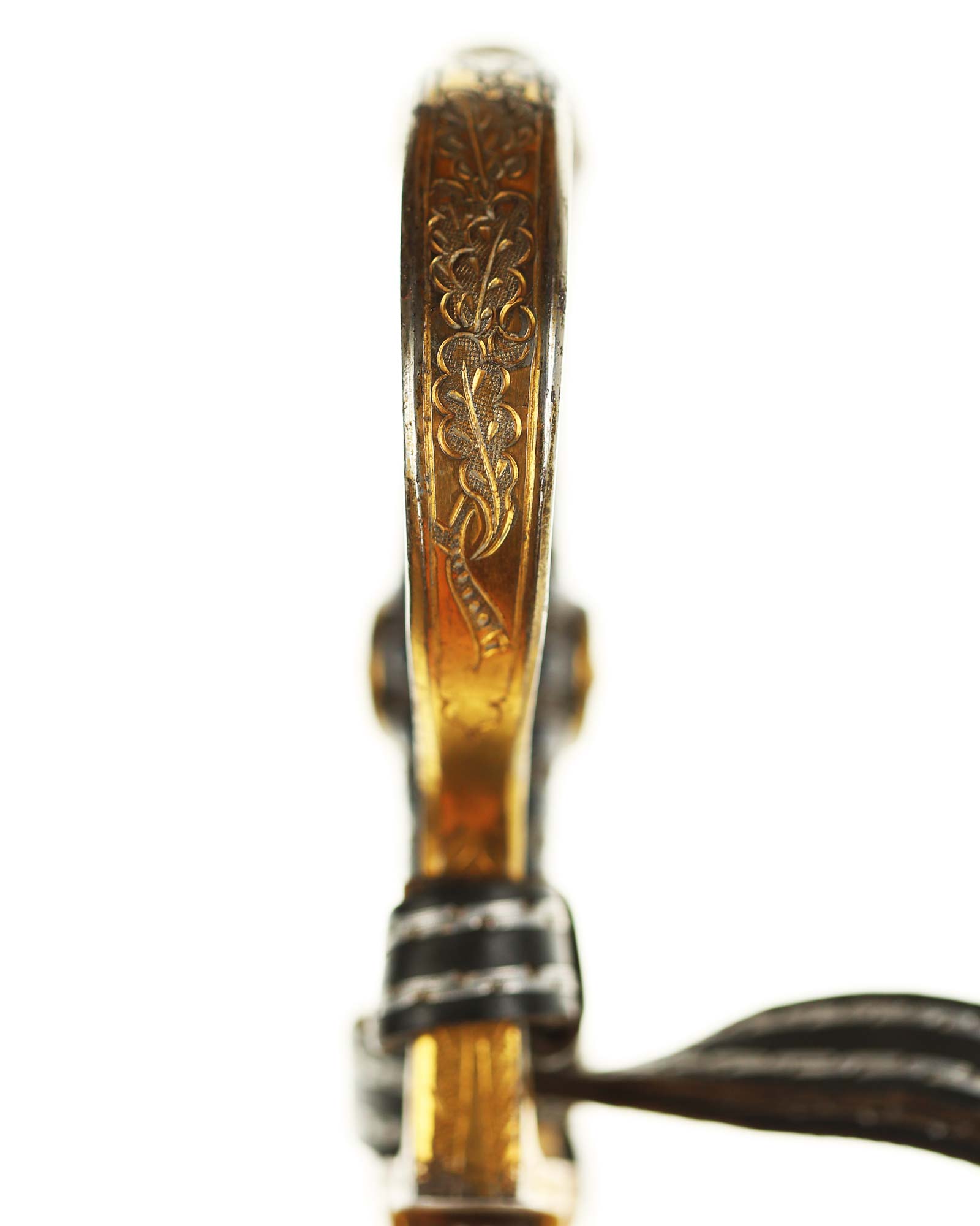 Рукоять: Эфес «блюхеровского» типа, состоит из рукояти и гарды. Гарда латунная, с одной защитной дужкой, переходящей под прямым углом в крестовину рукояти, дальний конец которой загнут вниз по направлению к обуху клинка. В центре крестовины располагаются два декоративных щитика, на одном из которых имеется войсковая эмблема Вермахта в виде орла, на другой декоративный медальон. Рукоять бакелитовая, с горизонтальными желобками, перевитыми металлической проволокой. Спинка рукояти сплошная, с растительным орнаментом по центру, плавно переходящая в головку, выполненную в виде головы льва. В глазах льва вставлено два красных камня. В центре спинки рукояти имеется декоративное расширение.