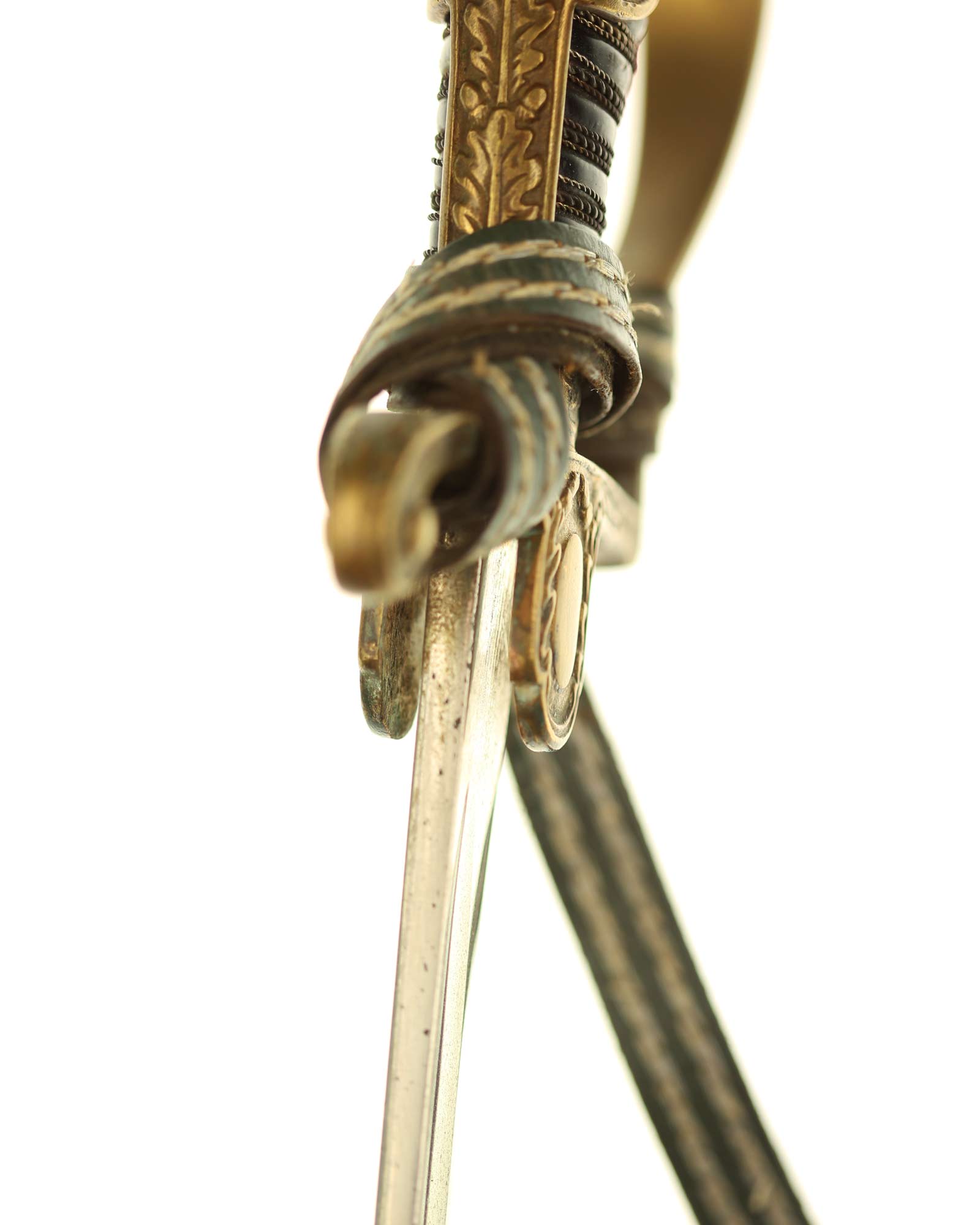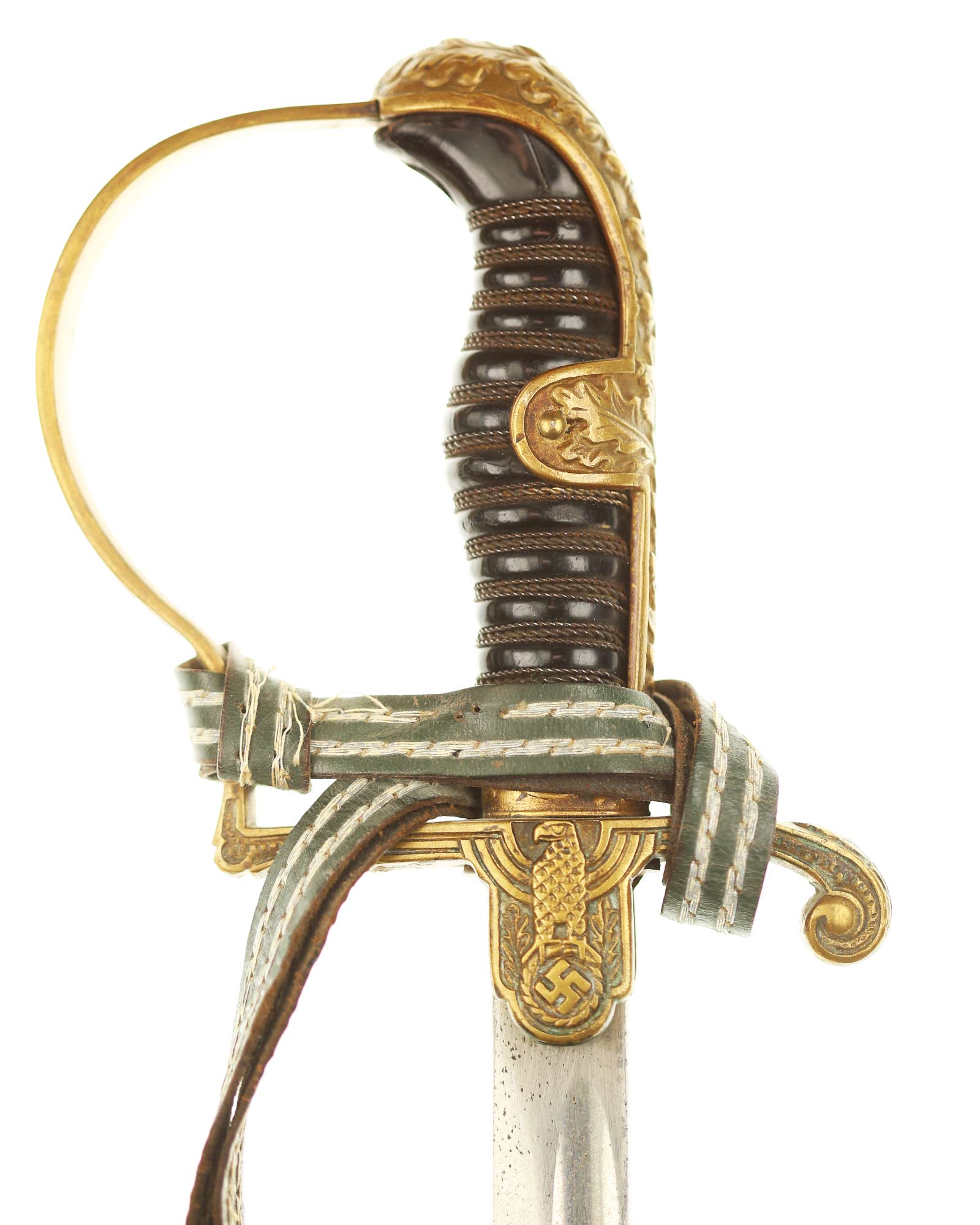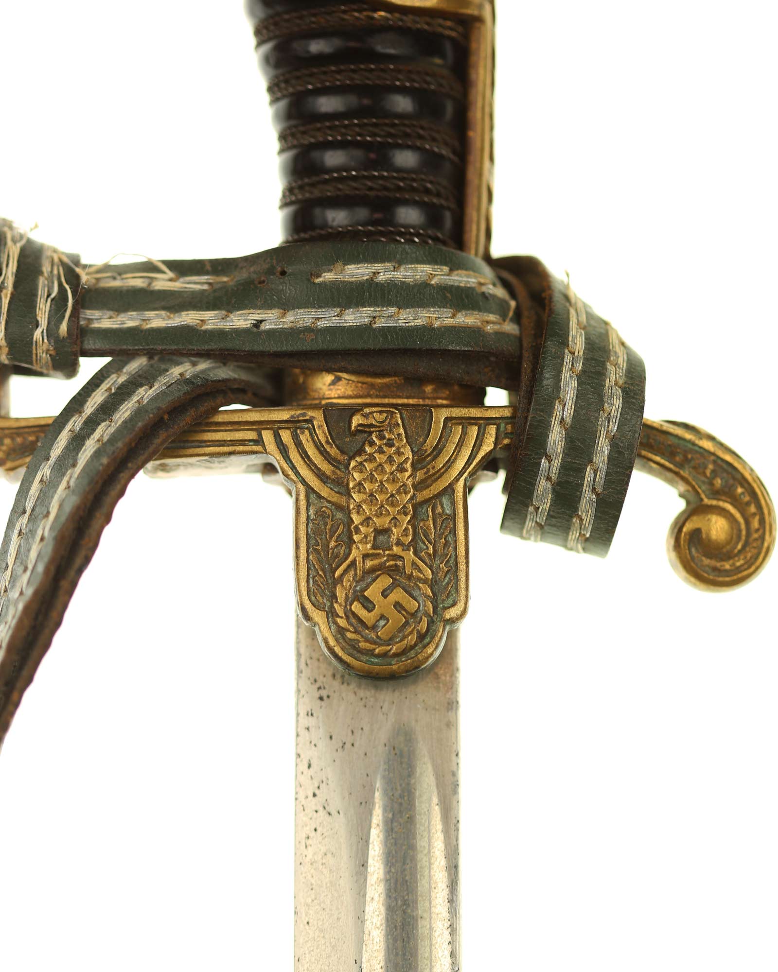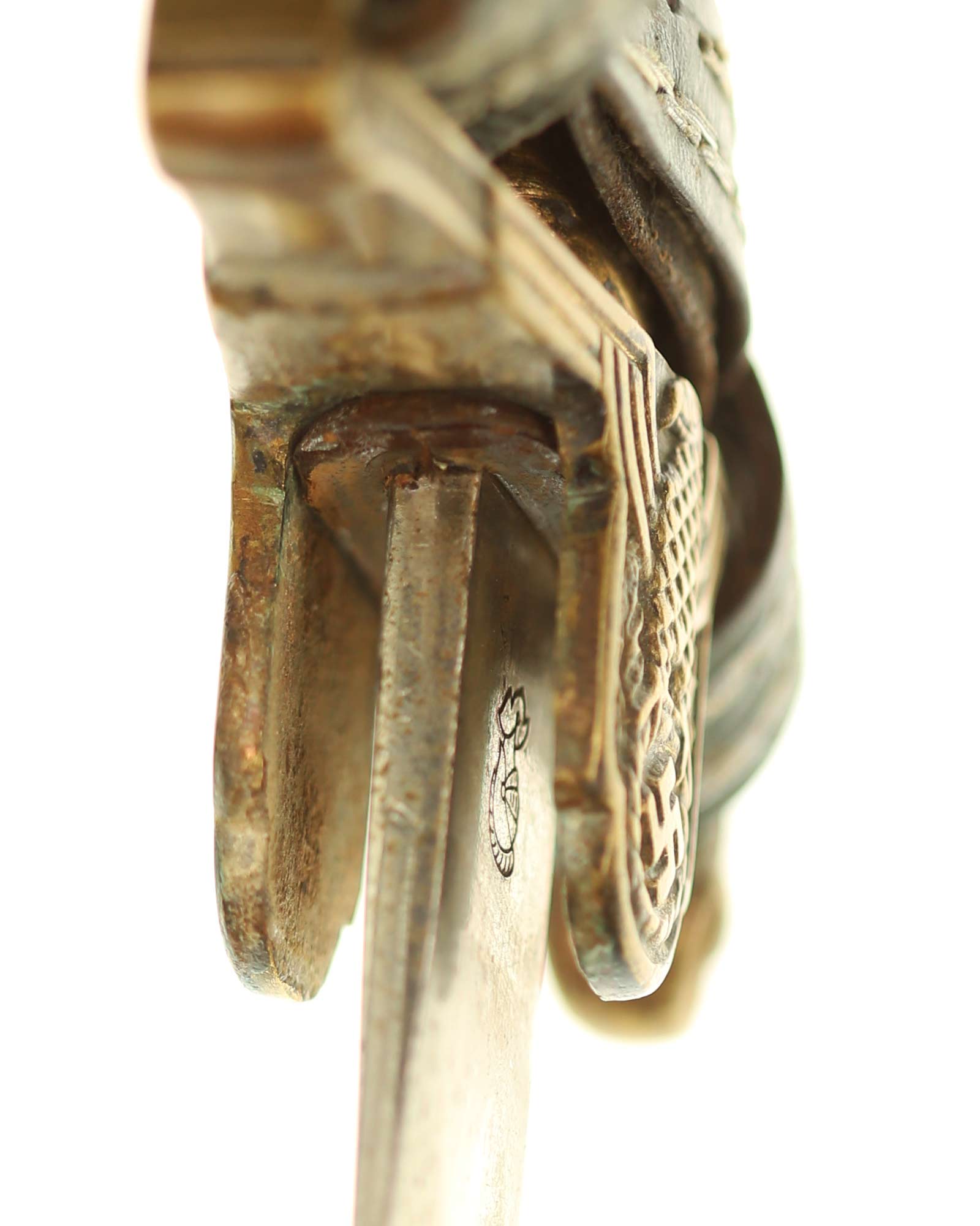 Рукоять: Эфес «блюхеровского» типа, состоит из рукояти и гарды. Гарда латунная, с одной защитной дужкой, переходящей под прямым углом в крестовину рукояти, дальний конец которой загнут вниз по направлению к обуху клинка. В центре крестовины располагаются два декоративных щитика, на одном из которых имеется войсковая эмблема Вермахта в виде орла, на другой декоративный медальон. Рукоять бакелитовая, с горизонтальными желобками, перевитыми металлической проволокой. Спинка рукояти сплошная, с растительным орнаментом по центру, плавно переходящая в головку, выполненную в виде головы льва. В глазах льва вставлено два красных камня. В центре спинки рукояти имеется декоративное расширение.