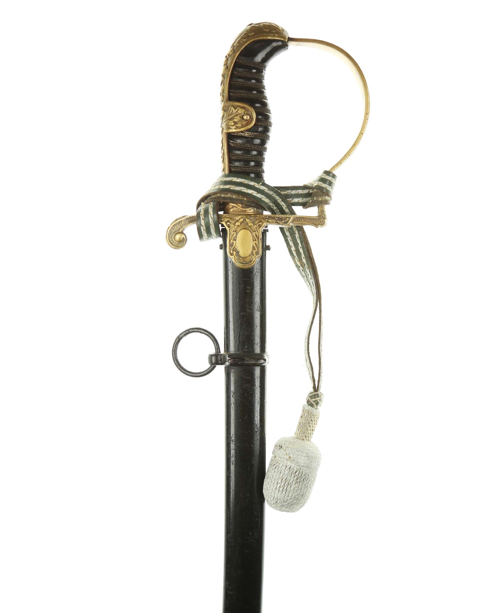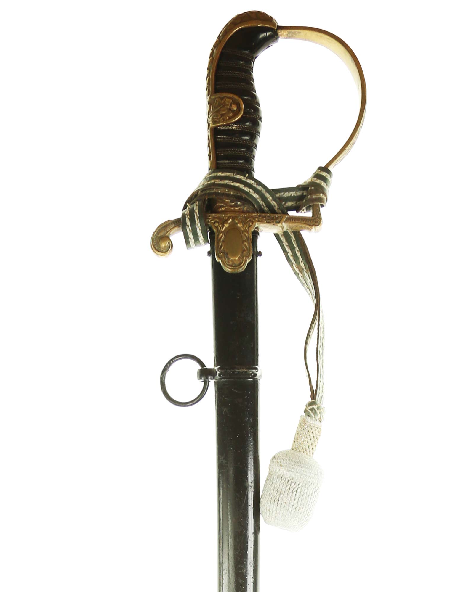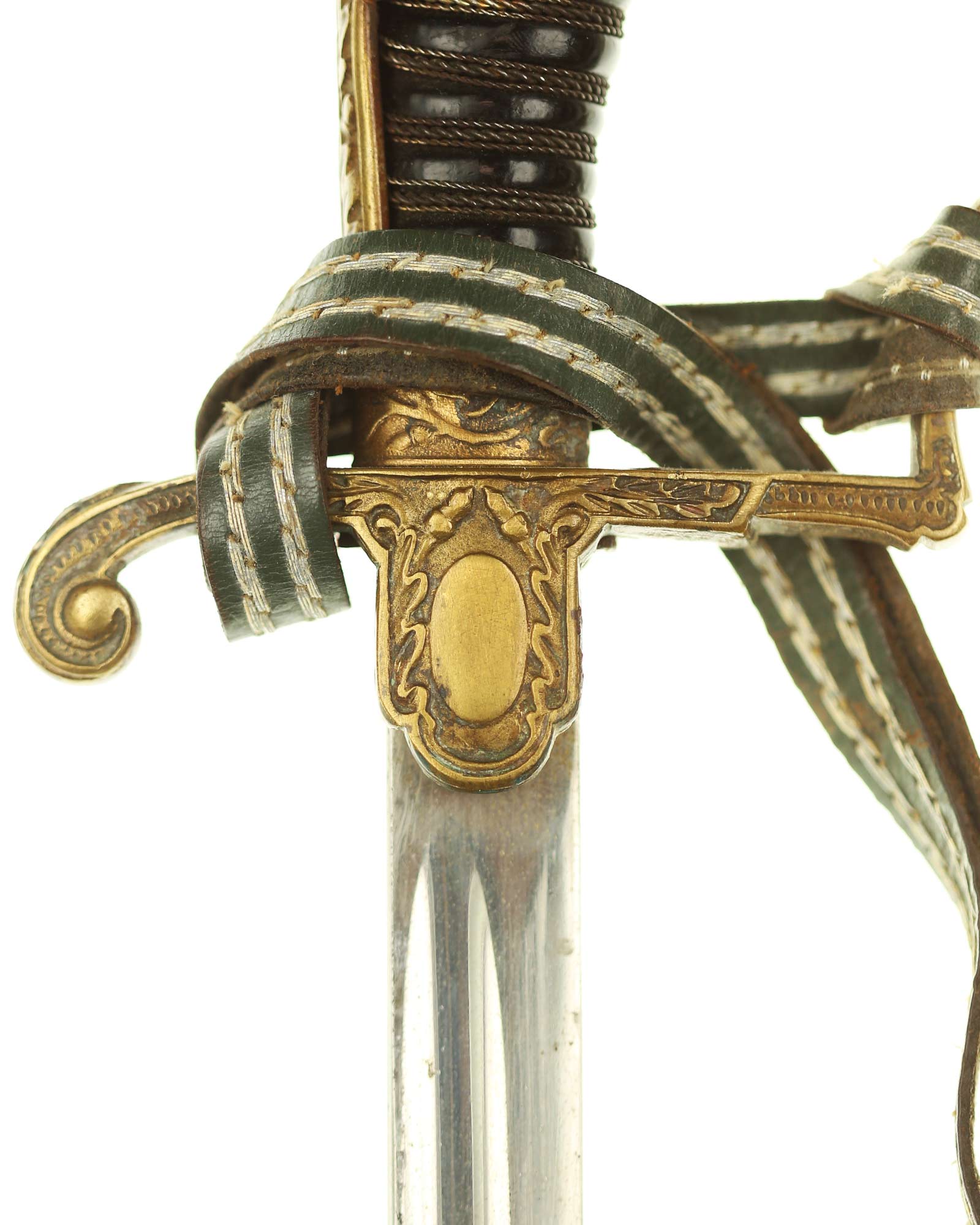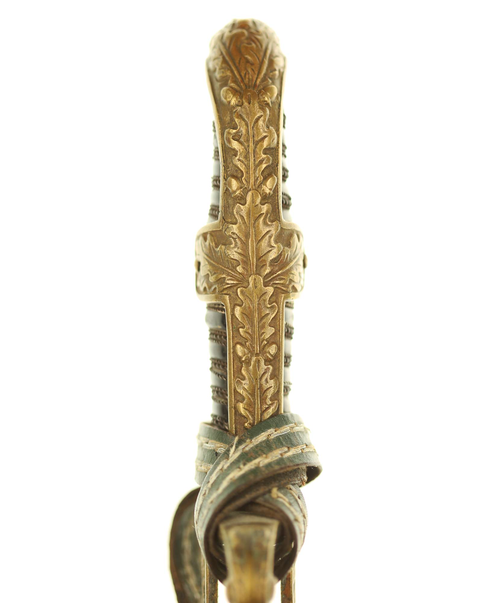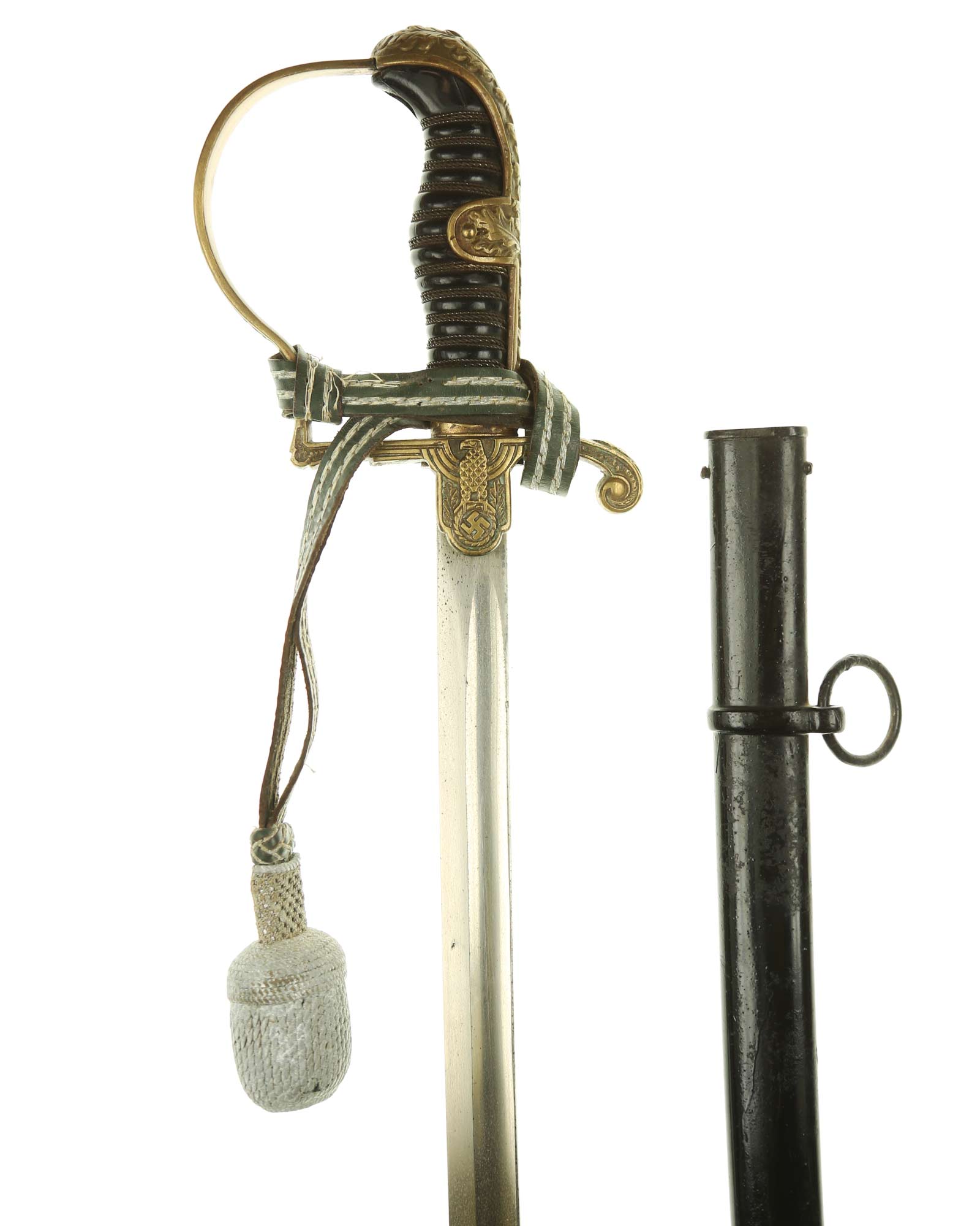 Рукоять: Эфес «блюхеровского» типа, состоит из рукояти и гарды. Гарда латунная, с одной защитной дужкой, переходящей под прямым углом в крестовину рукояти, дальний конец которой загнут вниз по направлению к обуху клинка. В центре крестовины располагаются два декоративных щитика, на одном из которых имеется войсковая эмблема Вермахта в виде орла, на другой декоративный медальон. Рукоять бакелитовая, с горизонтальными желобками, перевитыми металлической проволокой. Спинка рукояти сплошная, с растительным орнаментом по центру, плавно переходящая в головку, выполненную в виде головы льва. В глазах льва вставлено два красных камня. В центре спинки рукояти имеется декоративное расширение.