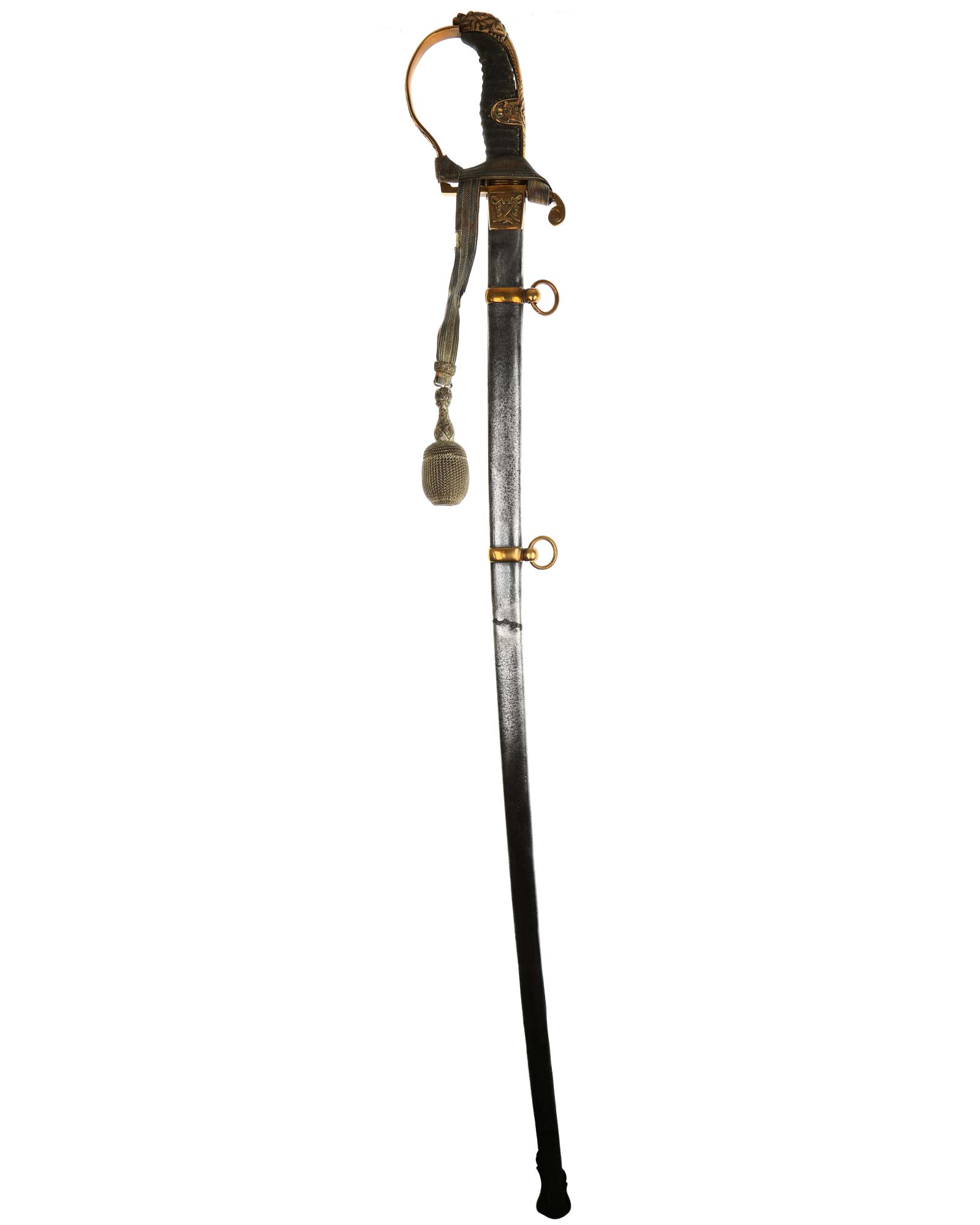Эфес состоит из рукояти и гарды. Рукоять обтянутая кожей, латунный эфес с головой льва, на щитике перекрещённые сабли. Гарда латунная с одной защитной дужкой, которая плавно переходит в крестовину. Дальний конец крестовины округлый и загнут по направлению к обуху клинка, в комплекте немного изношеный темляк.