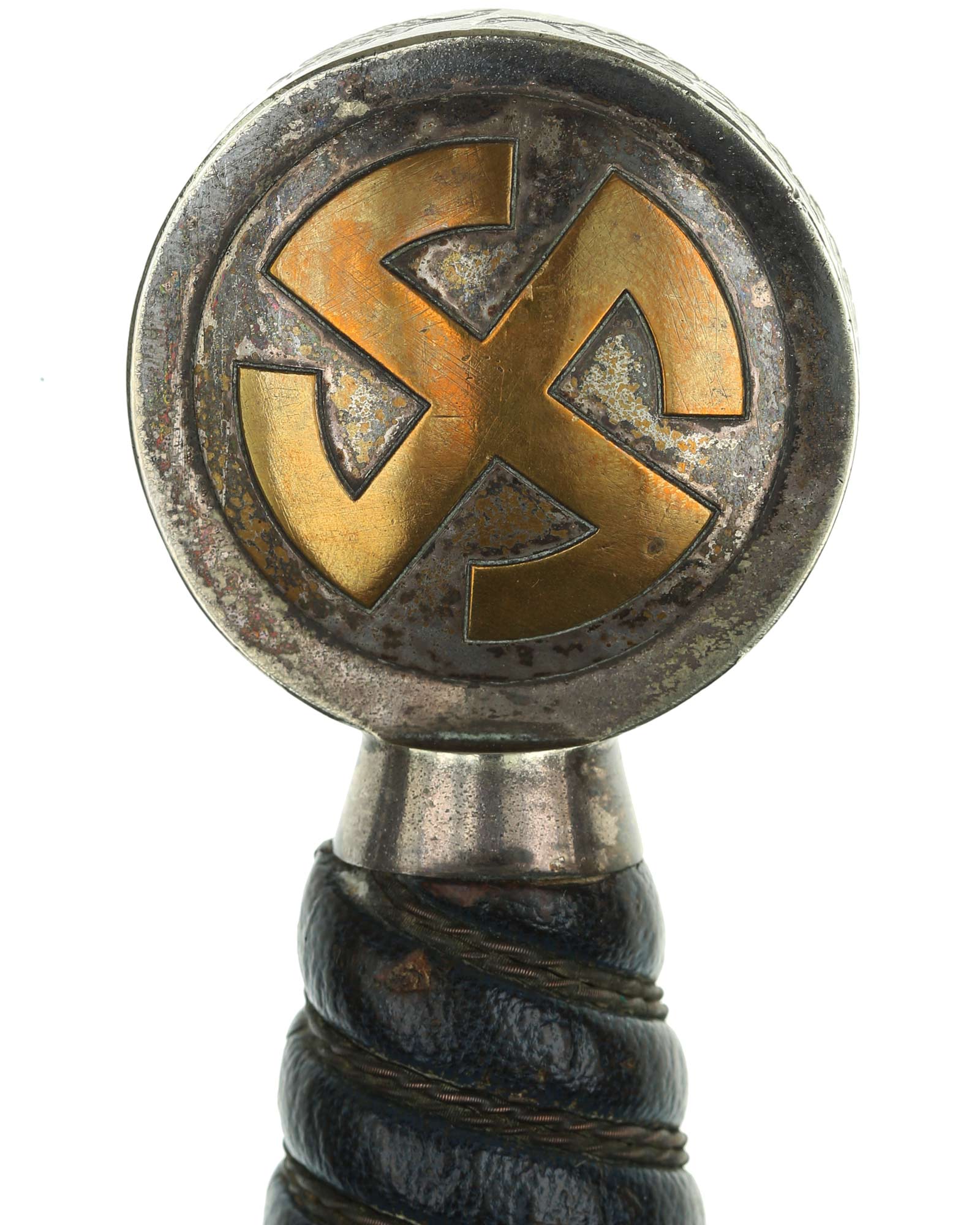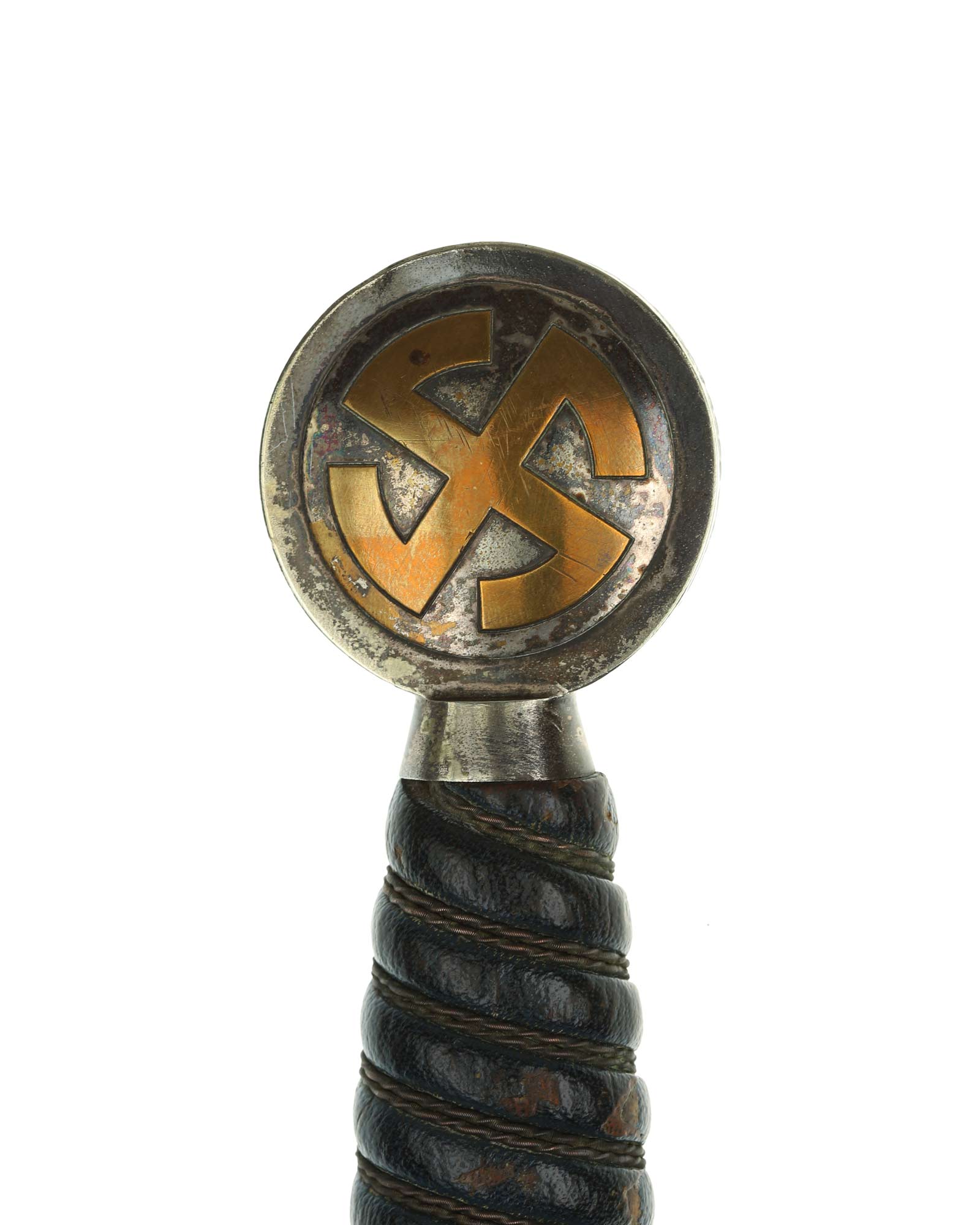 Рукоять: Эфес состоит из рукояти и крестовины из нойзильбера. Рукоять покрыта темно-синей кожей, по желобкам перевита двойной проволокой. В центре крестовины и на навершии рукояти находится позолоченное изображение свастики. Навершие в торце украшено резным растительным орнаментом.
