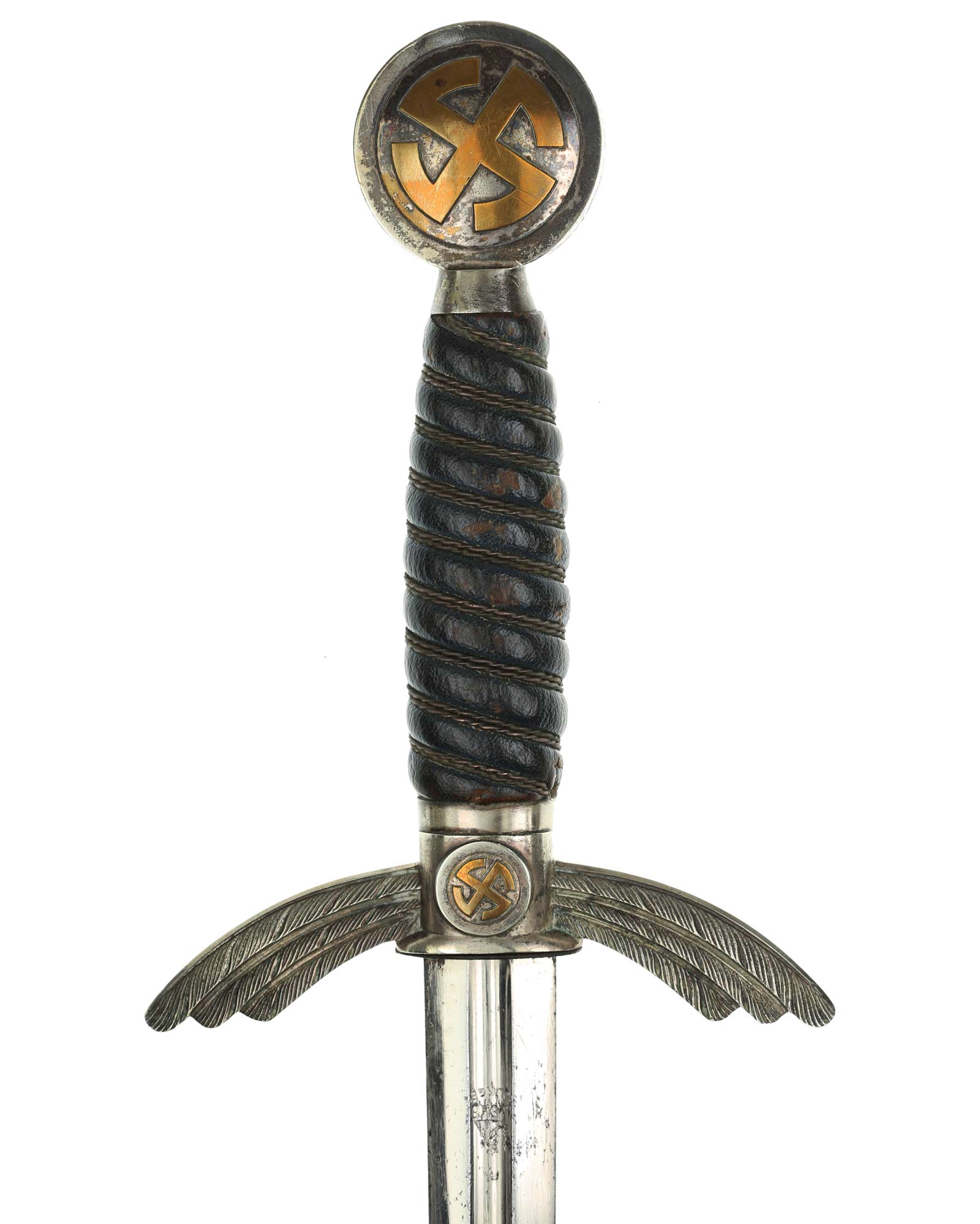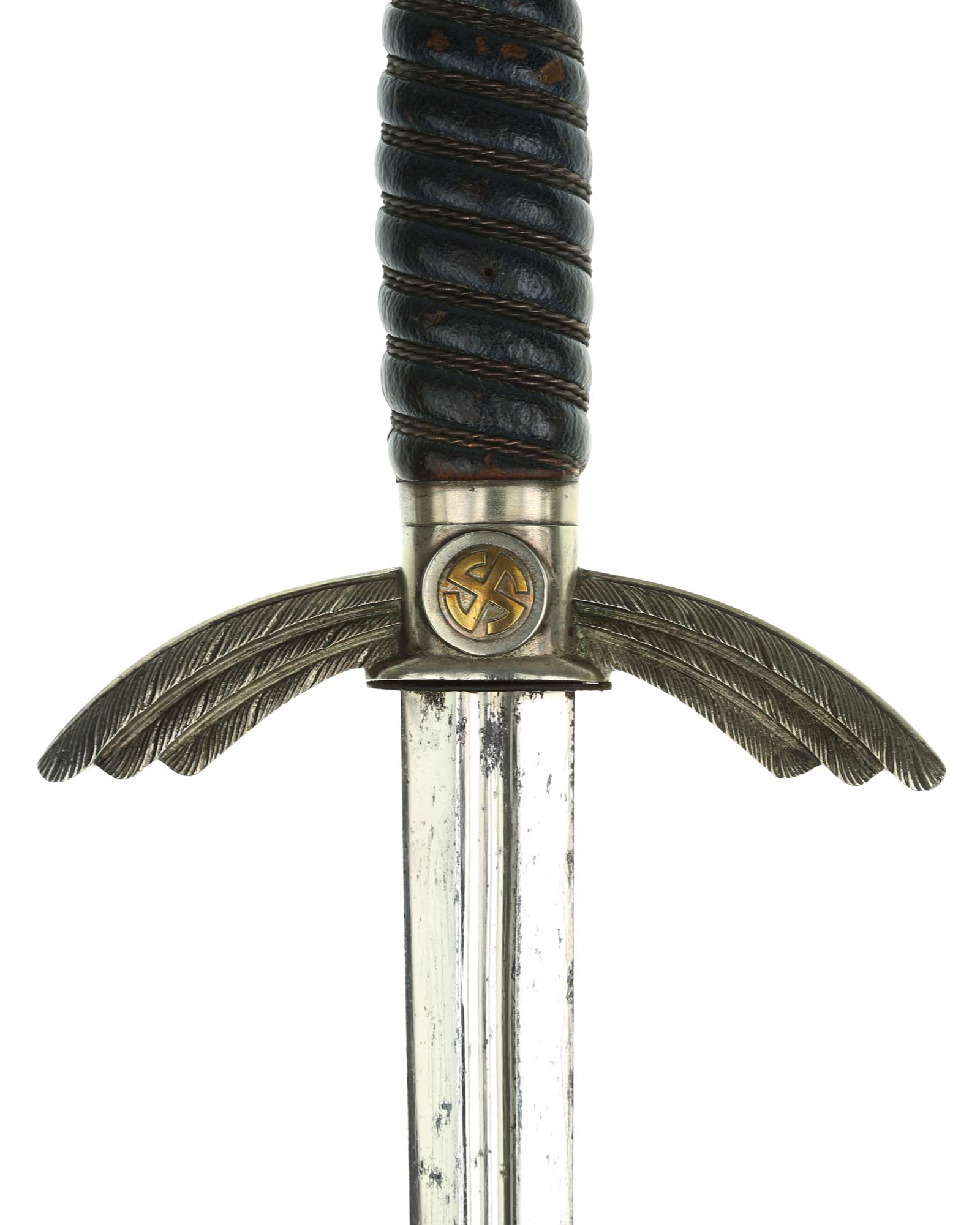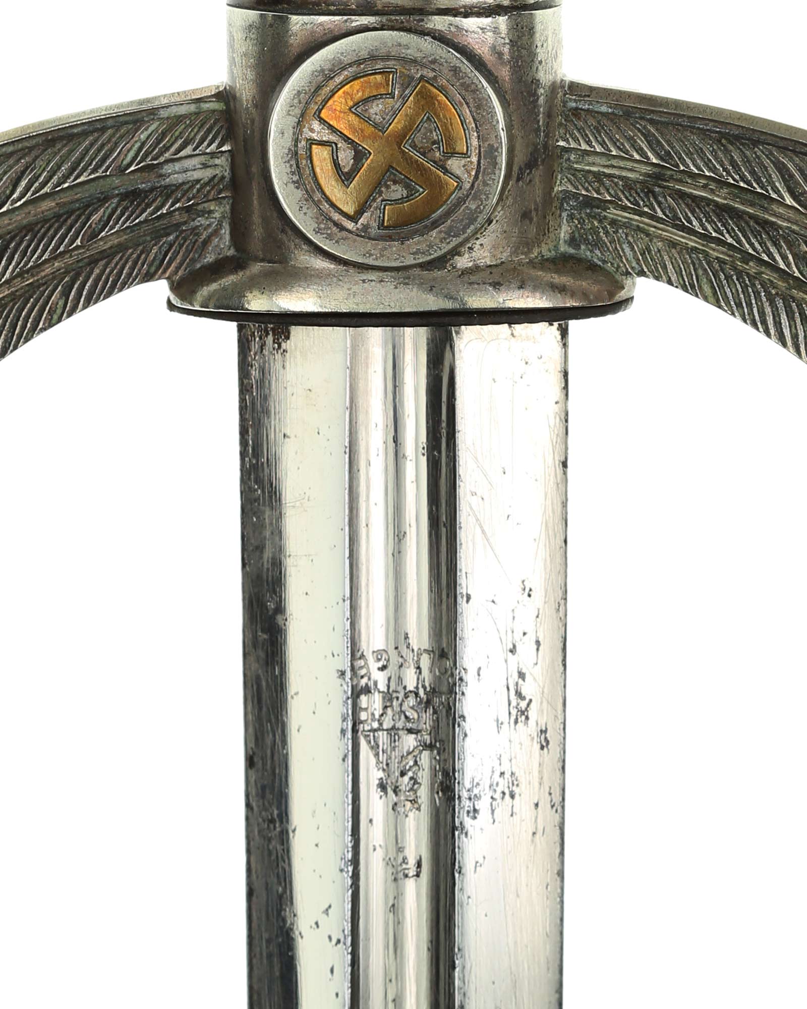 Клинок: Клинок стальной, прямой, двулезвийный, в сечении шестигранный, с долом вместо средней грани в верхней части, никелированный. Клинок на оборотной стороне у основания стоит клеймо производителя Штеккер Золинген (SMF Solingen). На лезвии клинка, чуть выше клейма производителя, выбит знак Люфтваффе "5".