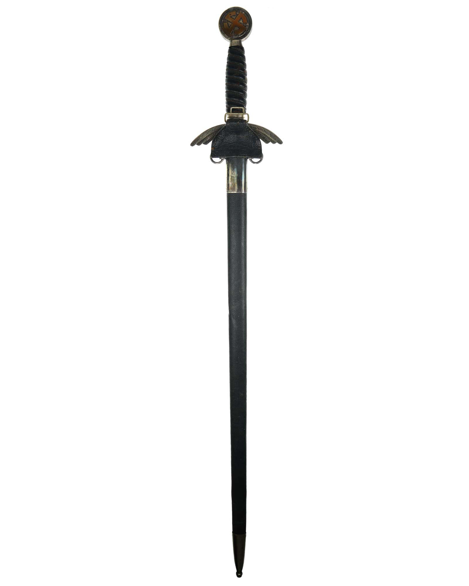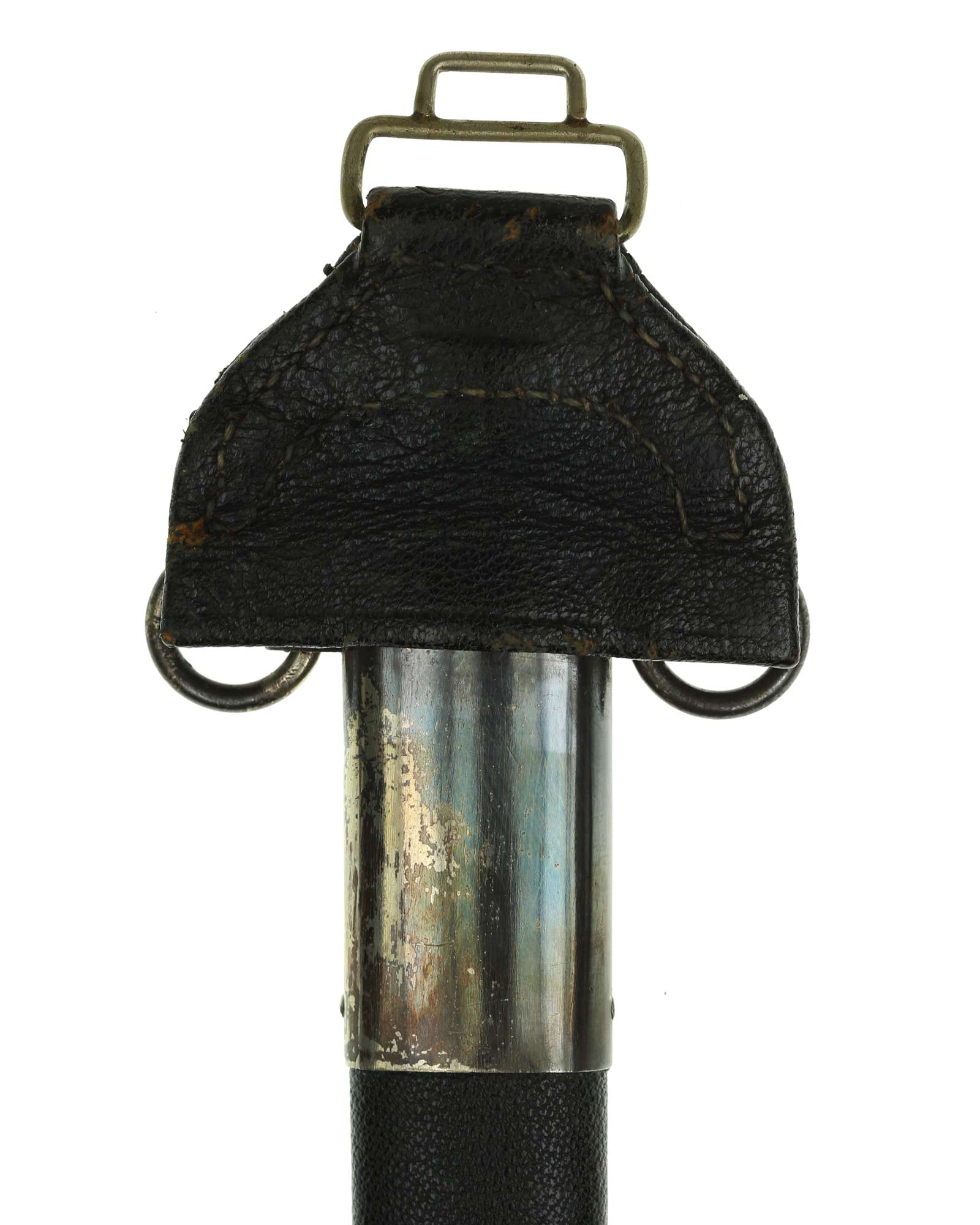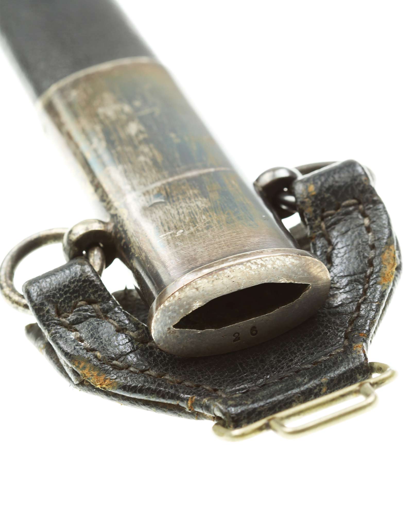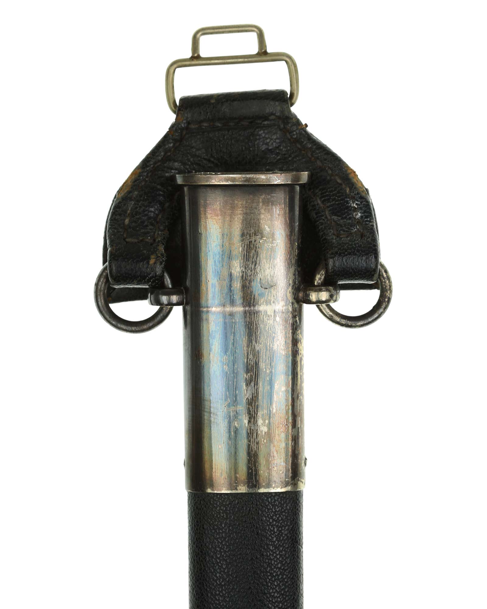 Ножны: Ножны стальные, покрытые темно-синей кожей. Приборы ножен выполнены в мельхиоре, что указывает на довоенное изготовление данного парадного меча.