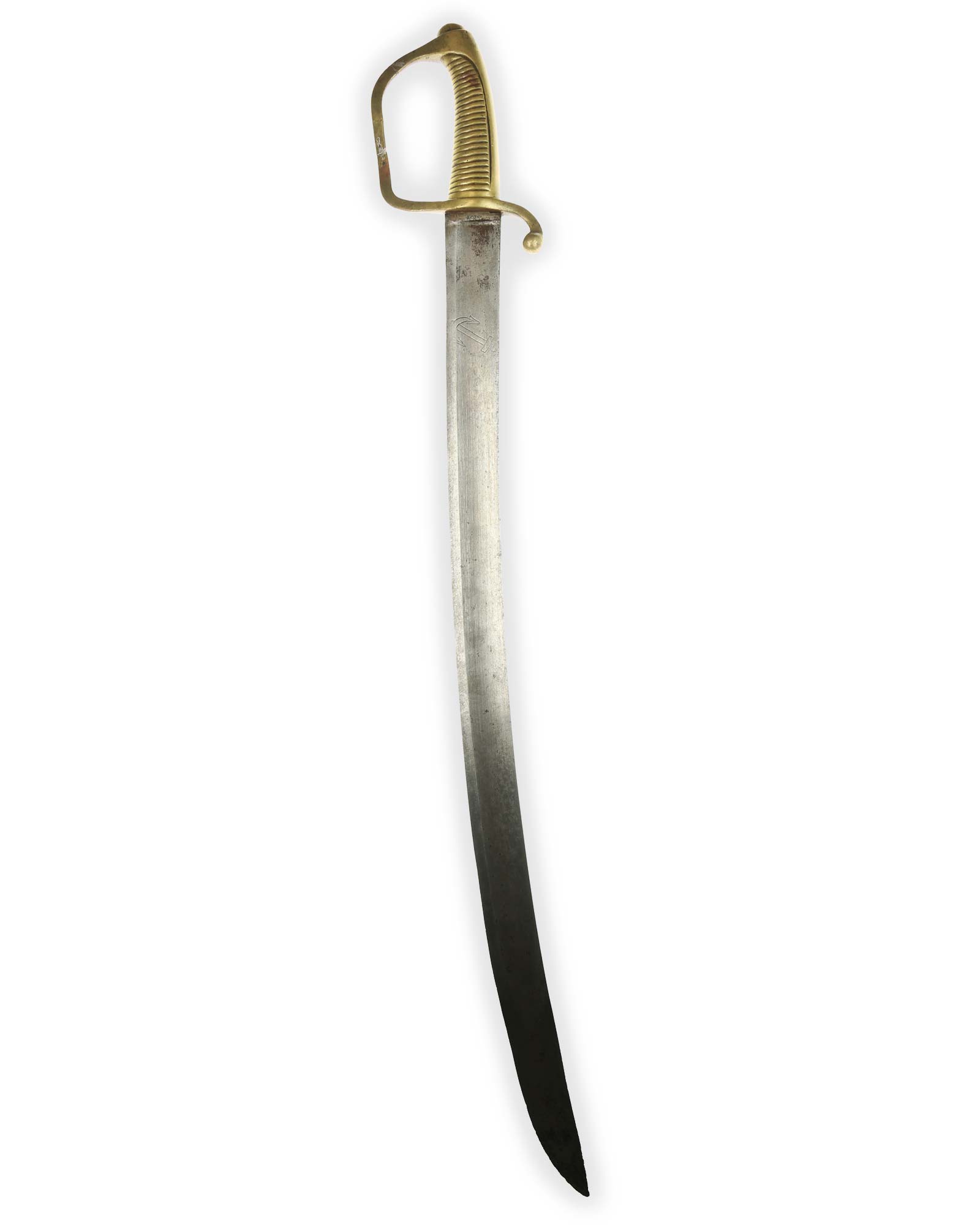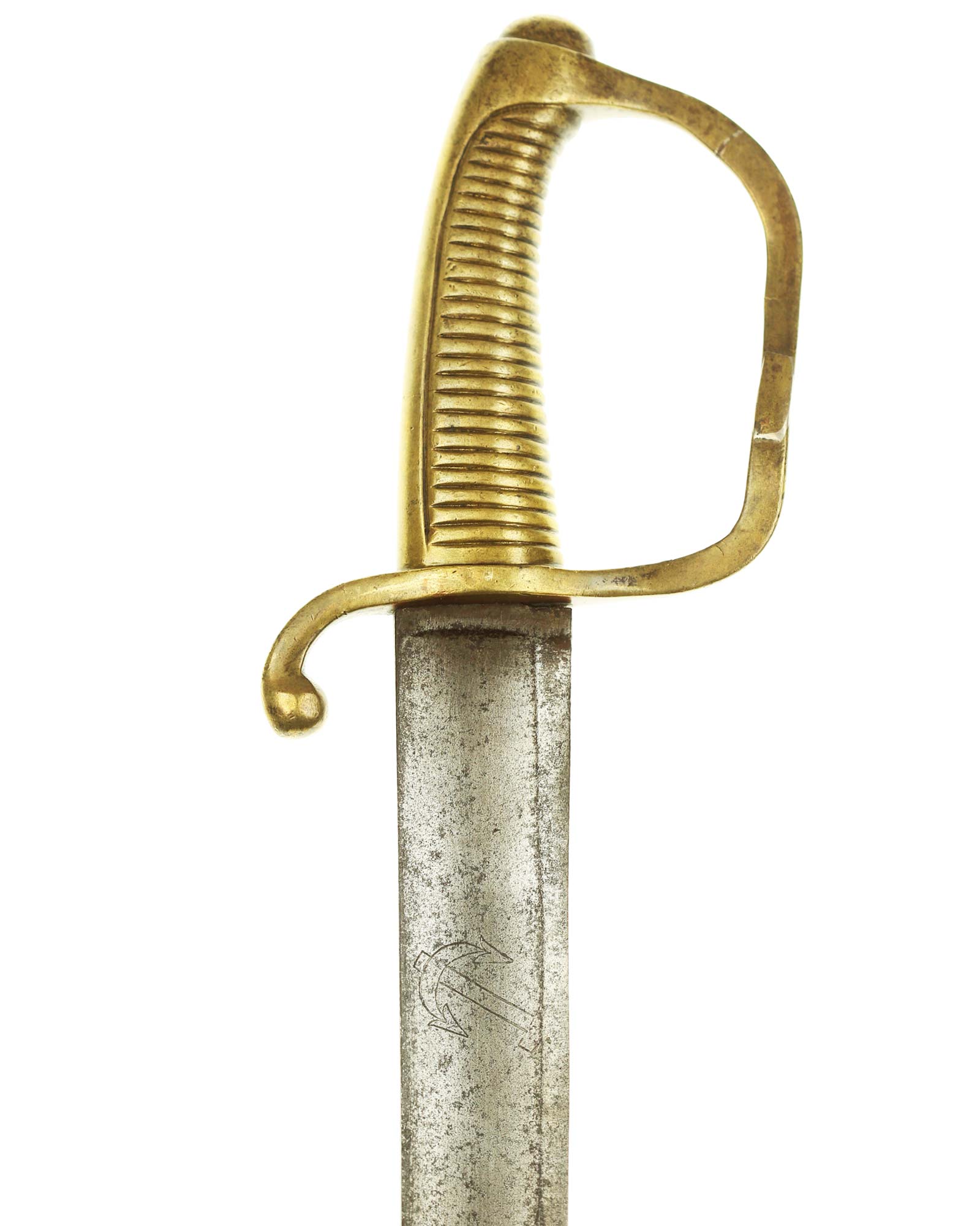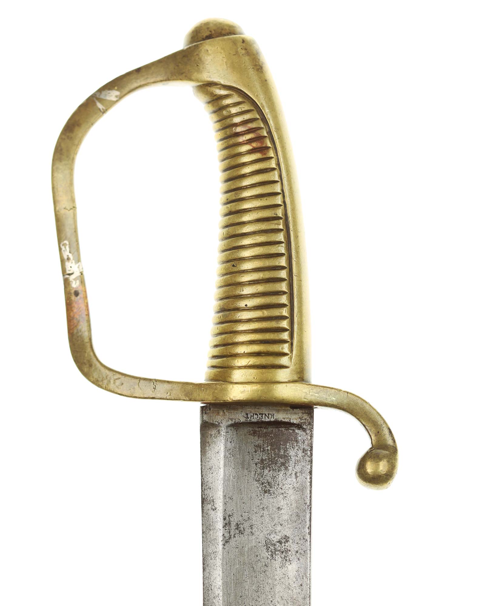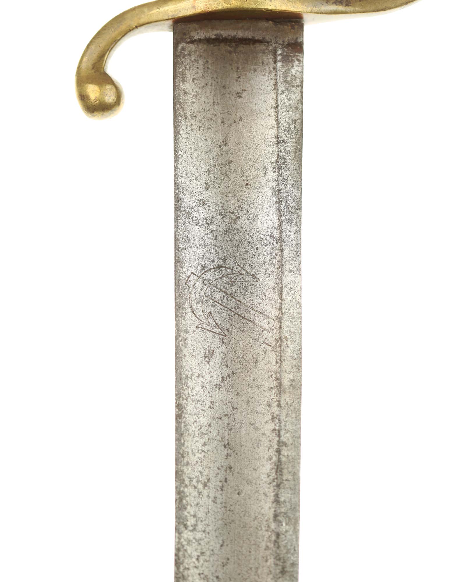 Сабля для морской пехоты образца 1849 года Германского императорского флота, без ножен. Сабля имеет изогнутое однолезвийное лезвие с якорем с обеих сторон. На лицевой стороне указан производитель: E. Knecht & Co., Золинген. Рукоятка и скоба изготовлены из латуни.