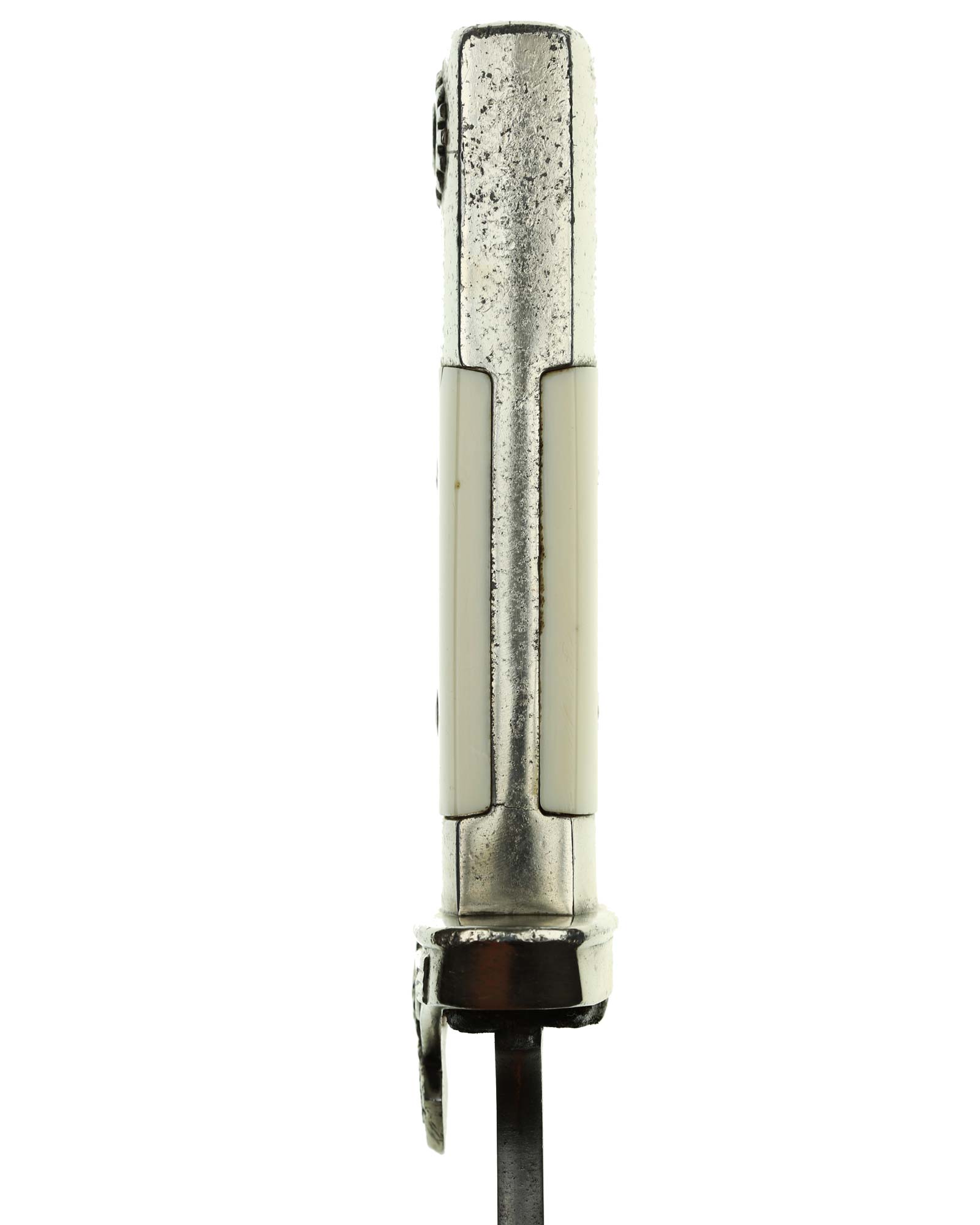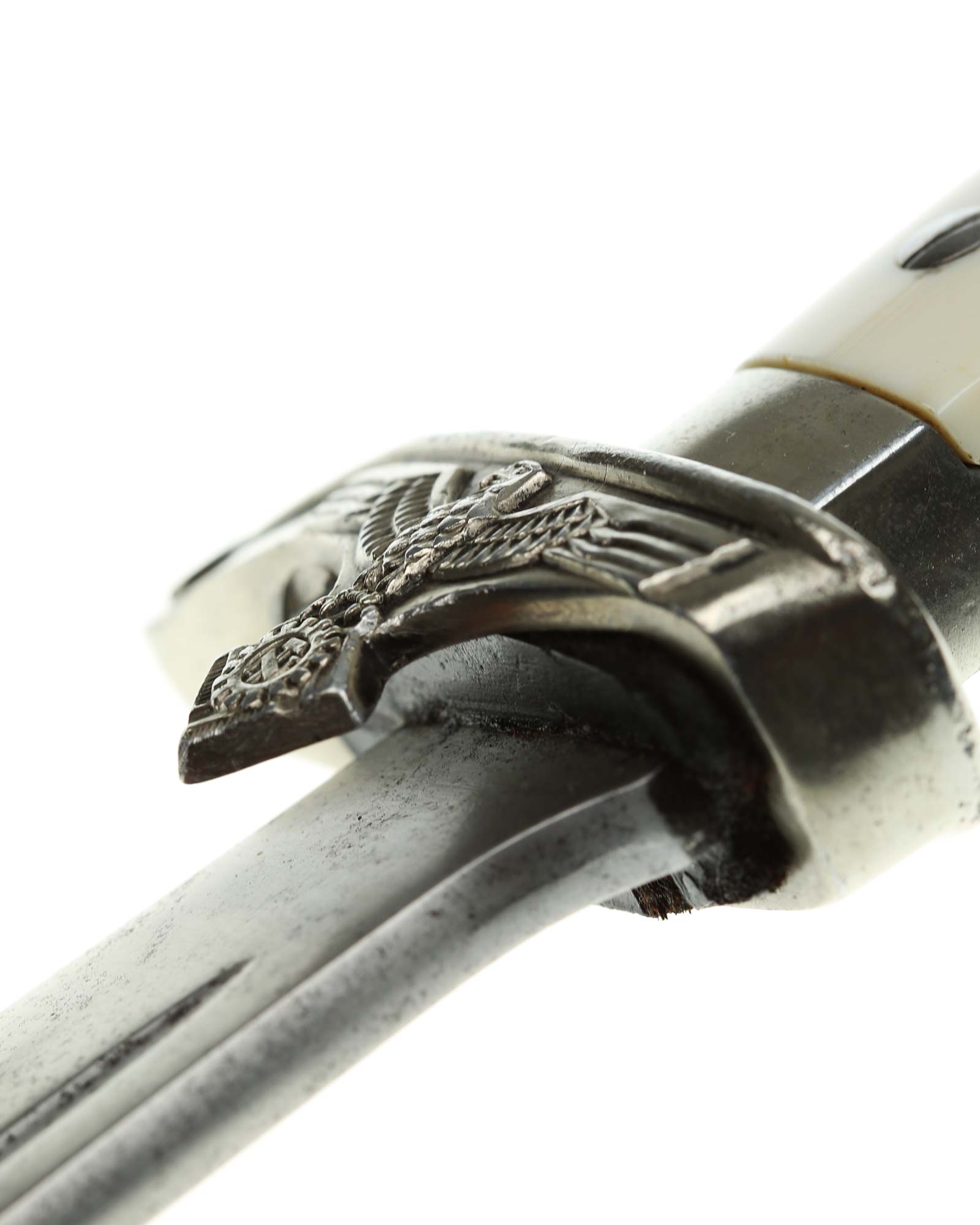 Рукоять: Рукоять металлическая, прямая на спинке, выпуклая на брюшке, с головкой в виде клюва птицы, с двумя пластмассовыми щечками белого цвета. Щечки прикреплены к рукояти двумя винтами с потайными ганками. На лицевой стороне головки имеется рельефное изображение эмблемы технического корпуса. Крестовина литая, прямая, со слегка загнутым вниз и закругленным на конце окончанием. На лицевой стороне перекрестья рельефное изображение орла, держащего в когтях свастику с изображением маленькой эмблемы технического корпуса. Все металлические части эфеса никелированные. Под крестовиной имеется овальная кожаная прокладка.