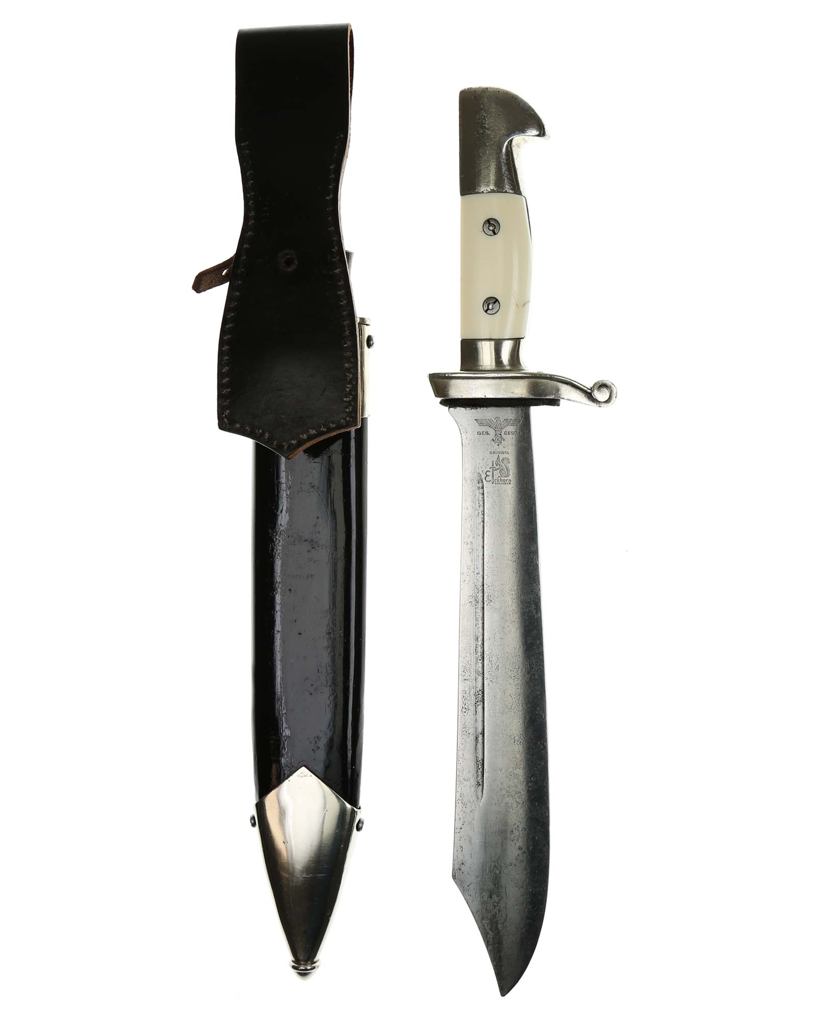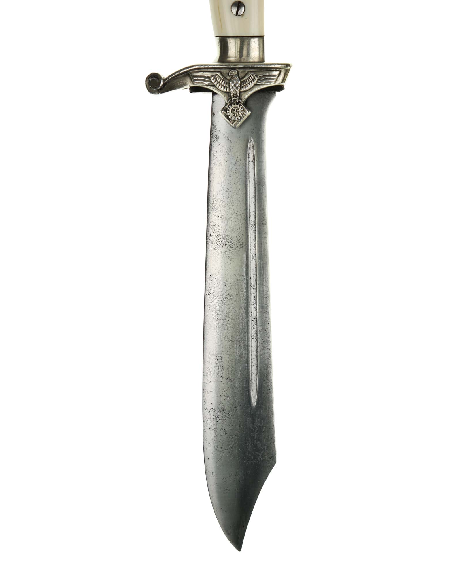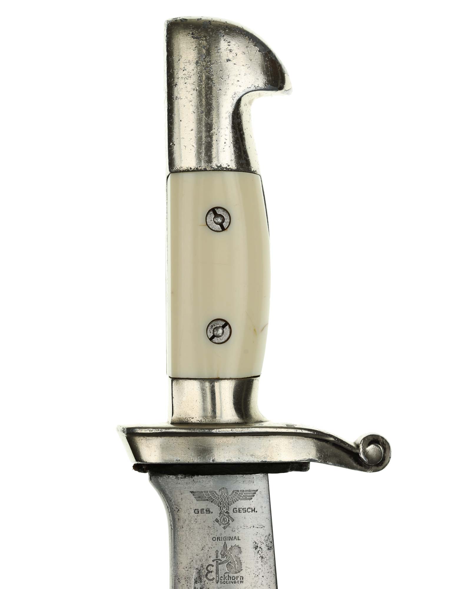 Клинок: Клинок плоский, однолезвийный, чуть искривленный, значительно расширяющийся к нижней части, полированный. Вдоль обуха идет узкий дол. На клинке имеются клейма: орел с символикой TeNo, вписанной в свастику и надписью - «Ges.Gesch» (защищенного патентом дизайна); известной оружейной фирмы «Original Eickhorn, Solingen» — клеймо немецкой фирмы Карл Айкхорн Золинген, изготовившей данный кинжал.