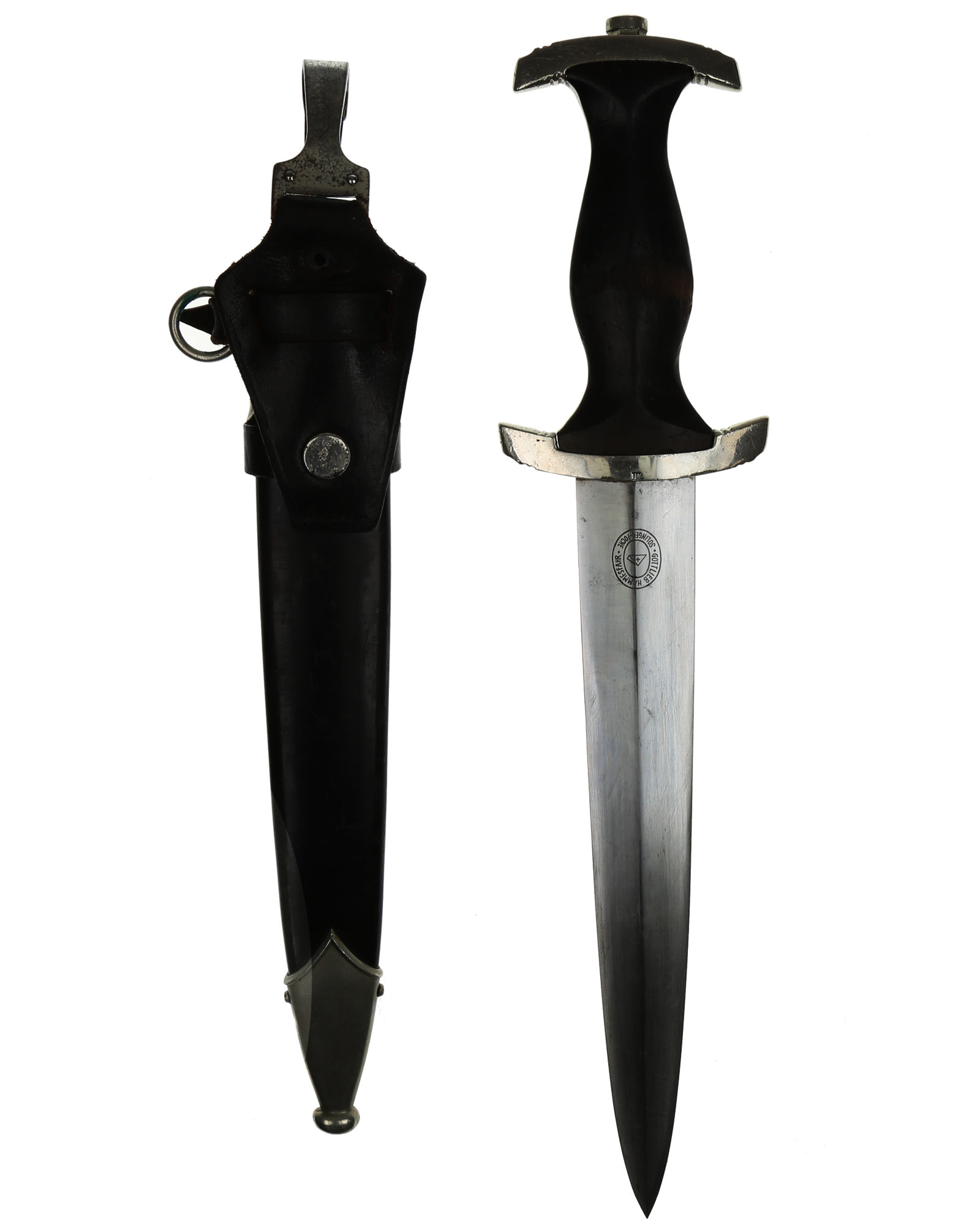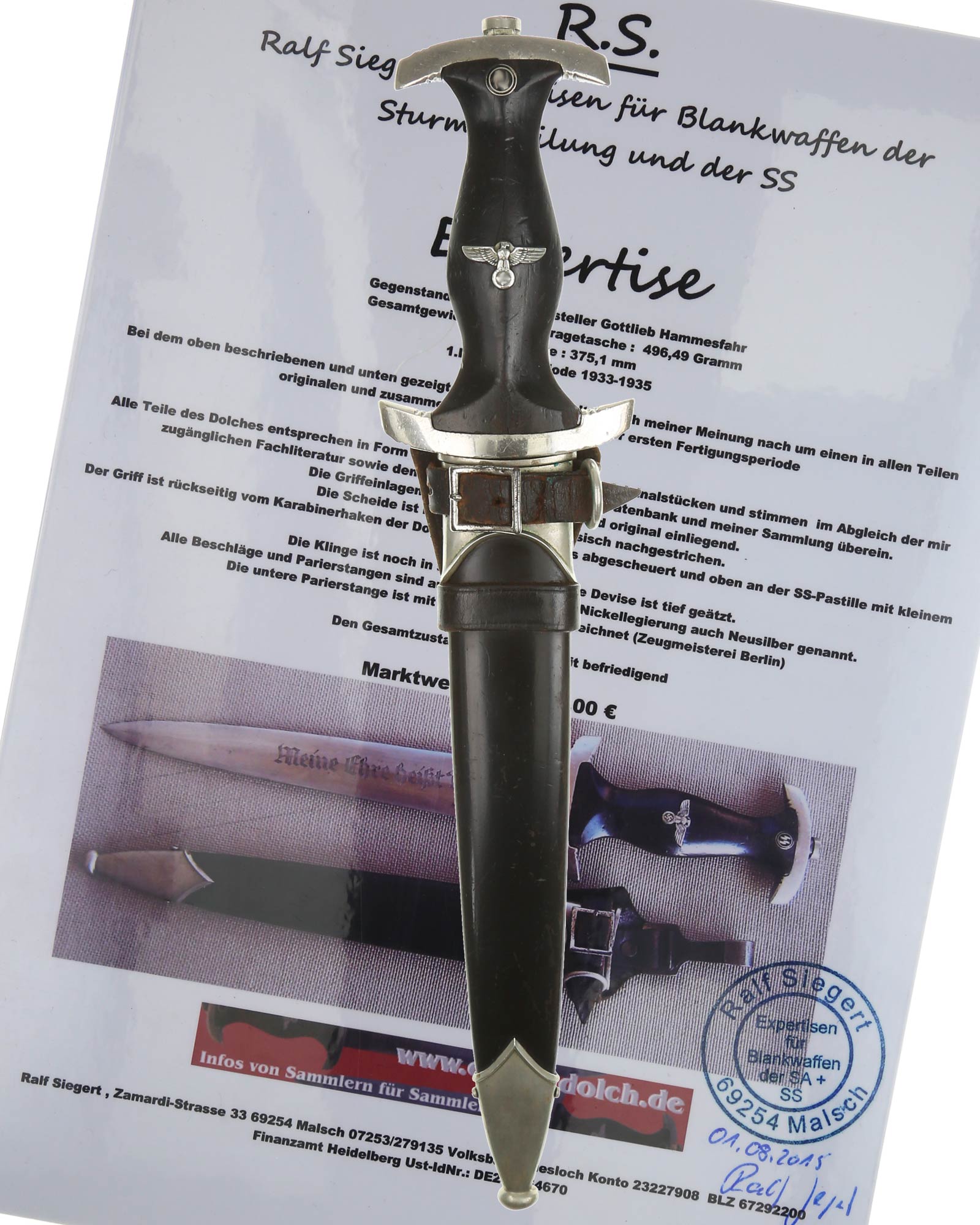 Ранний парадный кинжал СС [SS Schutzstaffel] образца 1933 года. Ранний период производства, 1933-1935 годы. Производитель фирма Готтлиб Хаммесфар Золинген (Gottlieb Hammesfahr Solingen). Длина в ножнах 37,5 см.