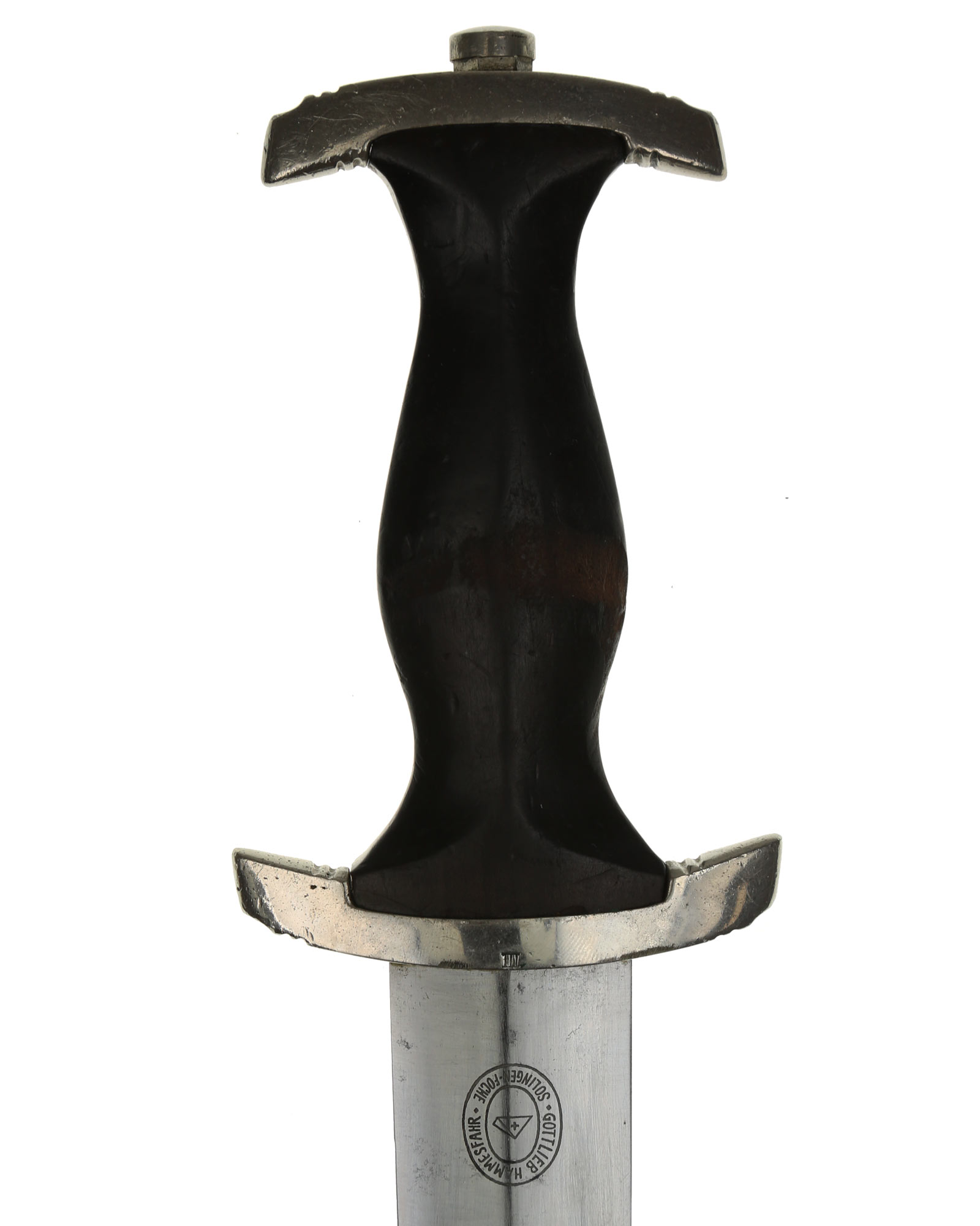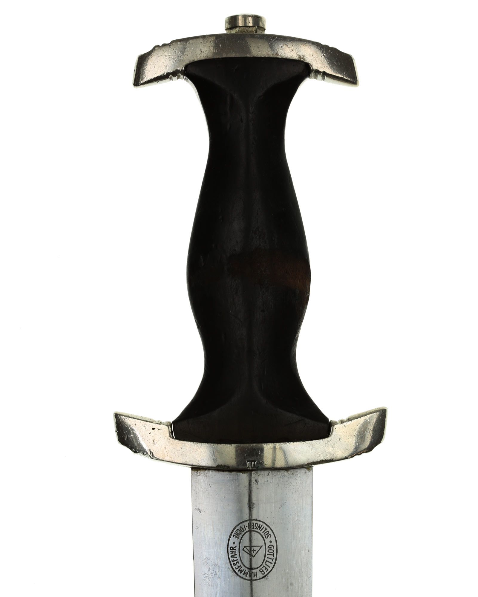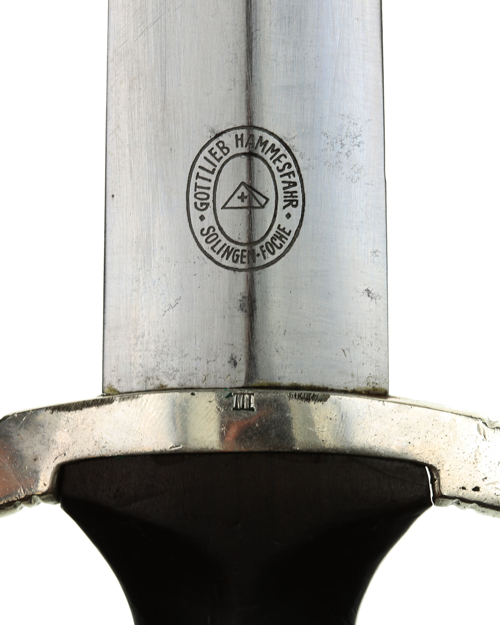 Клинок: Клинок кинжала прямой, стальной, двулезвийный, кинжального типа, с выраженным центральным ребром. На одной стороне клинка методом травления нанесен девиз СС «Meine Ehre heisst Treue» (Моя честь называется верностью). Клинок на оборотной стороне у основания стоит клеймо производителя Готтлиб Хаммесфар Золинген (Gottlieb Hammesfahr Solingen).