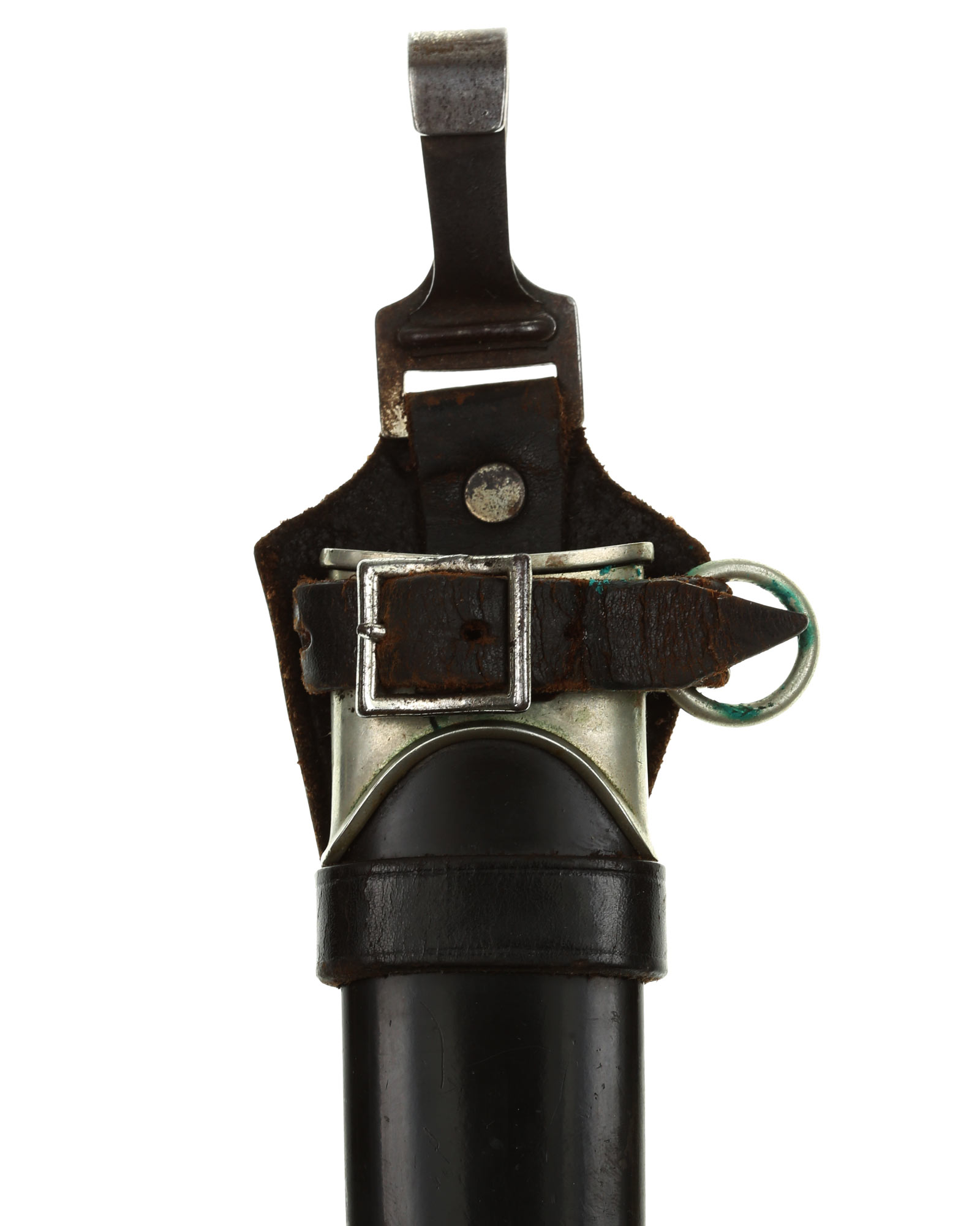 Ножны: Ножны металлические. Черные вороненные ножны с посеребренным прибором и одним подвижным кольцом для крепления к подвесу.