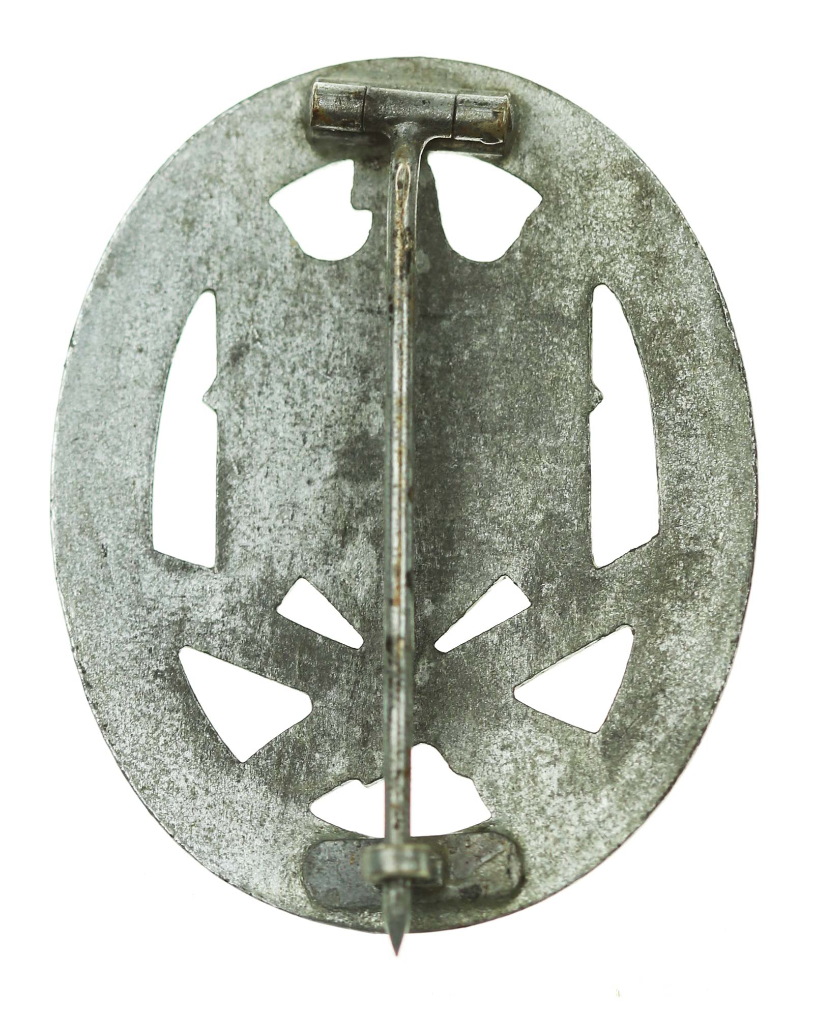 Знак выполнен штампом из цинкового сплава и покрыт серебрением. Реверс плоский немного углубленный, крепление - вертикальная булавка, без клейма. Общий вес 29 г. Размеры: 53,10 х 42,55 мм.
