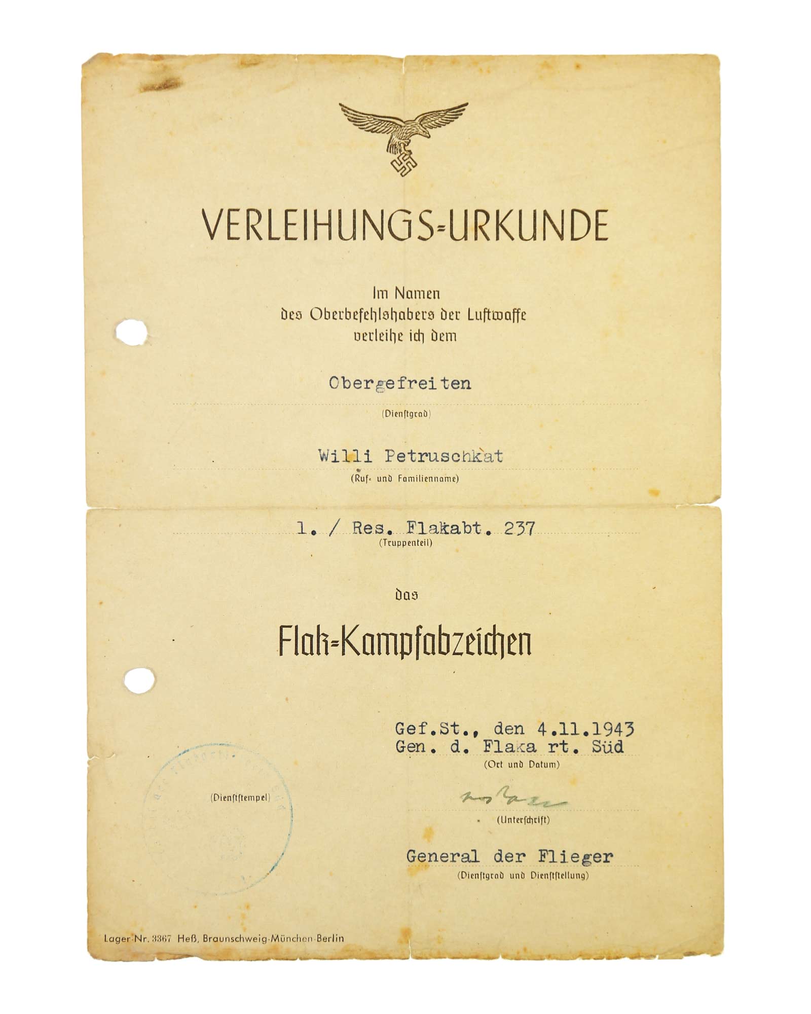 - Наградной документ: Наградной документ на Железный крест 2-й степени