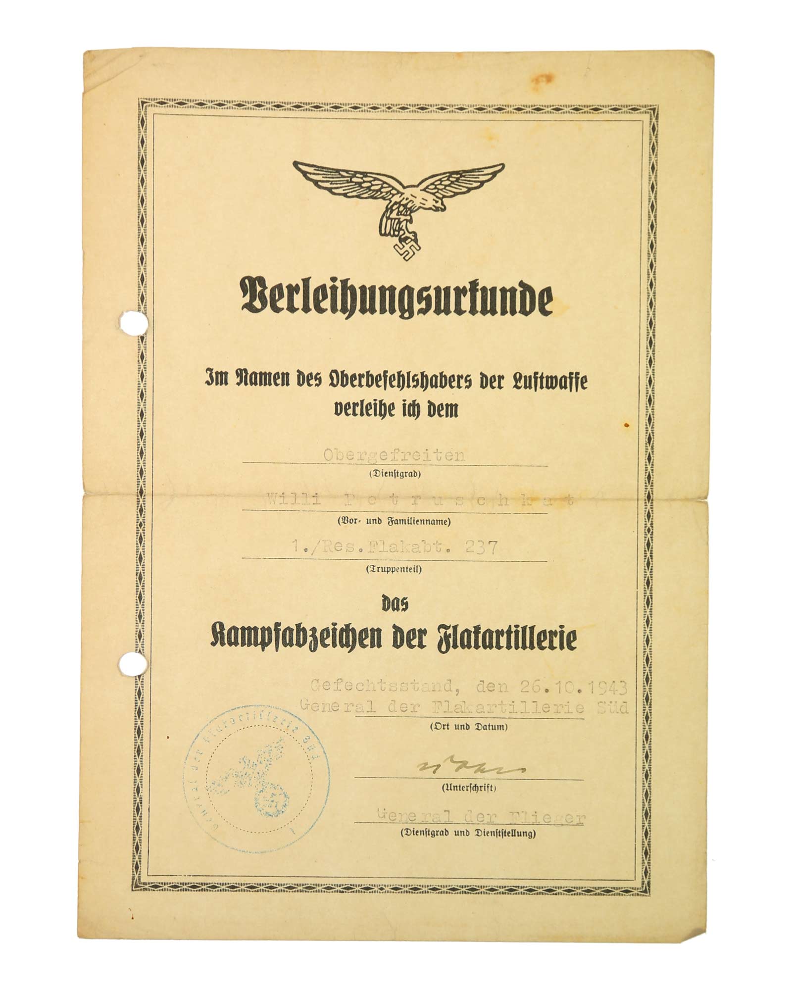 - Наградная грамота на боевой знак зенитной артиллерии