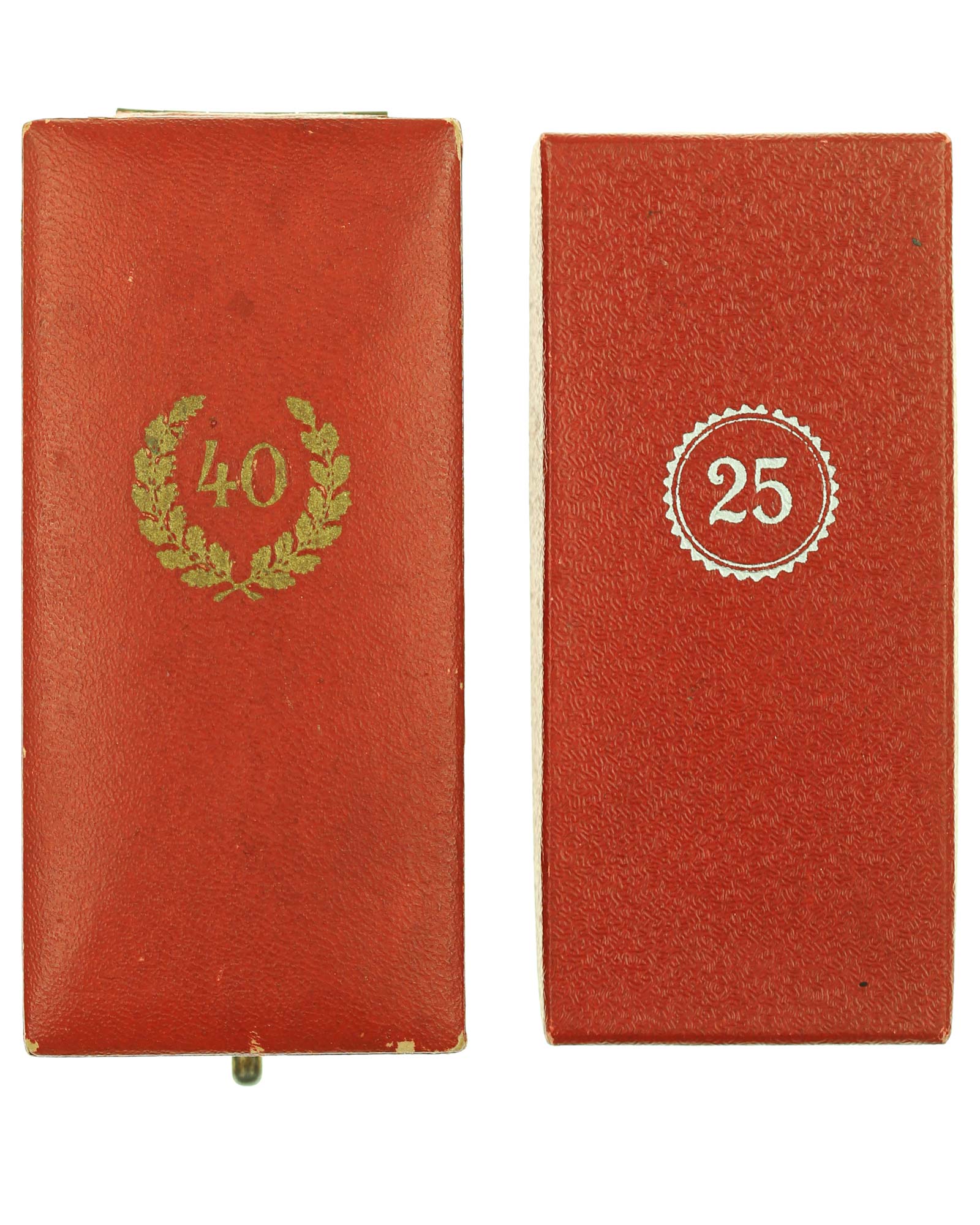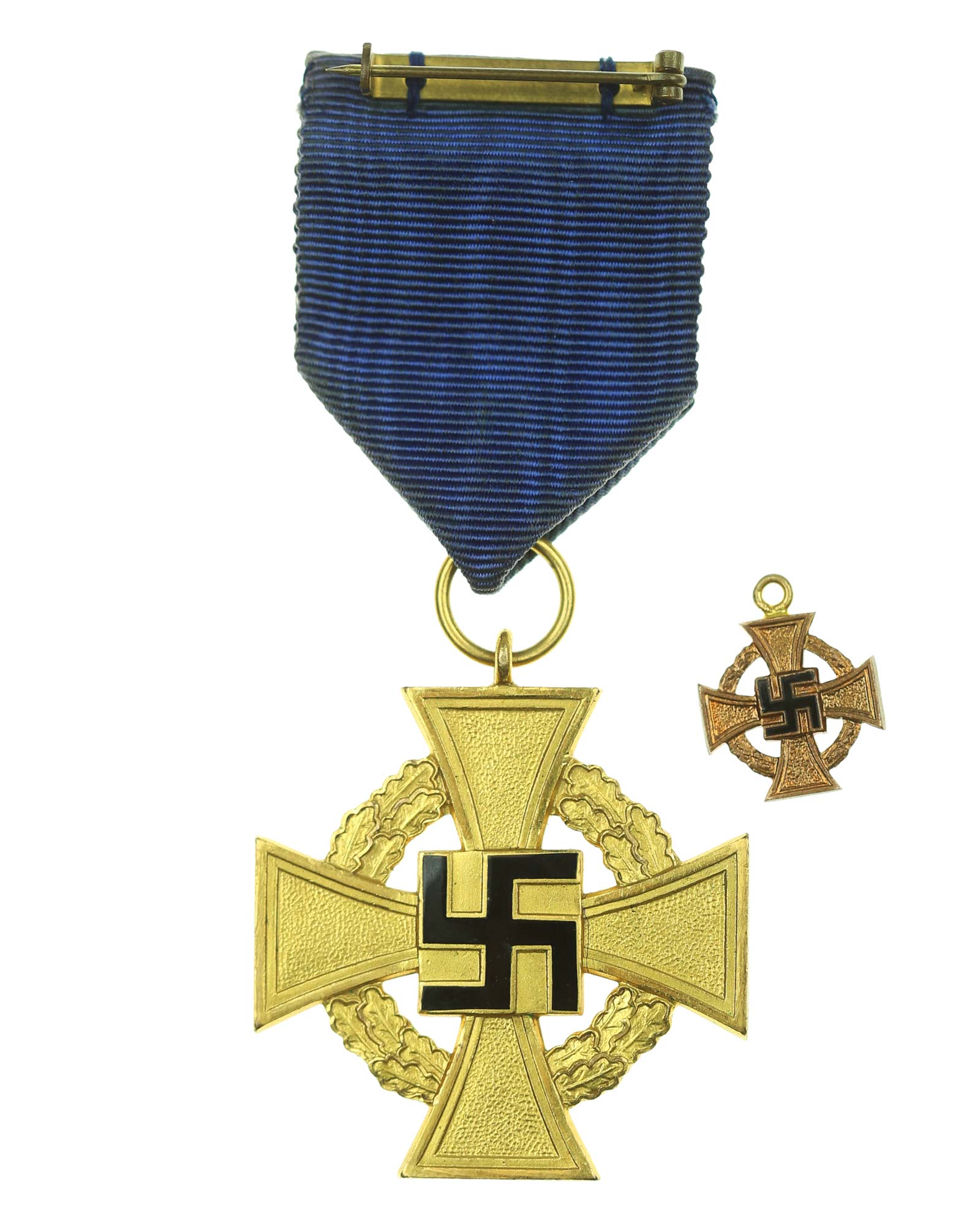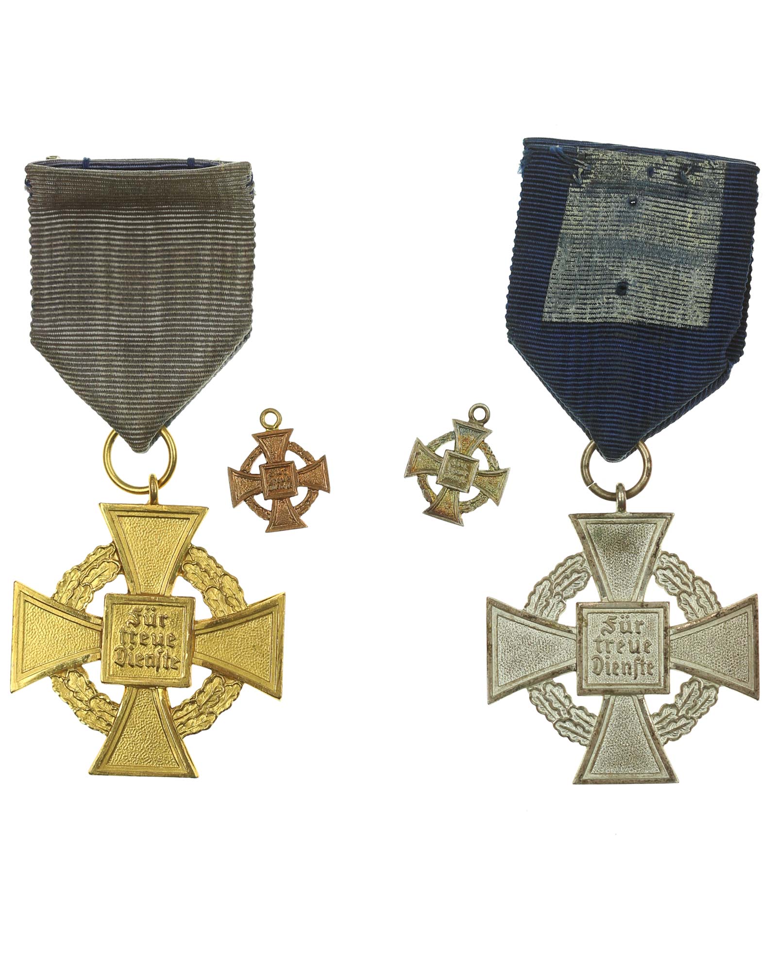 Крест «За 40 лет гражданской выслуги» 1-го уровня за 40 лет. Период награждения 1938 - 1945. Цветной металл с посеребрением. На спине надпись: "За верную службу". Знак за верную службу 1 степени в золоте (позолота), в футляре. Крест морозно-белый с полированными краями. Общий вес 51 г Значок: 24 г Размеры: 41,31 х 46,32 мм.