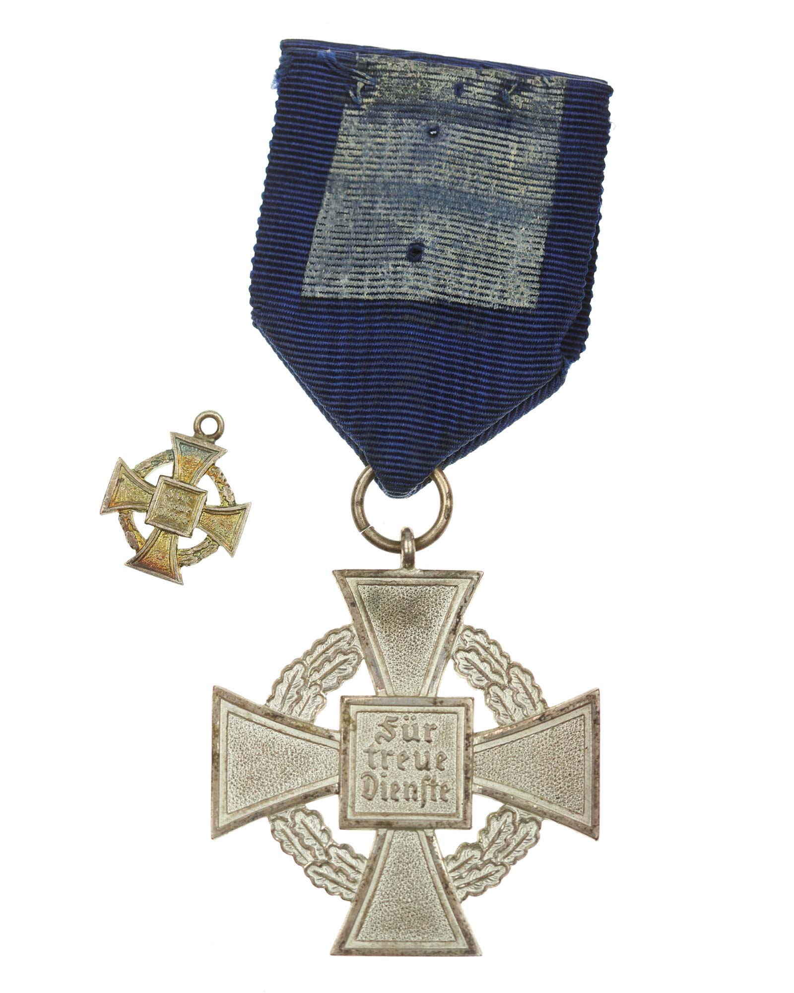 Крест «За 25 лет гражданской выслуги» 2 степени за 25 лет. Период награждения 1938 - 1945. Цветной металл с посеребрением. На спине надпись: "За верную службу". Знак за верную службу 2 степени в серебре, в футляре. Крест морозно-белый с полированными краями. Производитель 132, Franz Reischhauer, Oberstein. Общий вес 38 г Значок: 21 г Размеры: 41,22 х 46,32 мм.