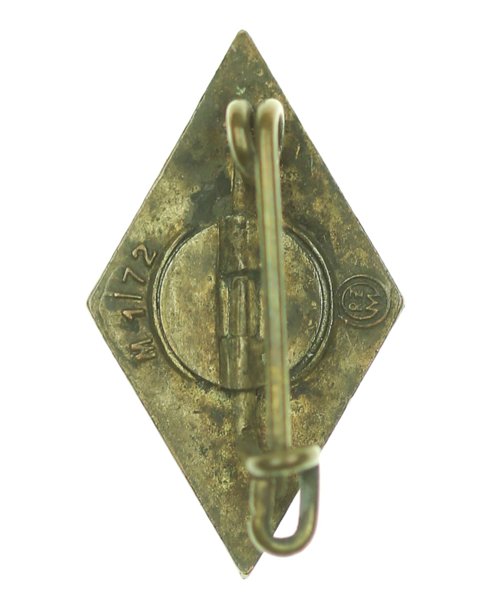 Членский знак Гитлерюгенд - нем. Hitlerjugend [HJ] Mitgliedsabzeichen. На реверсе знака клеймо производителя фирма RZM M1/72 (Fritz Zimmermann Stuttgart) и клеймо RZM. Общий вес 3 г. Размеры: 24,46 x 14,36 мм.