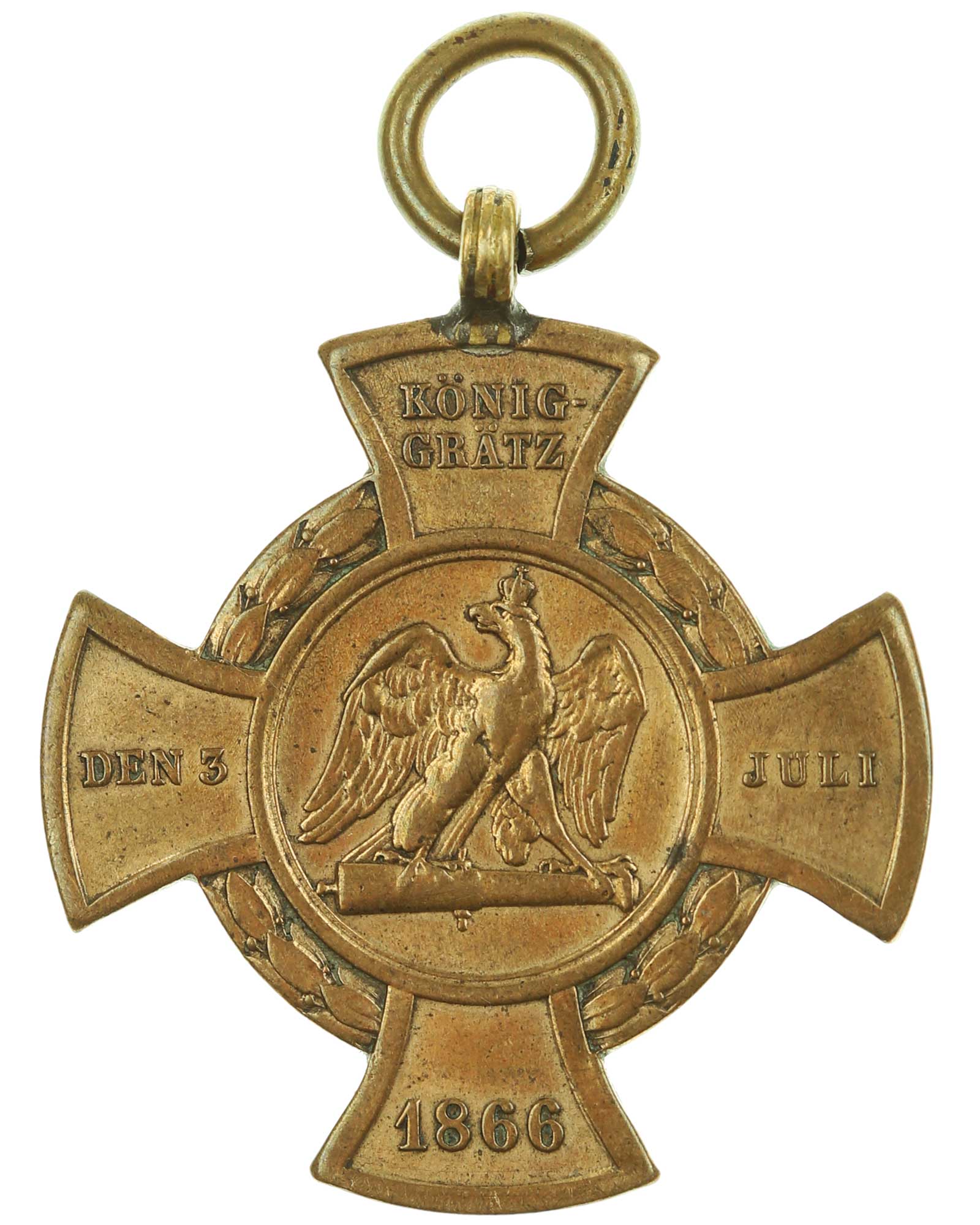 Памятный крест за битву при Кёниггреце (Нем.: Erinnerungskreuz "Königgrätz 1866"), надпись "PREUSSENS SIEGREICHEM HEERE" и "GOTT WAR MIT UNS IHM SEI DIE EHRE". Общий вес 13 г. Размер: 34,45 мм.