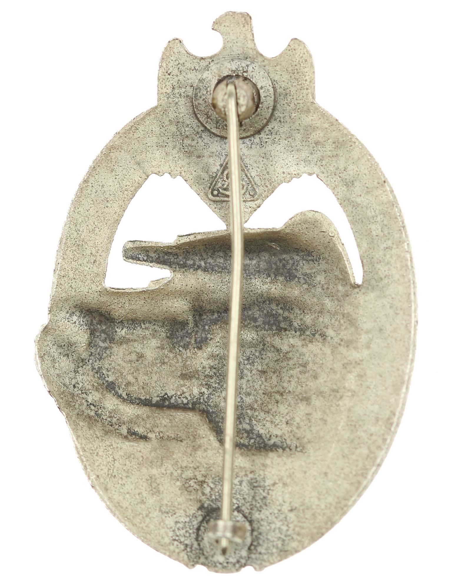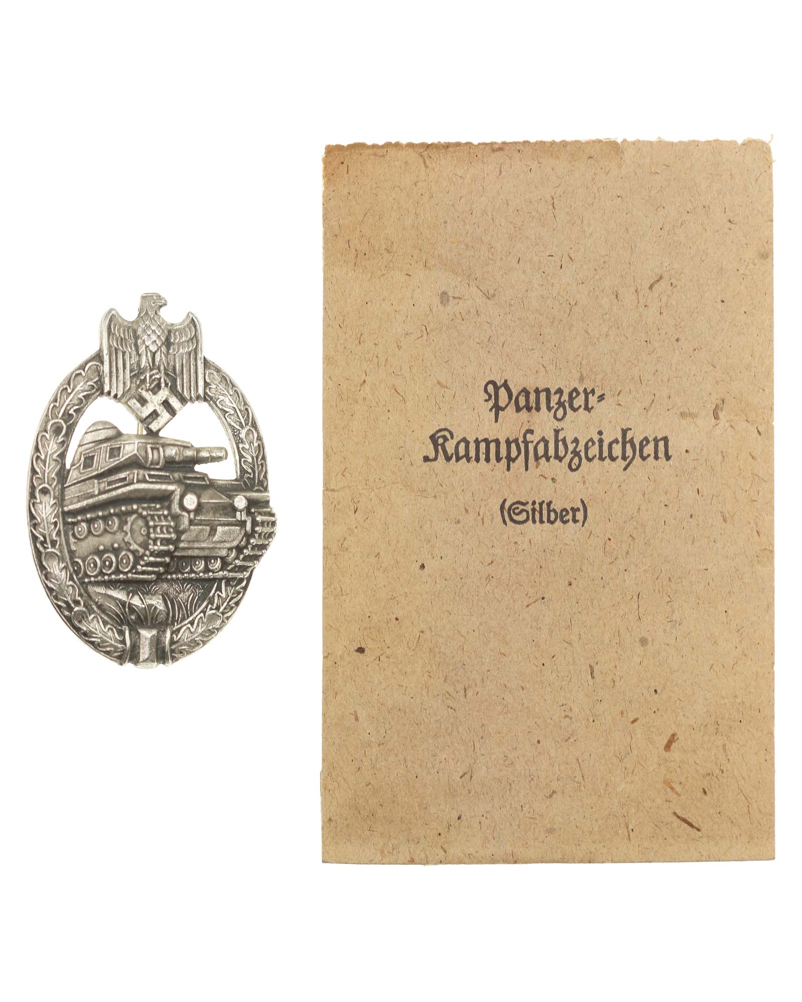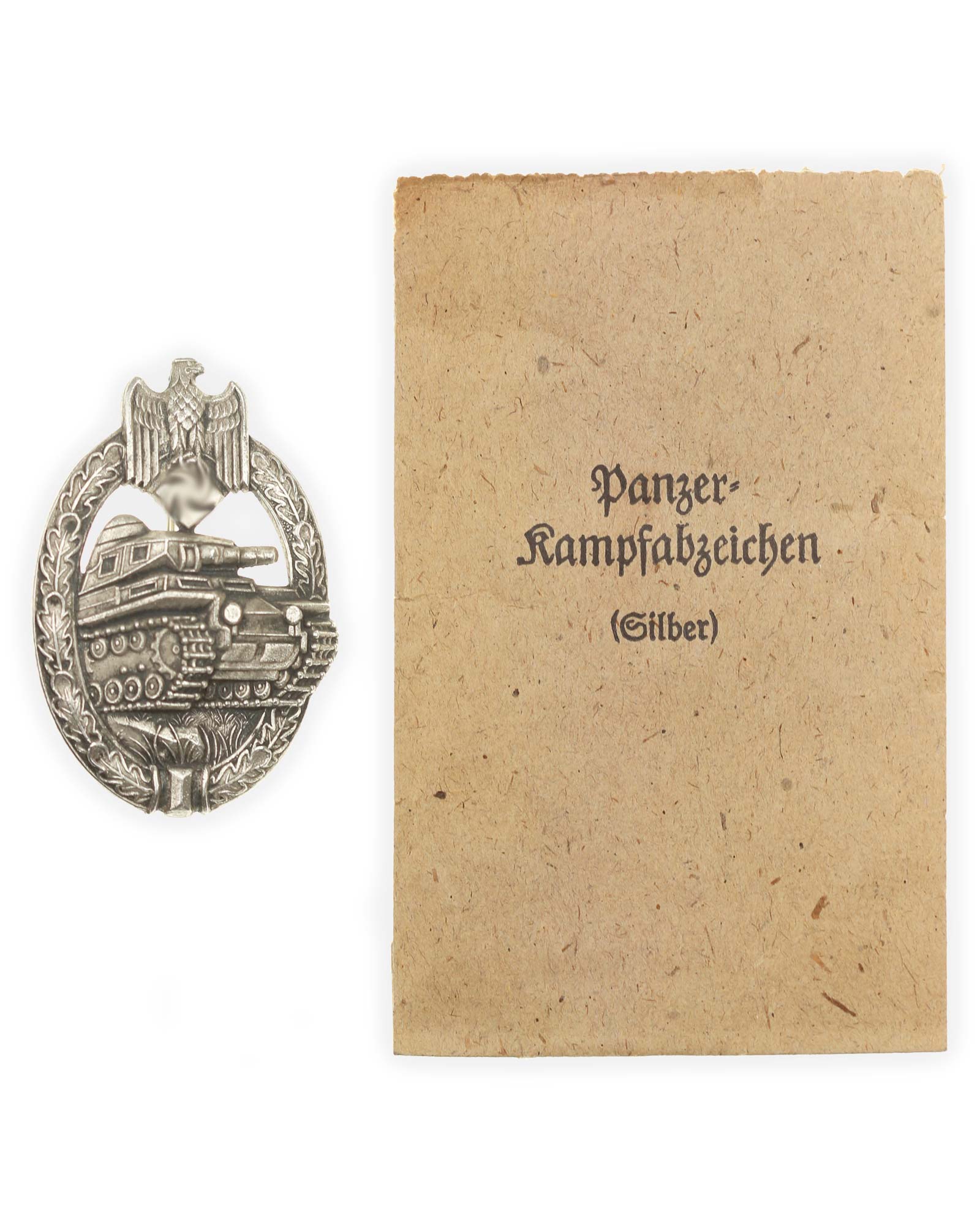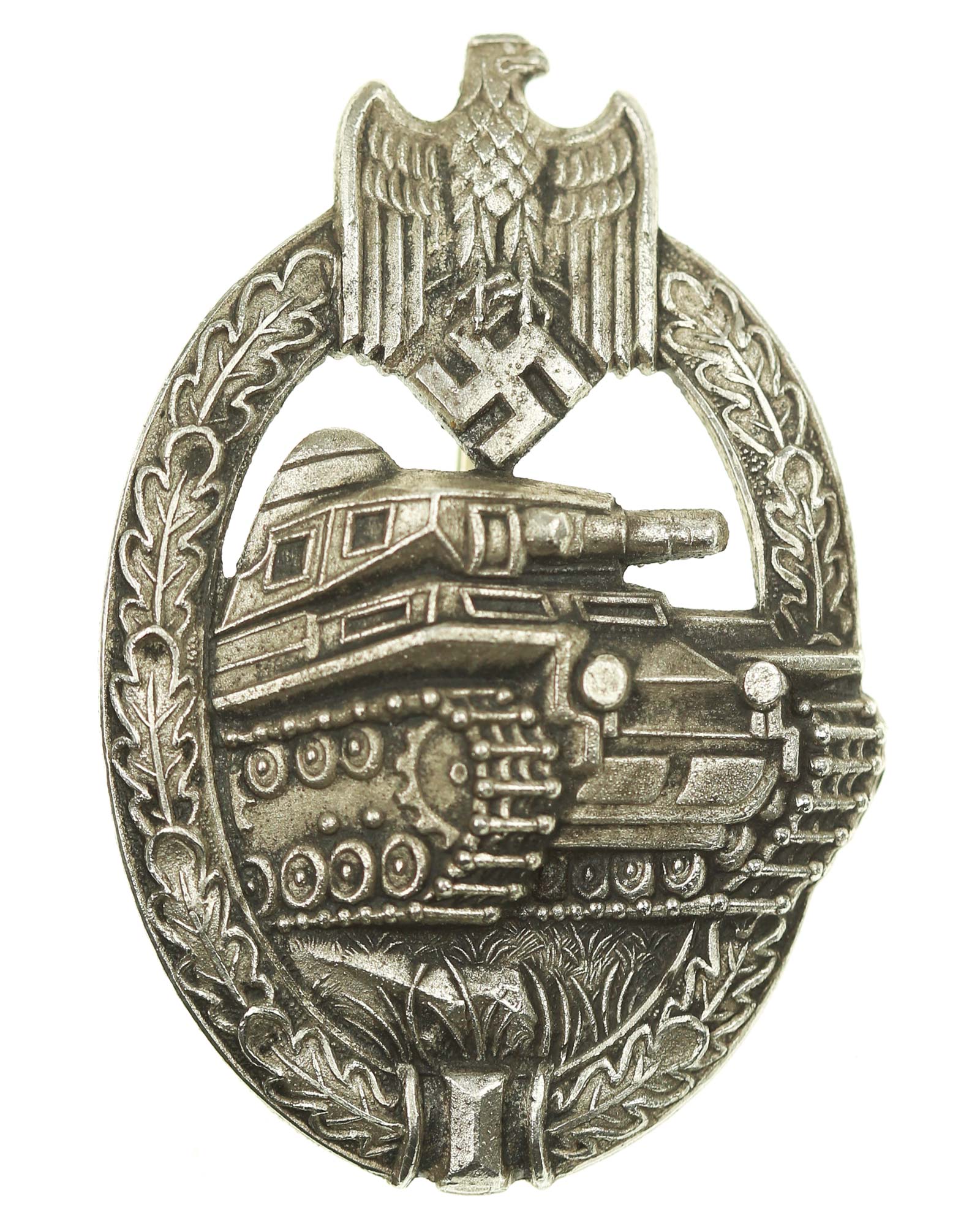 Знак «За танковые атаки» в серебре. Чистый цинк, клеймо производителя A.S., производитель 95, Адольф Шольце, Грюнвальд, в соответствующем наградном мешочке. Общий вес 21 г. Размеры: 42,25 х 62,31 мм.